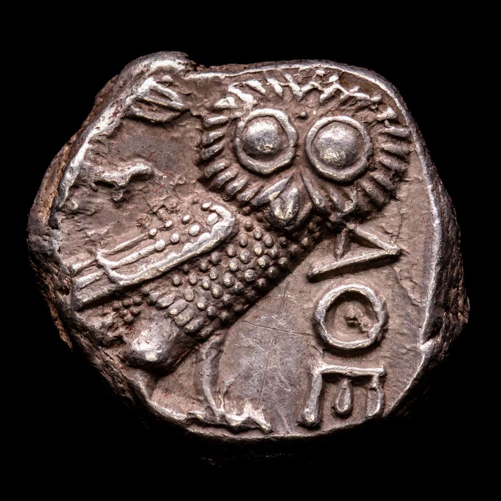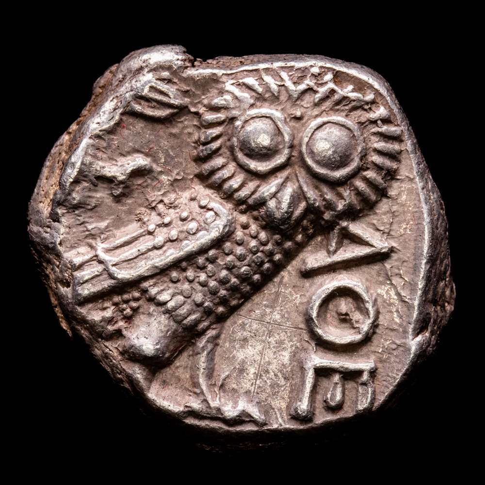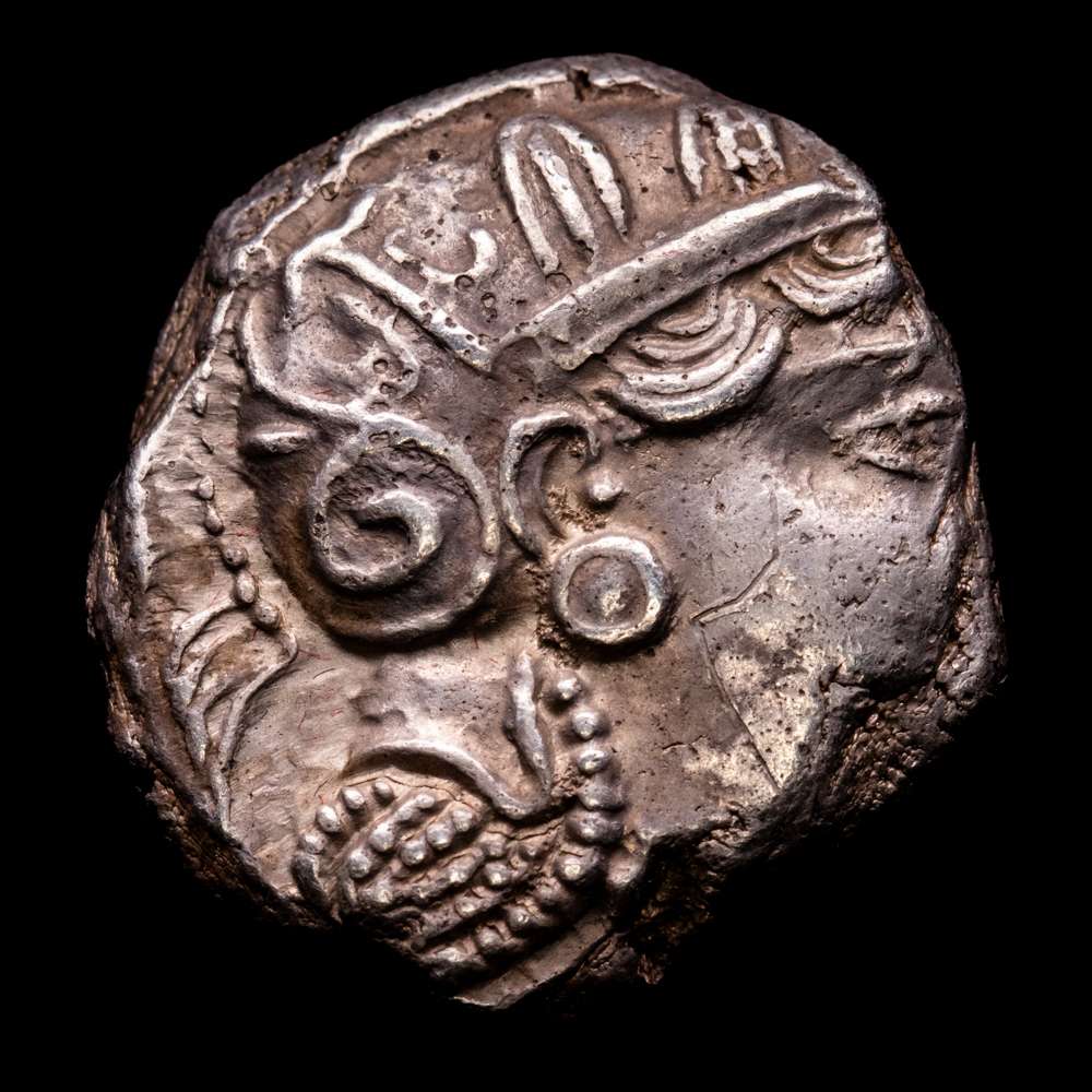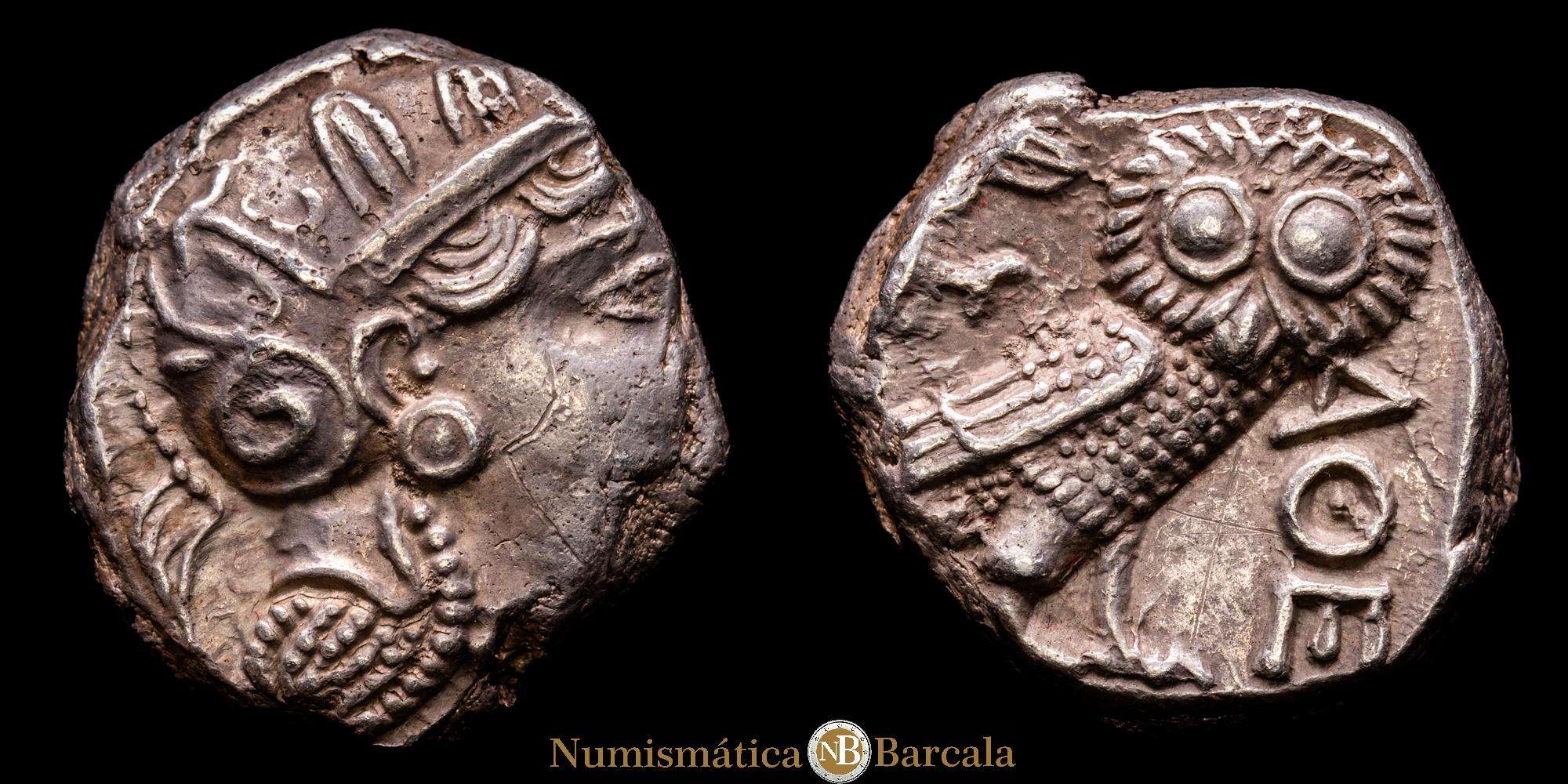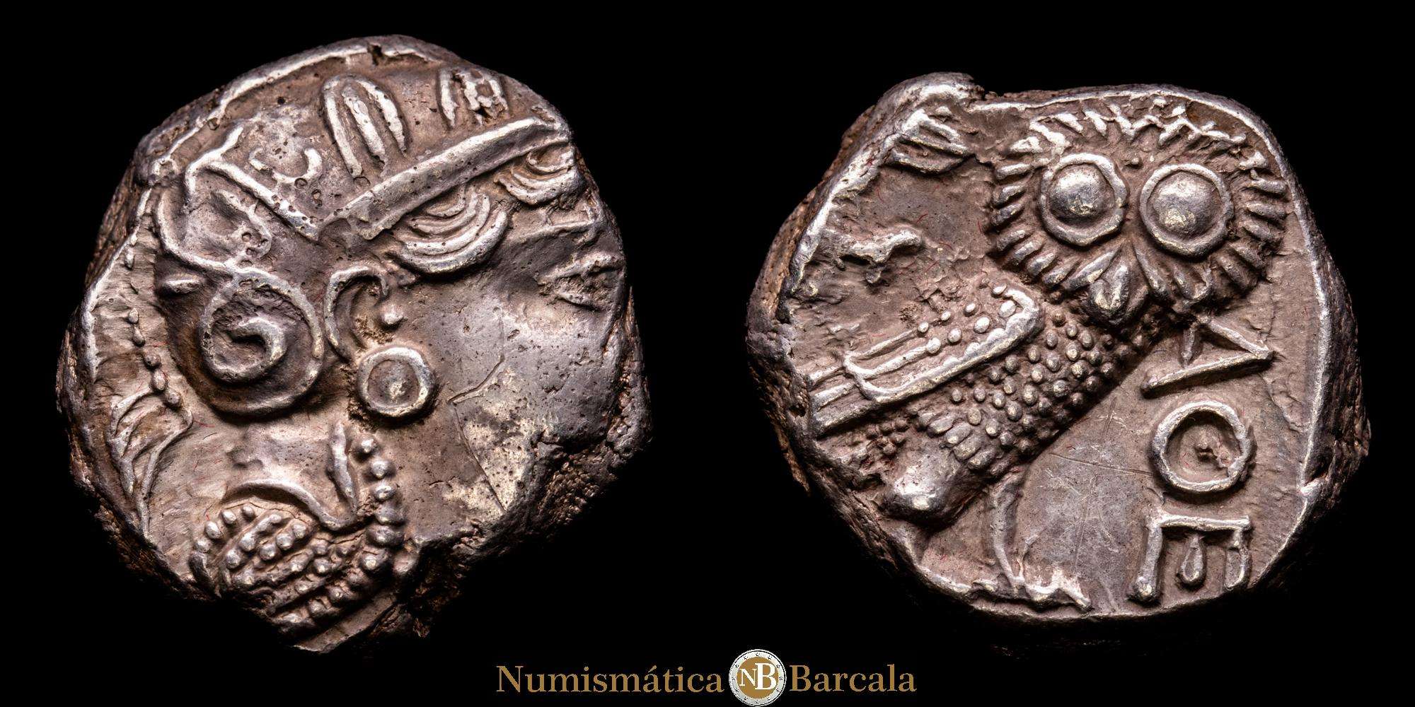 Ática. Atenas. Tetradracma (c. 353-294 a. C.). Anverso: Cabeza de Atenea con casco a la derecha, con el ojo de perfil y palmeta en forma de pi. Reverso: AΘE. Búho de pie a la derecha, de frente; ramita de olivo y media luna a la izquierda. SNG Copenhague 63; HGC 4, 1599. Estado de conservación: Excelente, con algunas marcas. Peso: 17,12 g. Diámetro: 22 mm.