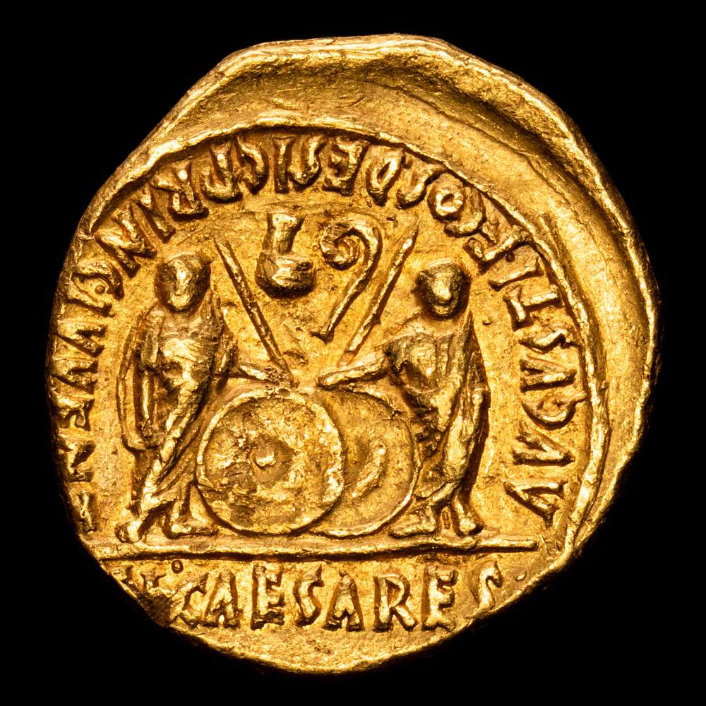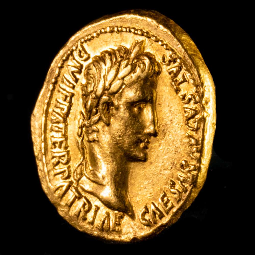 CAESAR AVGVSTVS-DIVI F PATER PATRIAE, cabeza laureada de Augusto a la derecha / AVGVSTI F COS DESIG PRINC IVVENT, Cayo y Lucio César, ambos togados, de pie, uno frente al otro, cada uno apoyando la mano interior sobre un escudo en el suelo con una lanza detrás; simpulum (a la izquierda) y lituus (a la derecha) girados hacia dentro en el campo superior; CL CEESARES en exergo. Calicó 176a. RIC I 206. Un bello ejemplar, con superficies lujosas y sedosas que brillan cuando se giran en la mano. Este áureo muestra los acuerdos de sucesión que Augusto esperaba implementar para el estado romano. Tras la muerte de su sobrino favorito Marcelo, Augusto depositó sus esperanzas de sucesión en los jóvenes Cayo y Lucio César, sus nietos a través de su hija Julia y su íntimo amigo Marco Agripa. Cayo nació en el año 20 a. C. y Lucio tres años después. Augusto los adoptó formalmente a ambos y les dio un avance acelerado en el cursus honorum, o escalafón de cargos públicos. También supervisó cuidadosamente su educación y los exhibió en actos públicos para que se granjearan el cariño del pueblo y del ejército. Hay indicios de que el hecho de que los colmaran de honores y adulación se les subiera a la cabeza, pero la historia nunca sabrá si sus reinados habrían sido superiores al que vino después de Augusto, pues ambos sufrieron finales prematuros. Lucio enfermó durante una visita de Estado a la Galia y murió en Massalia en el año 2 d. C. Dos años más tarde, Cayo sufrió una herida durante una escaramuza con los partos en la frontera oriental y murió en Licia. Augusto quedó devastado y pasó el resto de su reinado hundido en la depresión. Sus muertes despejaron el camino para Tiberio, el severo yerno de Augusto a través de su esposa Livia, y abundaron los rumores de que ella había conspirado de alguna manera para las muertes de Cayo y Lucio, y posiblemente también para la de Marcelo, pero las circunstancias dispares de sus muertes dejan pocas dudas sobre la inocencia de Livia.