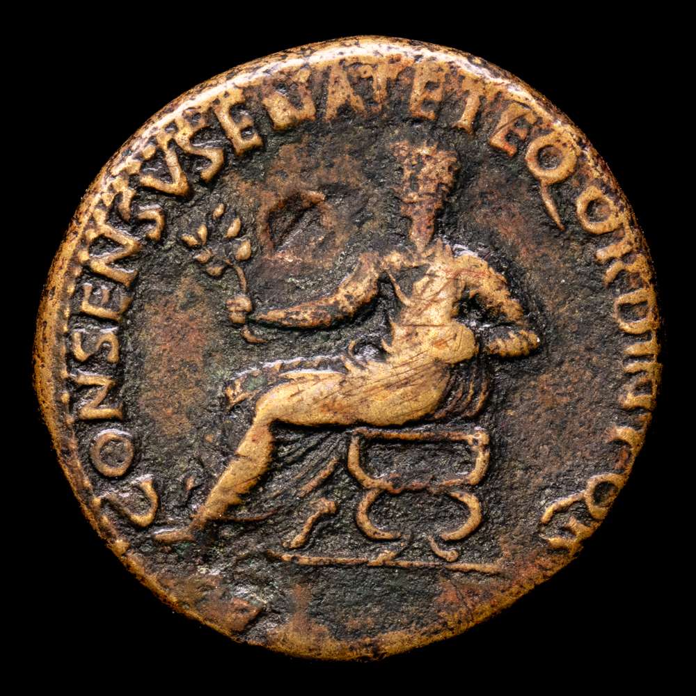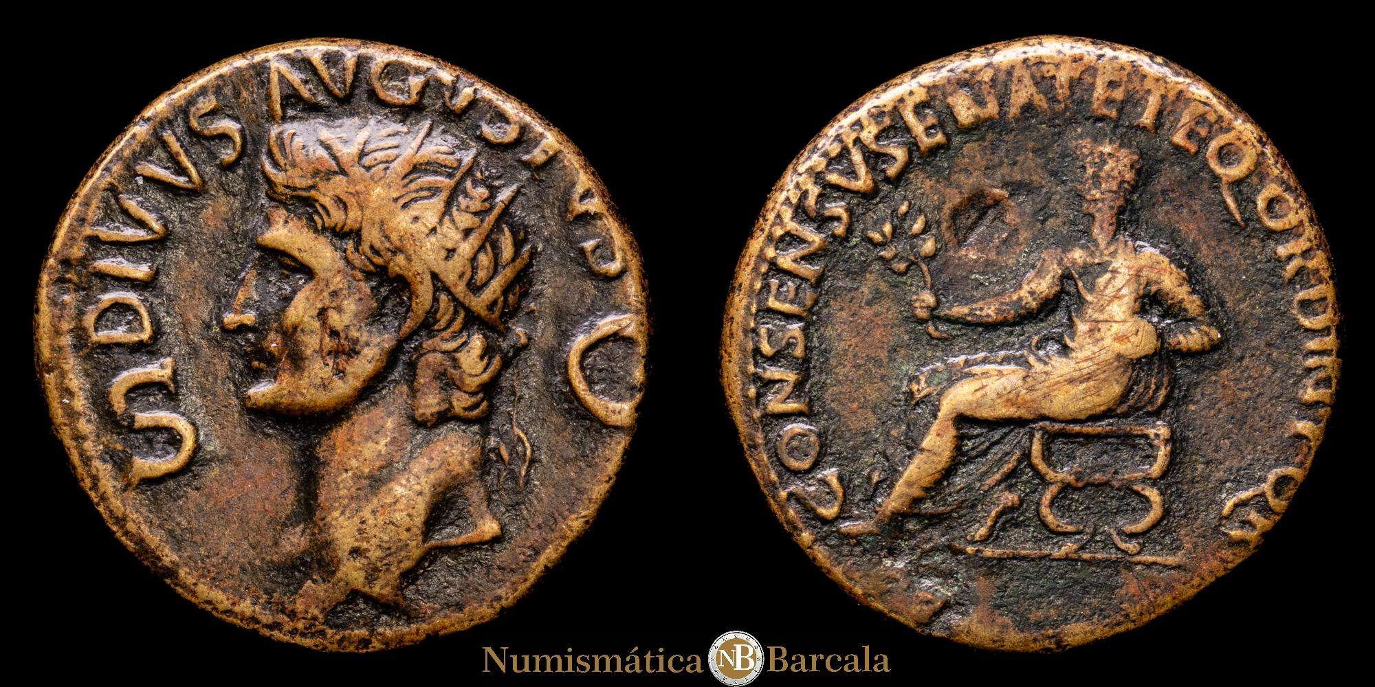 Augusto. Dupondio. 37-41 dC (Ric-I 56 (Cayo)). Anv.: DIVVS AVGVSTVS. Cabeza radiada a izquierda; en campo S – C. Rev.: CONSENSV-SENAT-ET-EQ-ORDIN-PQR- Augusto (?), laureado y togado, sentado a la izquierda en silla curul, sosteniendo una rama. Ae. 13,22 gramos. Escasa. VF. Bonito y expresivo retrato.