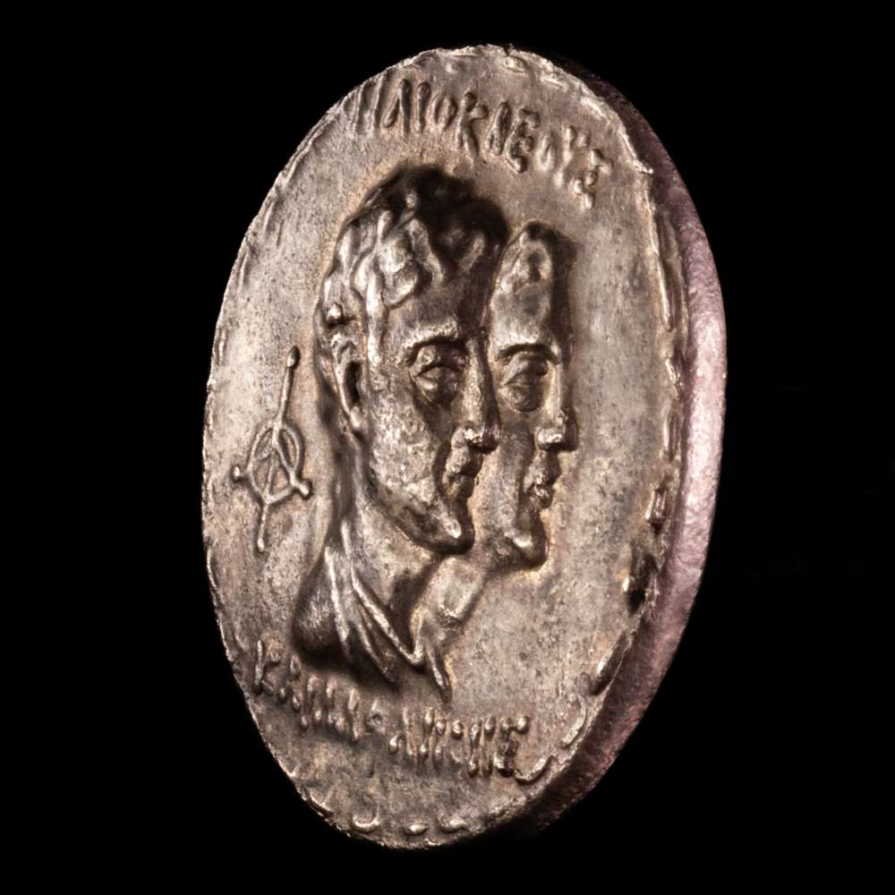Este es uno de los raros ejemplares que se encuentran solo en esta serie de monedas griegas, y muestra a los padres del rey de perfil. Magnífica, con algunos matices. EF