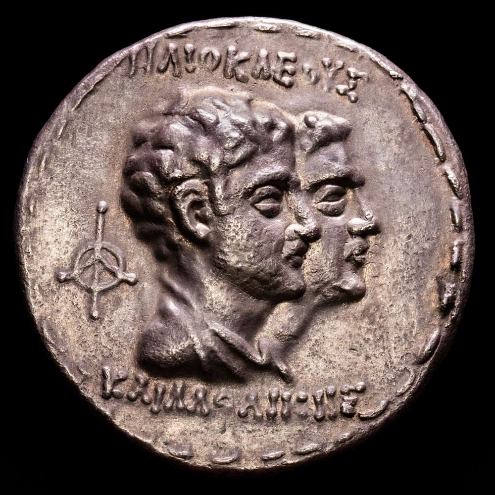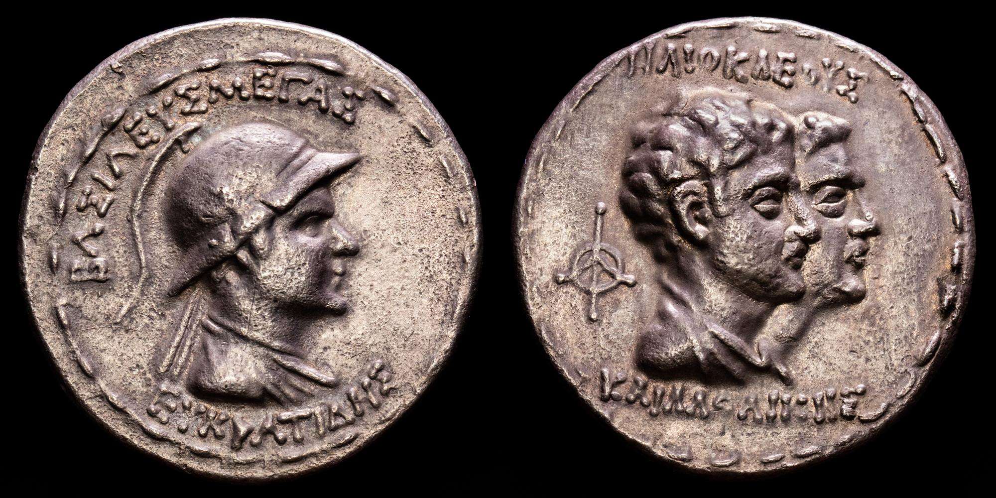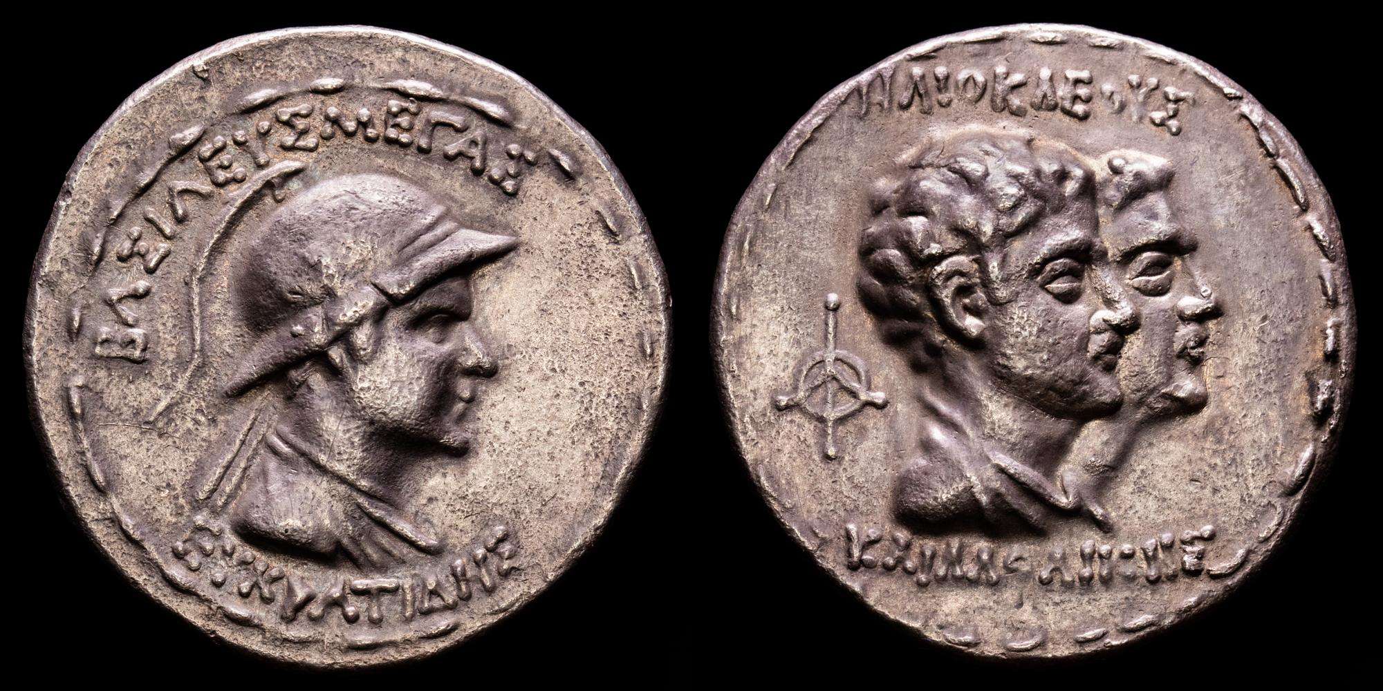 Anv.: Busto de Eucratides a la derecha, con yelmo adornado con cuerno y oreja de toro; todo dentro de un borde de cuentas y carretes. Rx: HΛIOKΛEOYΣ arriba, KAI ΛAOΔIKHΣ en el exergo; bustos yugados y drapeados de Heliocles y Laodike a la derecha, monograma detrás; todo dentro de un borde de cuentas y carretes. Emisión dinástica muy escasa.