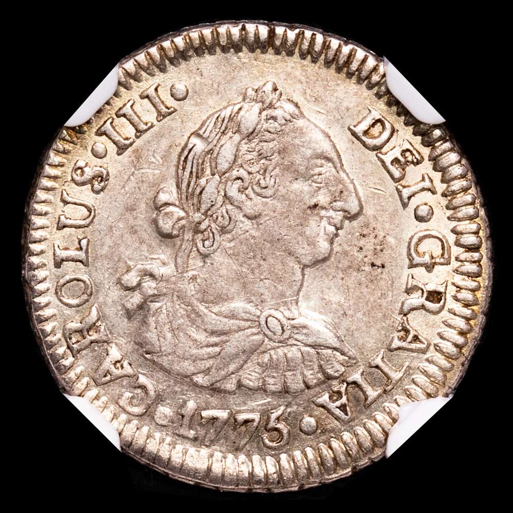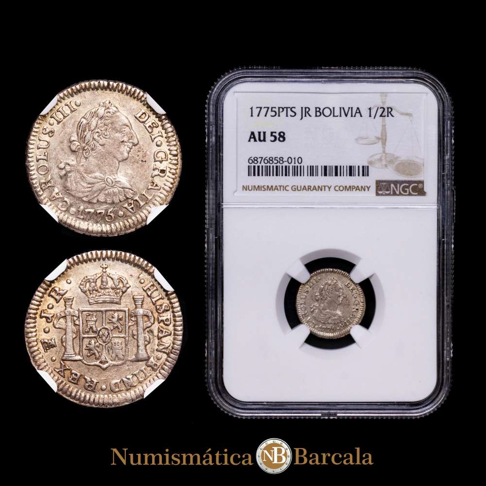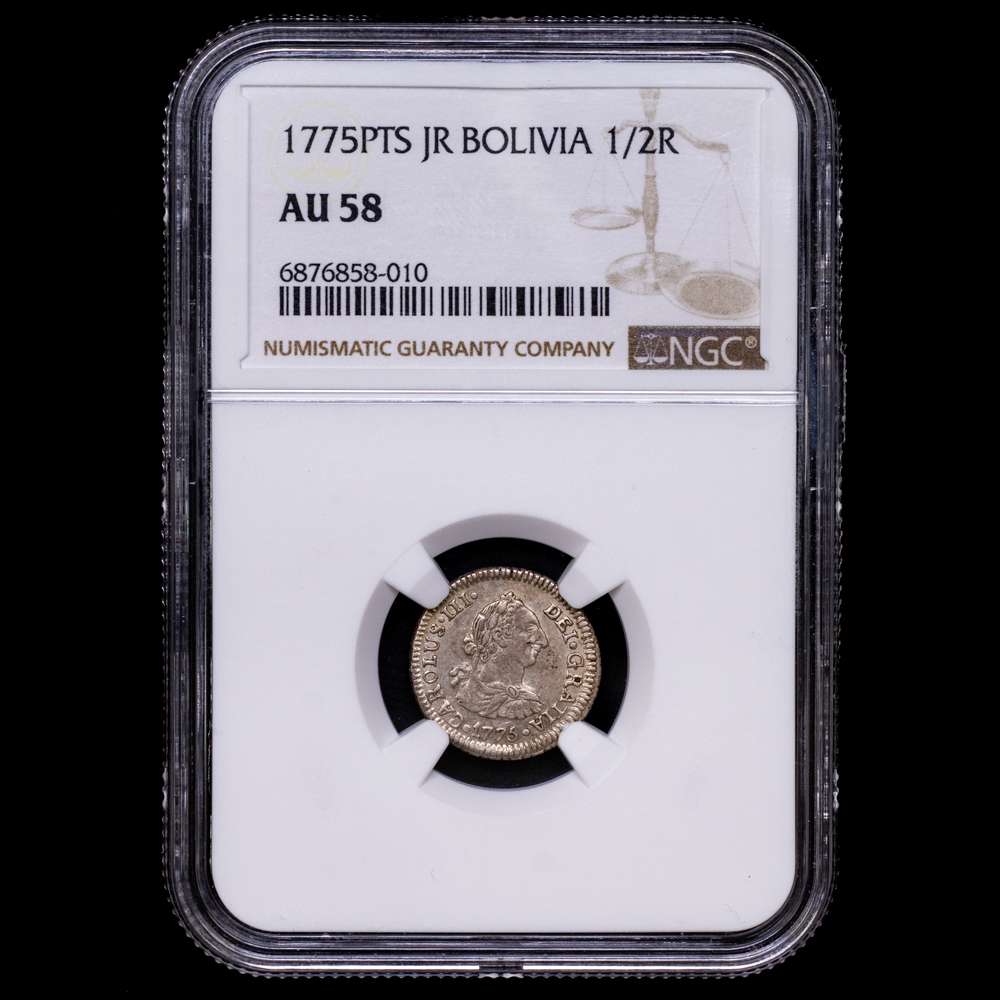 BOLIVIA, Carlos III, busto de 1/2 real, 1775 JR, Potosí, Encapsulado por NGC como AU 58, “Top Pop” en el censo de NGC.