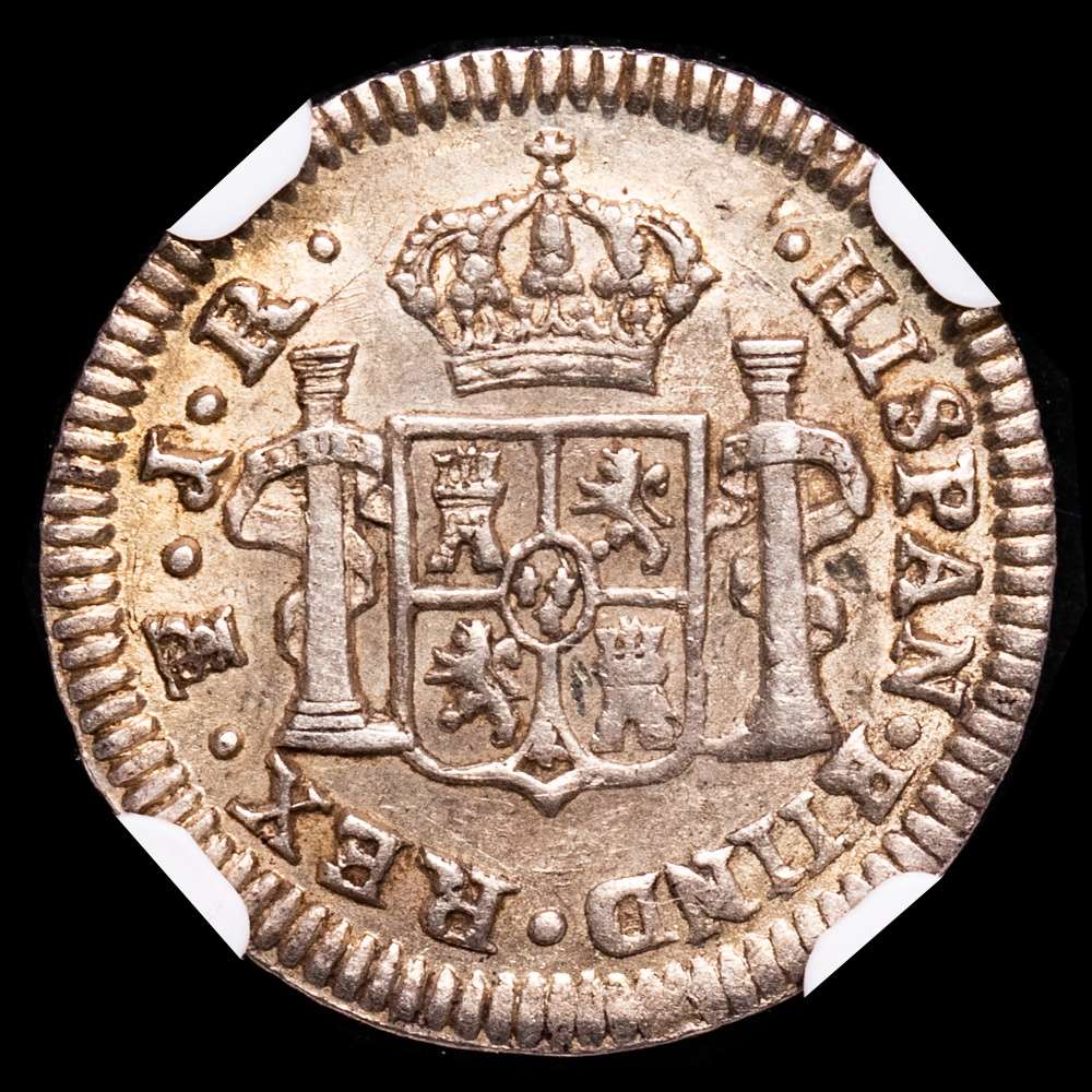 Janson-66.3.1; KM-52; Cal-474. Acuñación nítida con bordes fuertes y completos, tono claro sobre brillo tenue (más oscuro alrededor de los detalles en el reverso), grado raro, empatado con otro como el mejor en el censo de NGC.