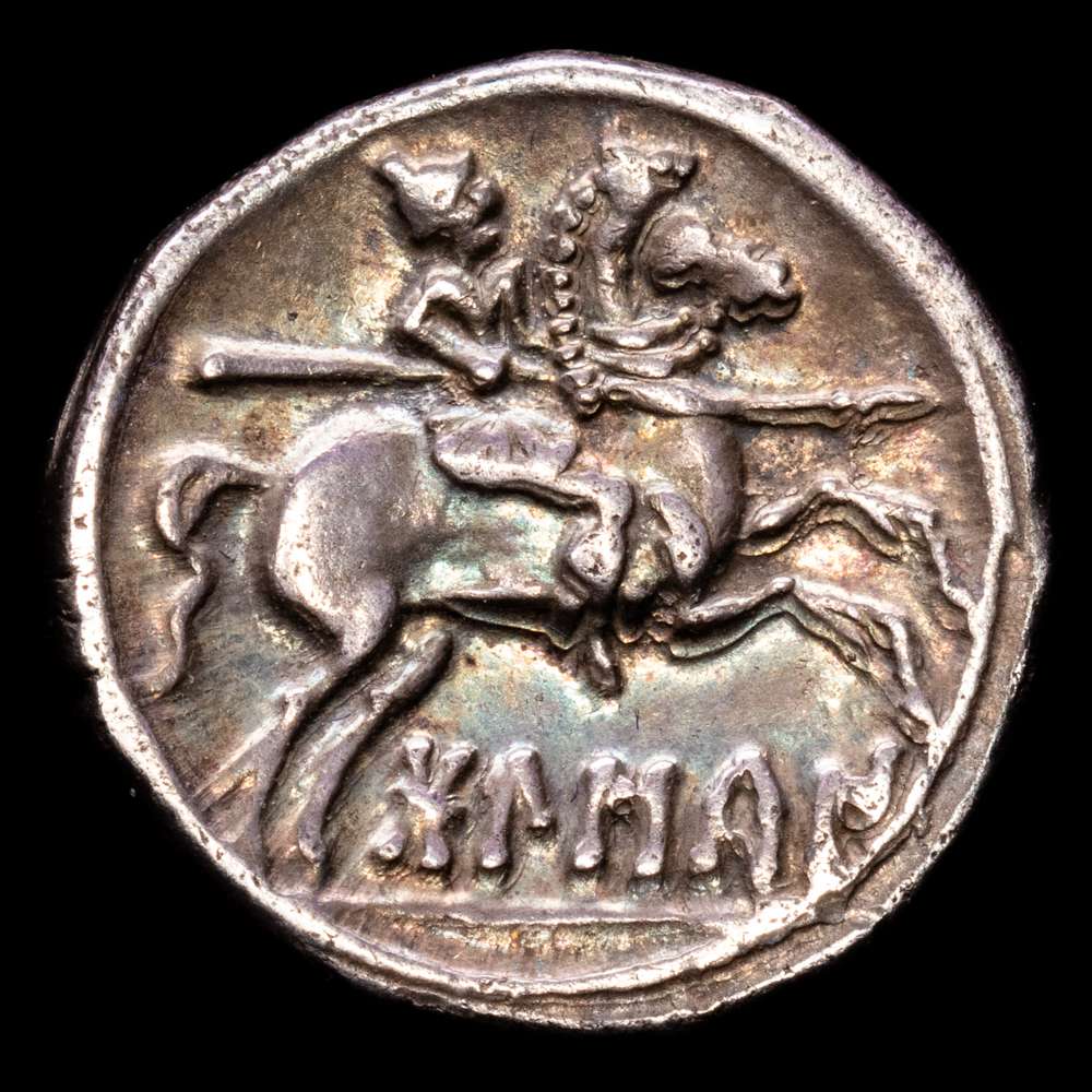 Bolskan. Denario. 180-20 a.C. Huesca. Vives (37) 43-2. CNH 212-13. ACIP 1417. 4,33 g. Eje 12 h. MBC+/EBC. Anv.: Cabeza barbada a derecha, letras ibéricas BON. Rev.: Jinete con lanza a derecha, debajo leyenda ibérica curva BOLSKAN. Precioso tono iridiscente de monetario. Atractivo ejemplar.