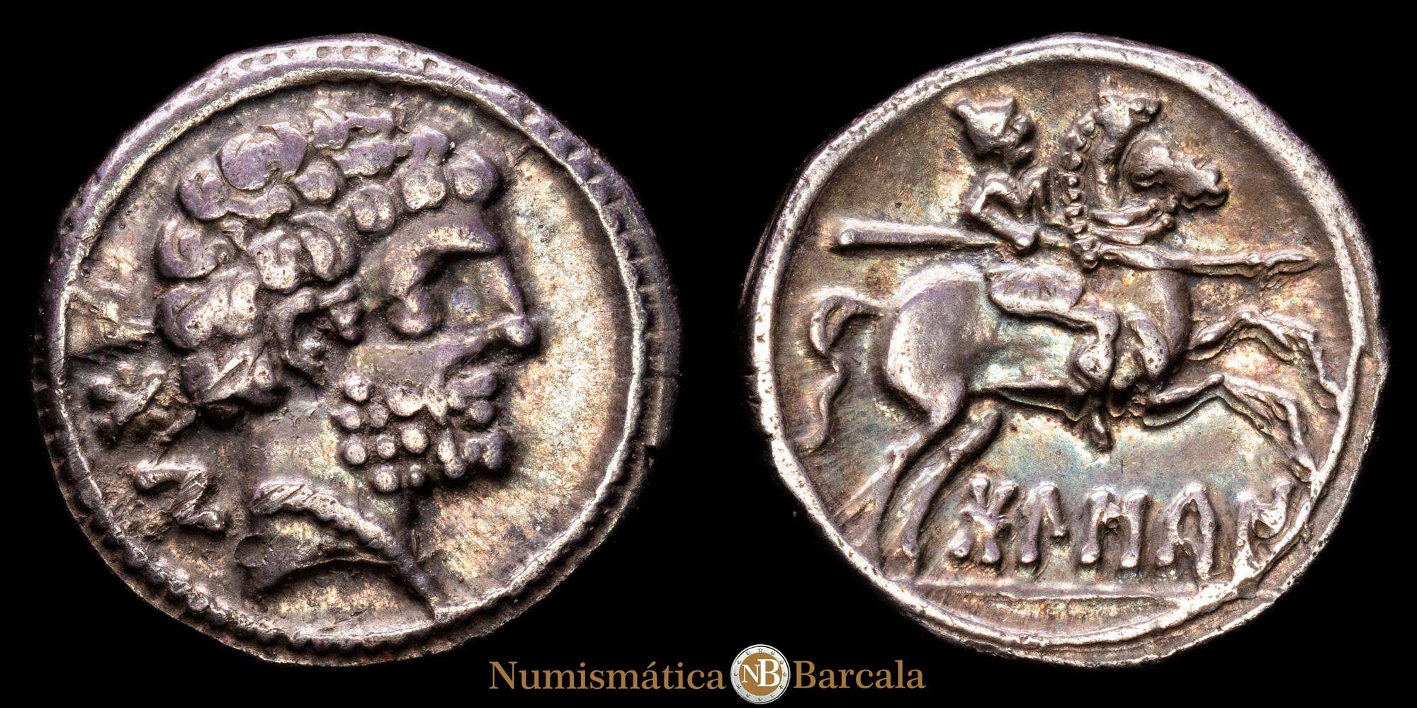 Numismática Barcala > Productos > Bolskan. Denario. 180-20 a.C. Huesca. Vives (37) 43-2. CNH 212-13. ACIP 1417. 4,33 g. Eje 12 h. MBC+/EBC. Precioso tono iridiscente de monetario. Atractivo ejemplar.