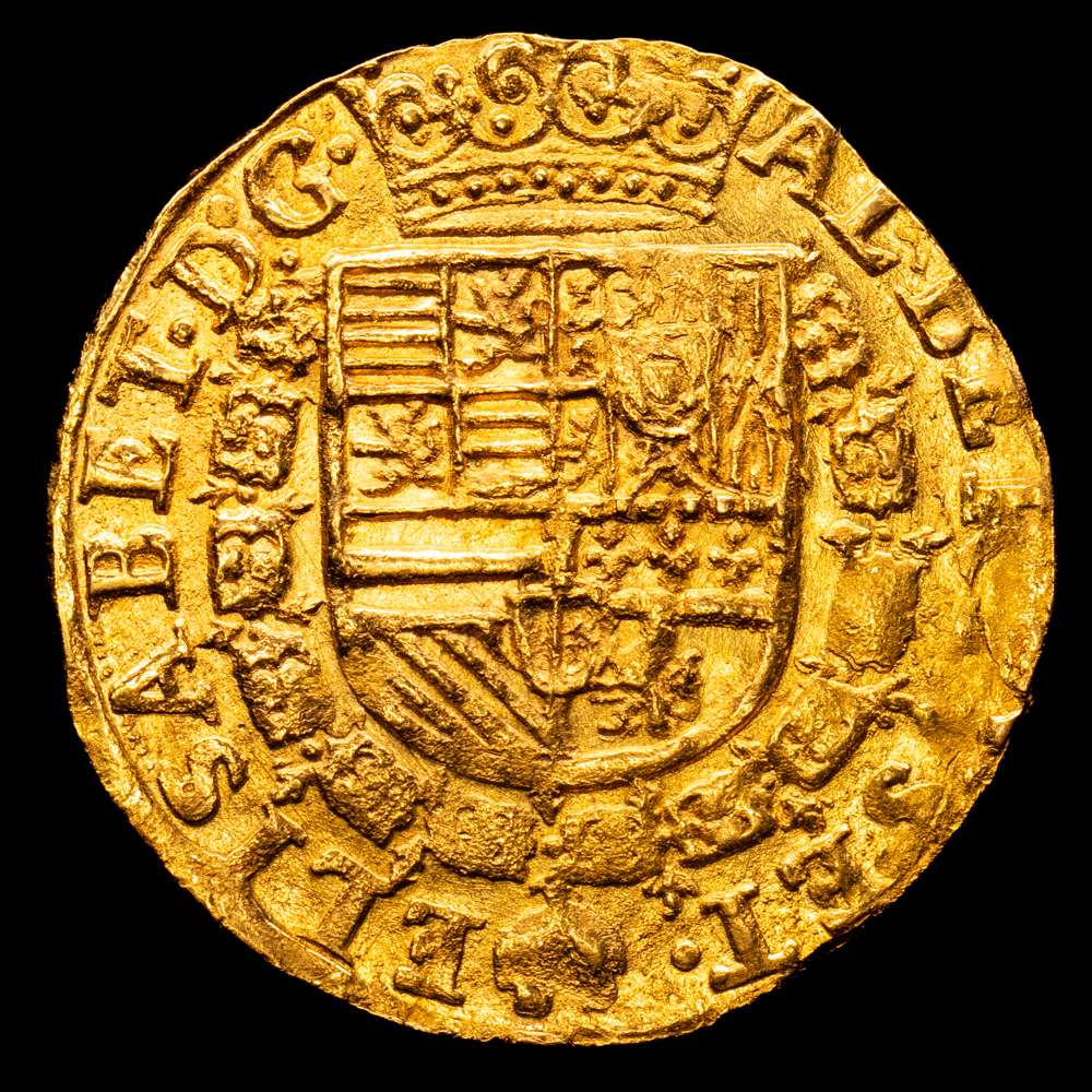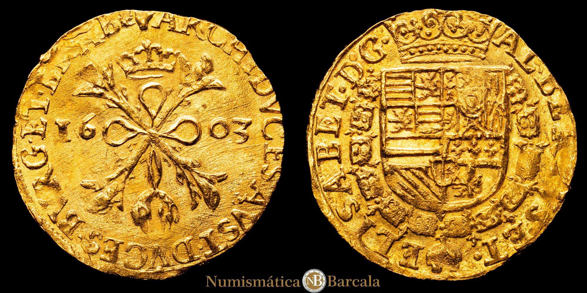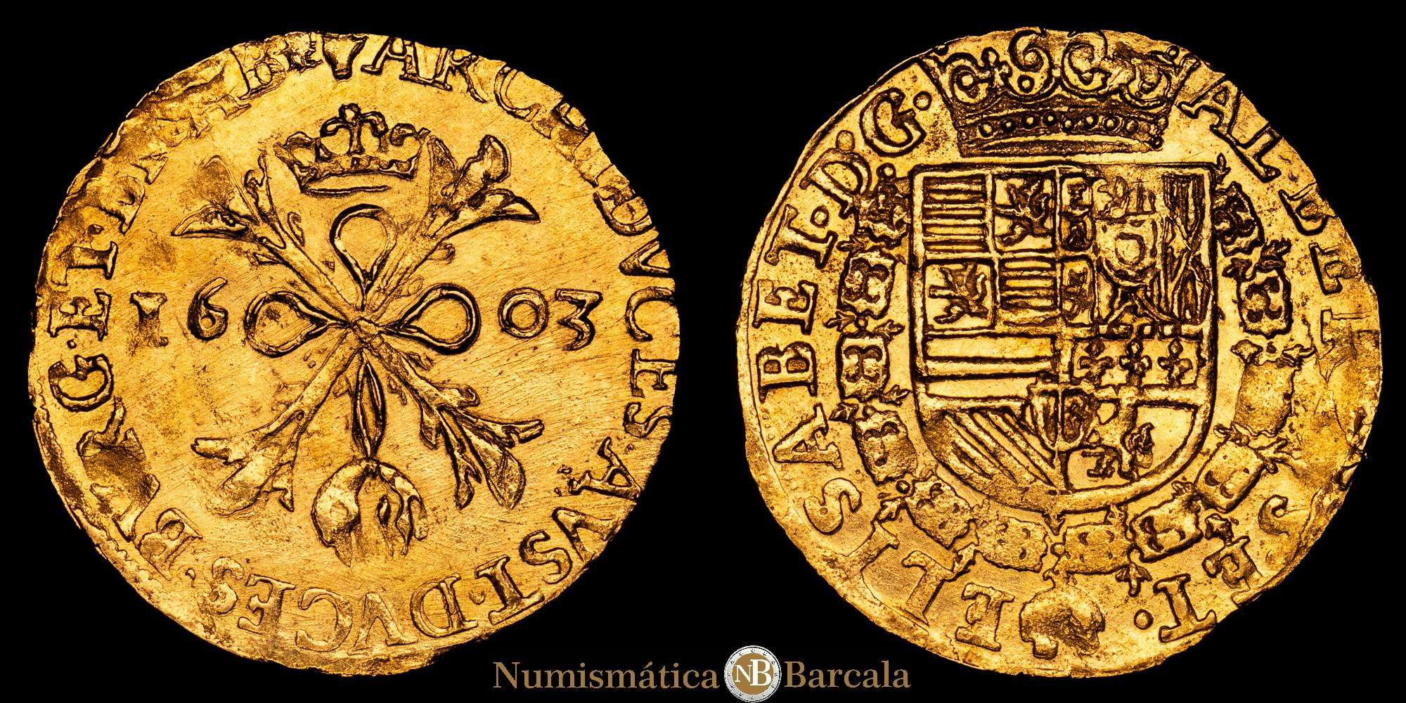 BRABANTE, Ducado, Alberto e Isabel (1598-1621), AV doble Albertina, 1603, Amberes. D/ Escudo coronado, rodeado por el collar del Toisón de Oro. R/ Cruz de Borgoña flanqueada por la fecha, bajo una corona, adornada con la joya del Toisón de Oro. GH 284-1; Delm. 145; W. 892; VH 582. 5,15 gramos. G.P.B.O. EBC+.