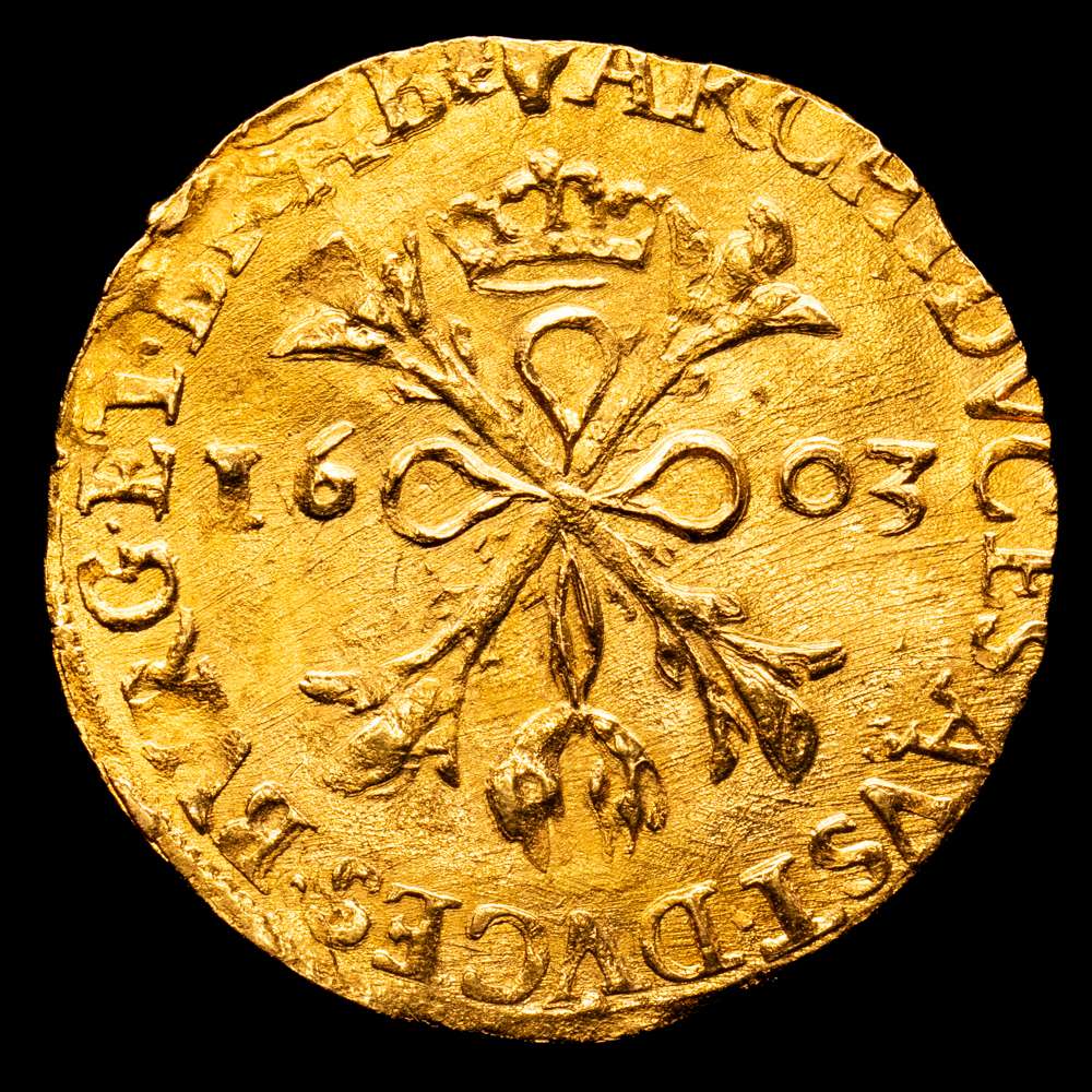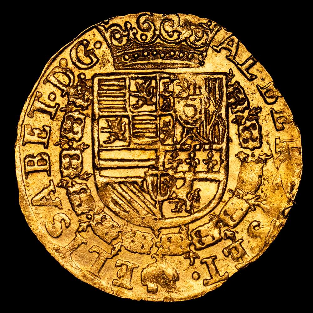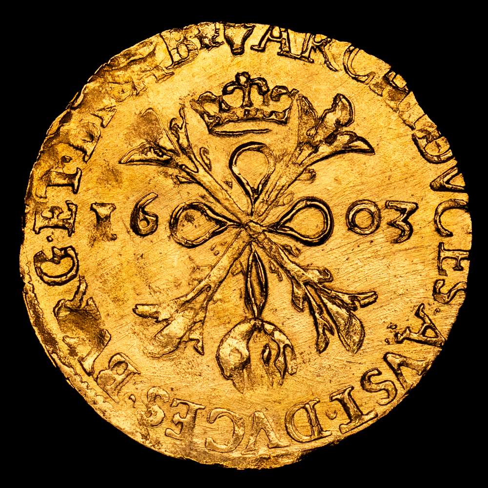 BRABANTE, Ducado, Alberto e Isabel (1598-1621), AV doble Albertina, 1603, Amberes. D/ Escudo coronado, rodeado por el collar del Toisón de Oro. R/ Cruz de Borgoña flanqueada por la fecha, bajo una corona, adornada con la joya del Toisón de Oro. GH 284-1; Delm. 145; W. 892; VH 582. 5,15 gramos. G.P.B.O. EBC+.
