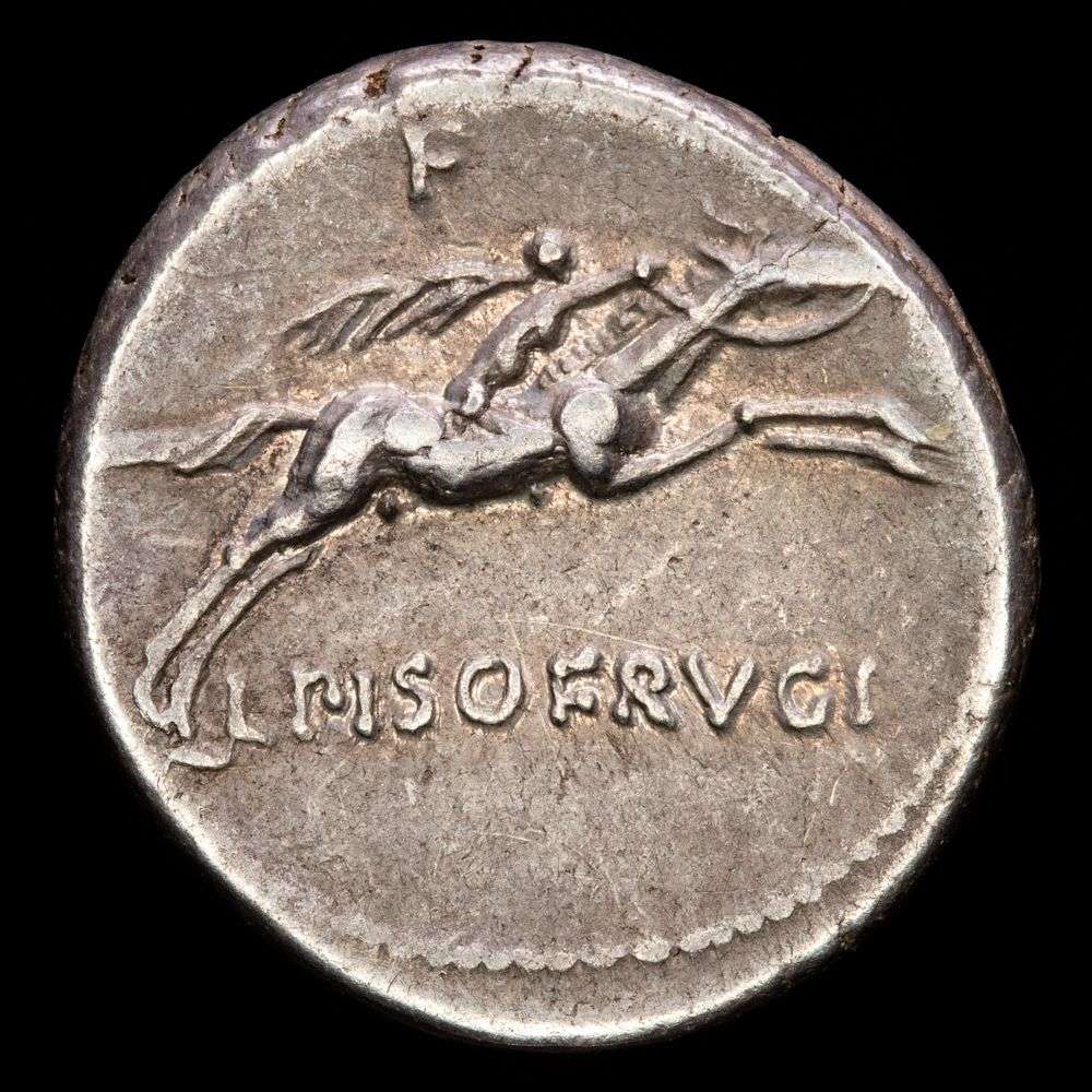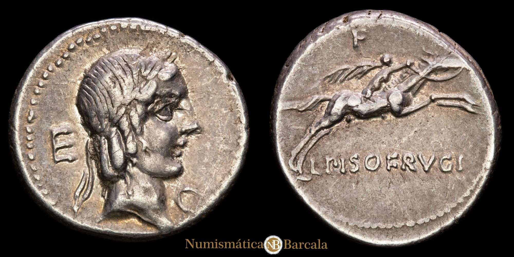 CALPURNIA. L. Calpurnius Piso Frugi. Denario (3,97 g.). Roma, 90-89 a.C. Anv.: Cabeza de Apolo a derecha entre letra E y C. Rev.: Jinete galopando a derecha entre F y L. PISO FRVGI. Cal-311g; FFC-304. MBC+.