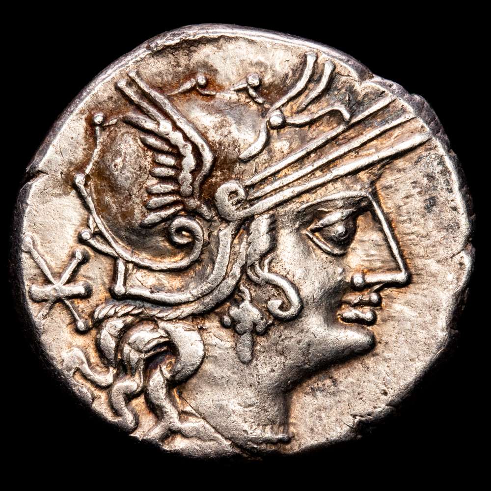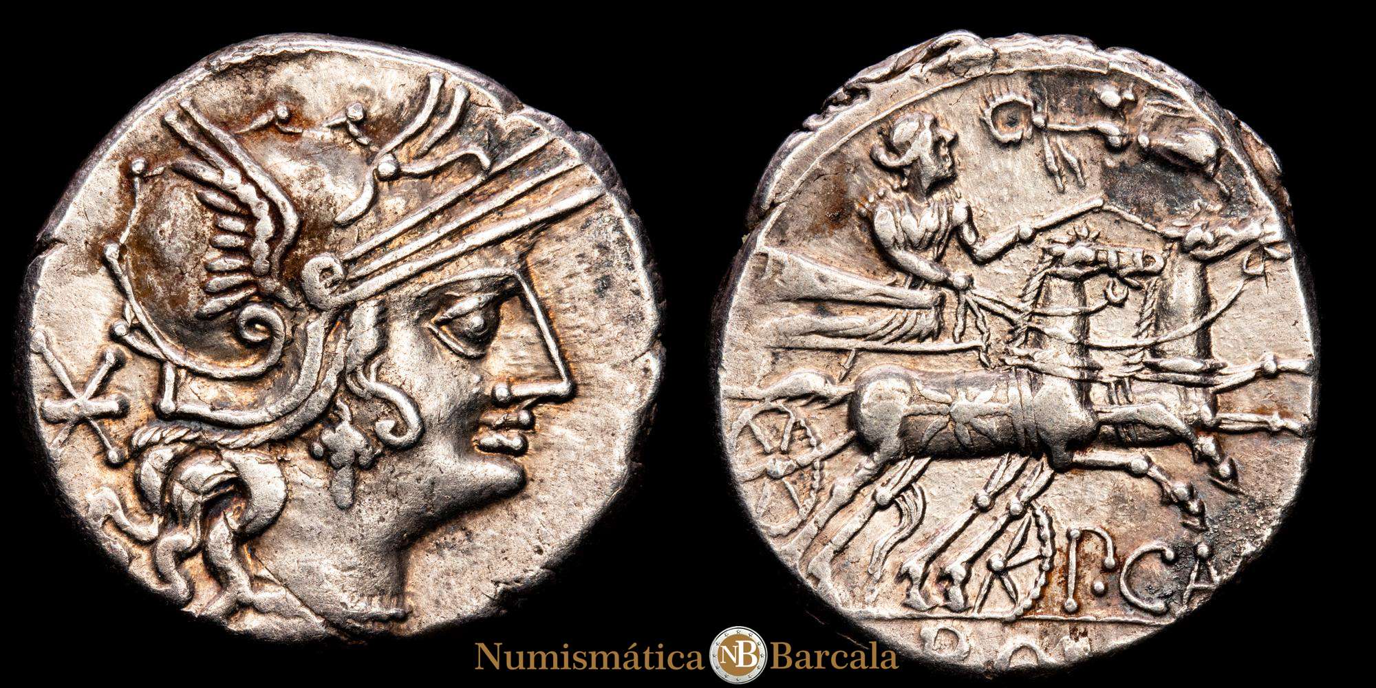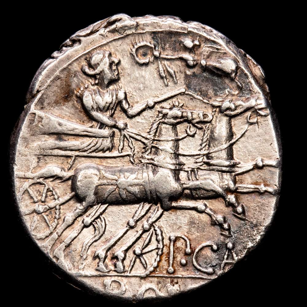 Calpurnia. Publio Calpurnio Lanario. Denario. 133 a. C. Acuñación incierta. (Ffc-225). (Craw-247/1). (Cal-300). Anv.: Cabeza de Roma a derecha, detrás: X. Rev.: Mujer con látigo sobre biga a derecha, es coronada por una Victoria volando a izquierda,debajo: P. CA(LP), en el exergo: ROMA. Ag. 3,93 gramos. EBC-.