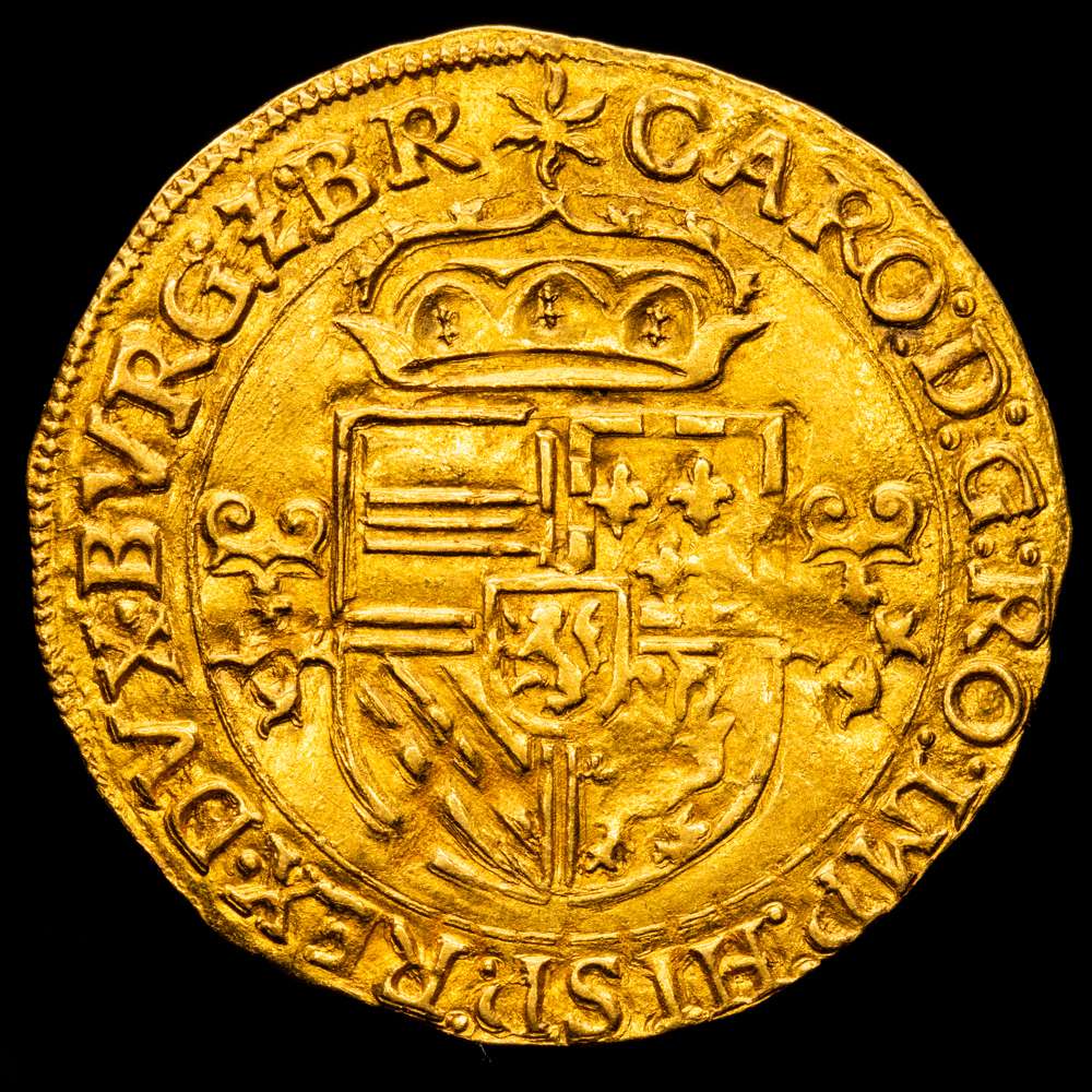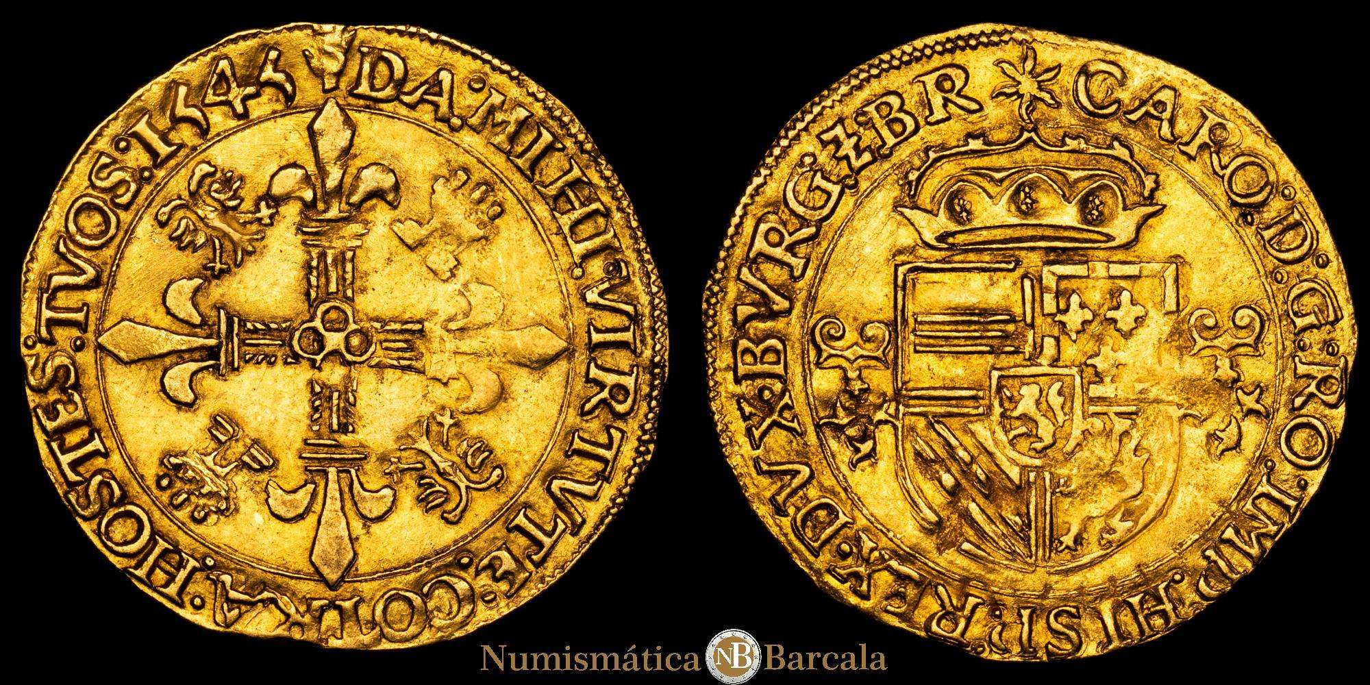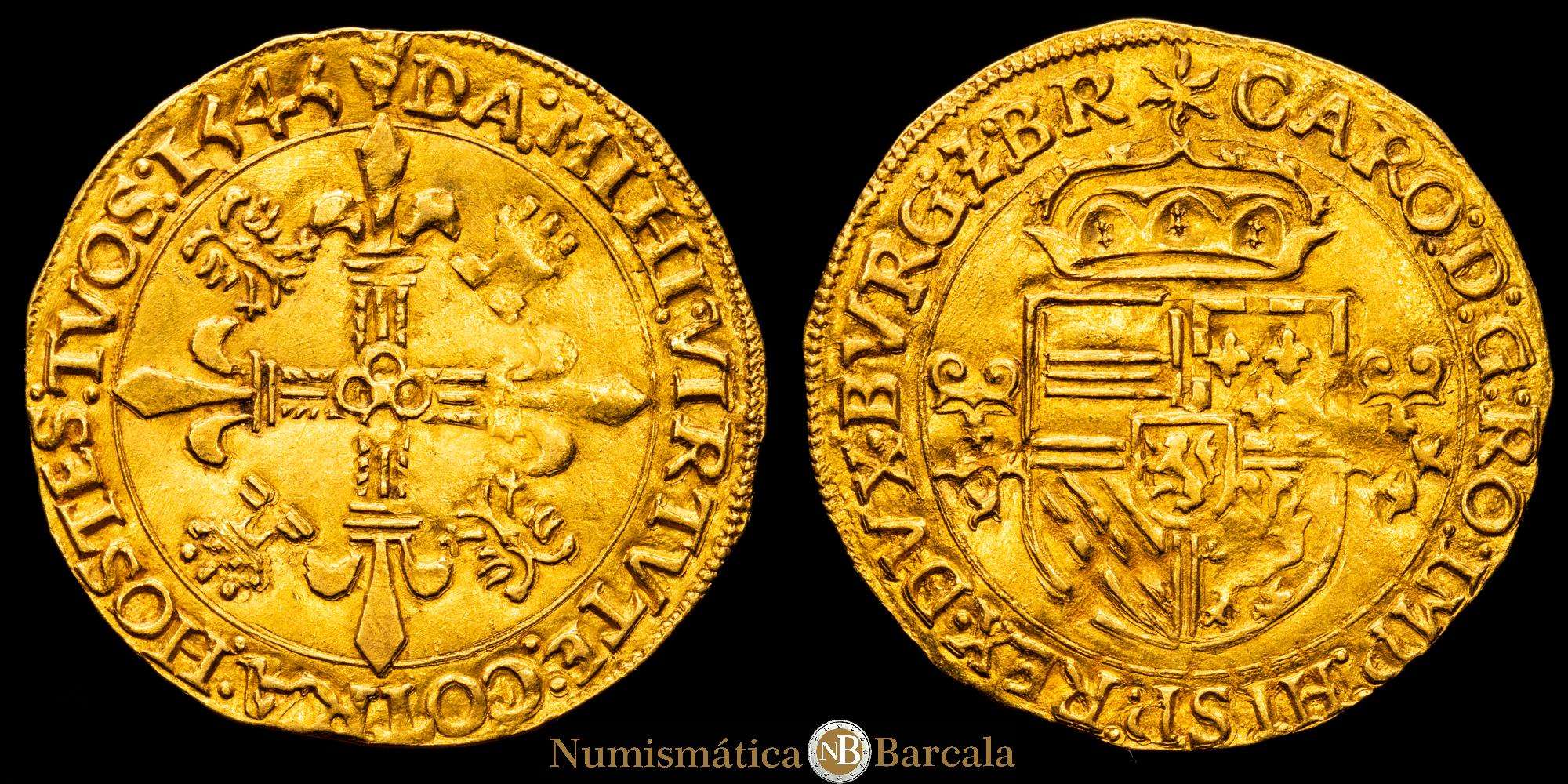 Numismática Barcala > Productos > Carlos I (1516-1556). Corona del sol. 1545. Amberes. (Tauler-143). (Vti-618). (Vanhoudt-223). Au. 3,39 g. Escasa. MBC+.