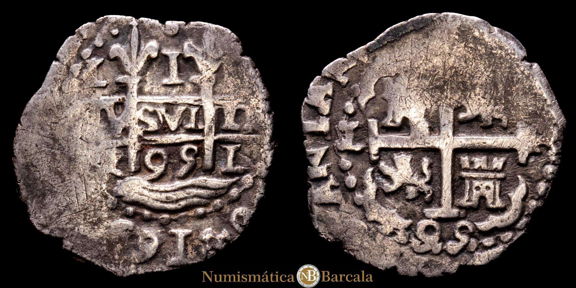 Carlos II (1665-1700). 2 reales. 1692. Lima. V. (Cal-349). Ag. 6,61 g. Doble fecha, una de ellas parcial y doble ensayador. Flan grande. Ligera pátina. Escasa. VF.