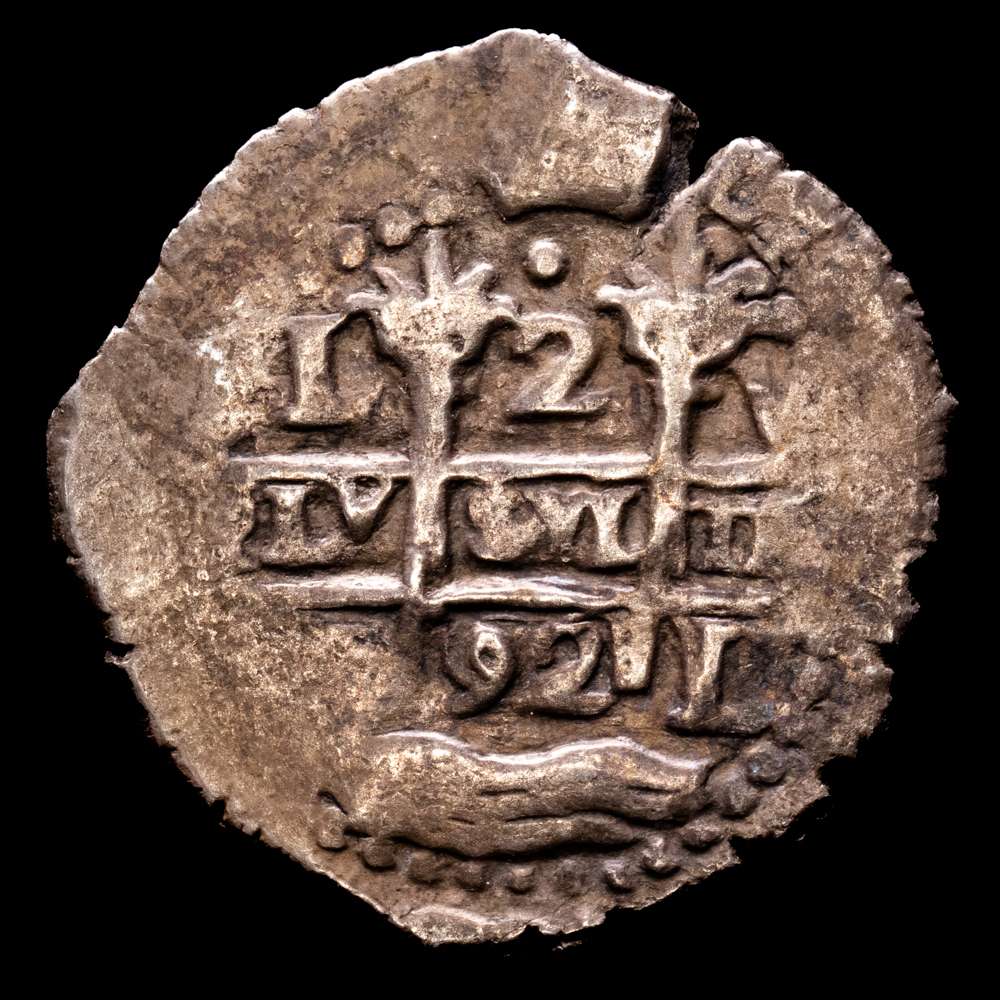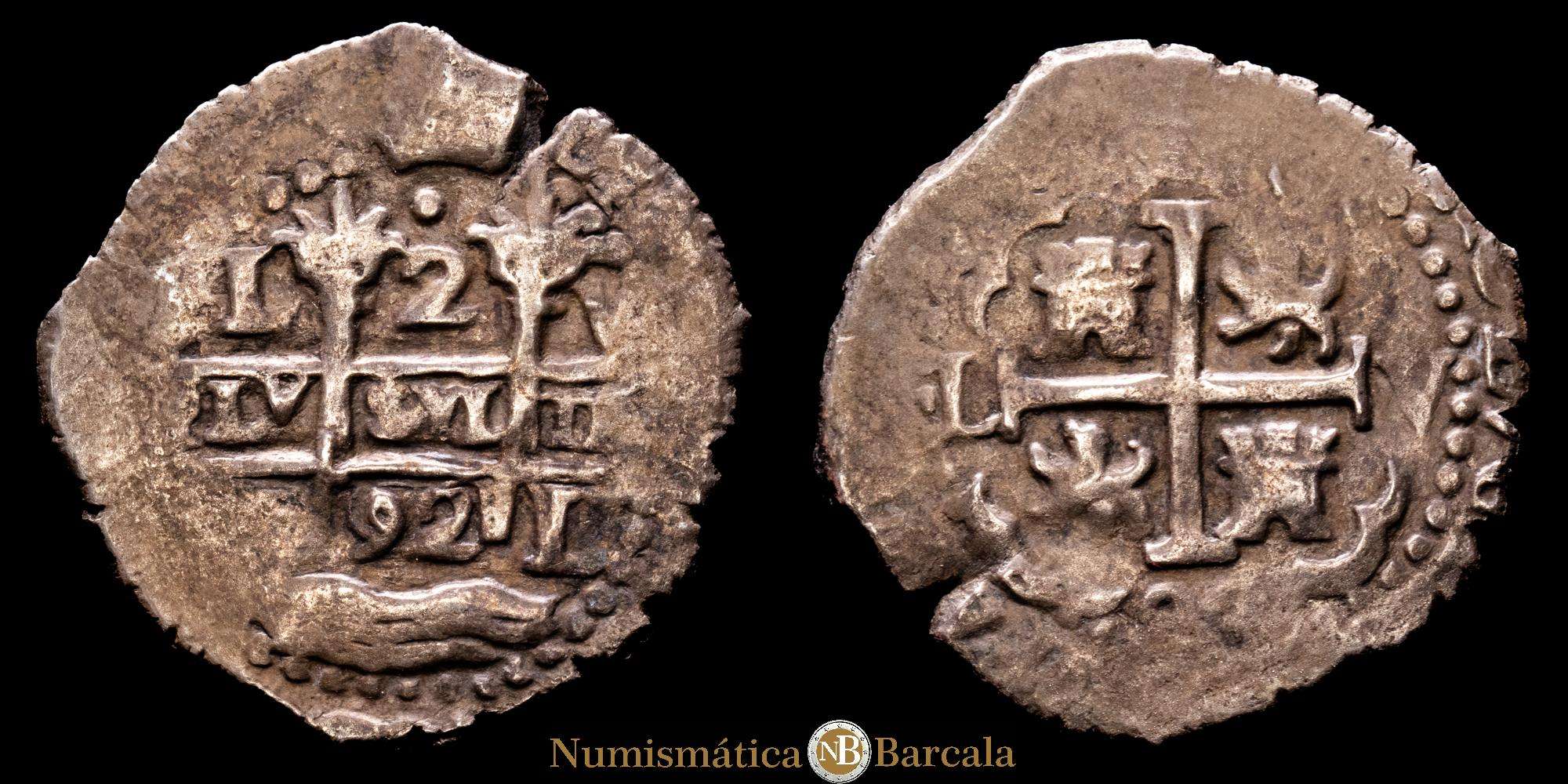 Numismática Barcala > Productos > Carlos II (1665-1700). 2 reales. 1692. Lima. V. (Cal-349). Ag. 6,61 g. Doble fecha, una de ellas parcial y doble ensayador. Flan grande. Ligera pátina. Escasa. VF.
