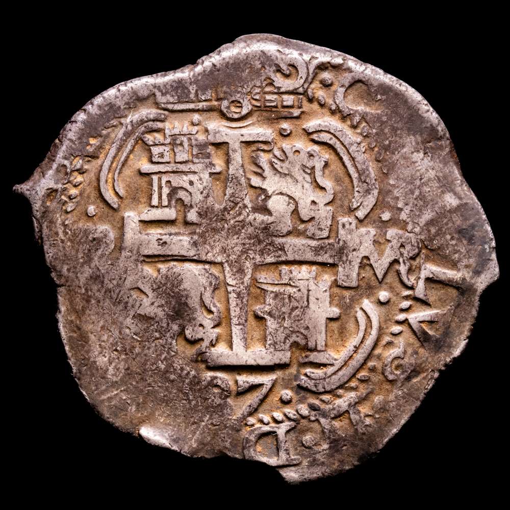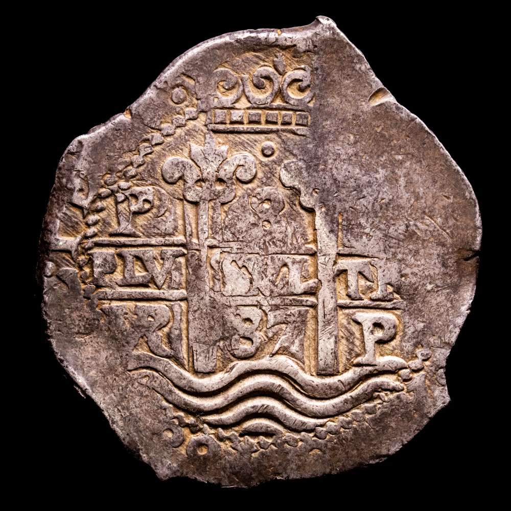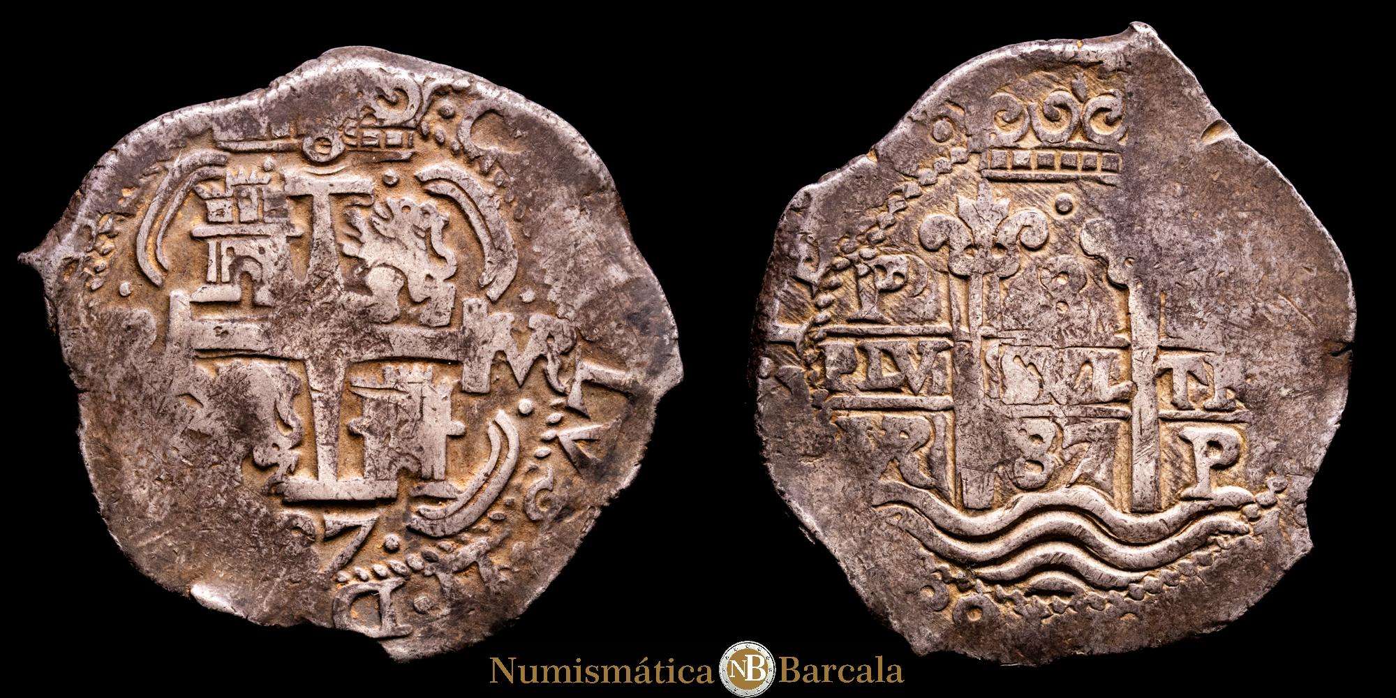 Numismática Barcala > Productos > Carlos II (1665-1700). 8 reales. 1687. Potosí. VR. (Cal-729). Ag. 27,19 g. Triple fecha. Doble ensayador. Parte del nombre del rey visible. Pátina oscura. XF. Muy bella.