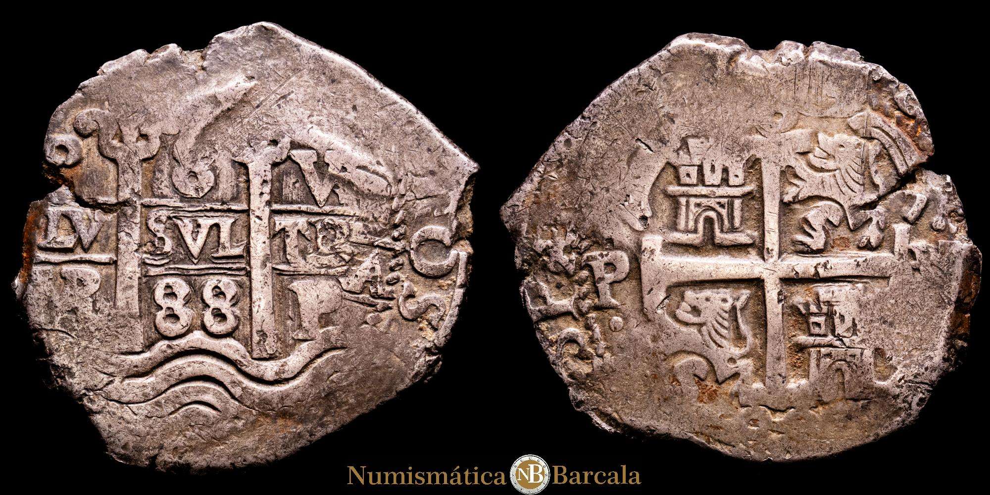 Carlos II (1665-1700). 8 reales. 1688. Potosí. VR. (Cal-373). Ag. 27,04 g. Dos fechas visibles. XF. Pátina oscura.
