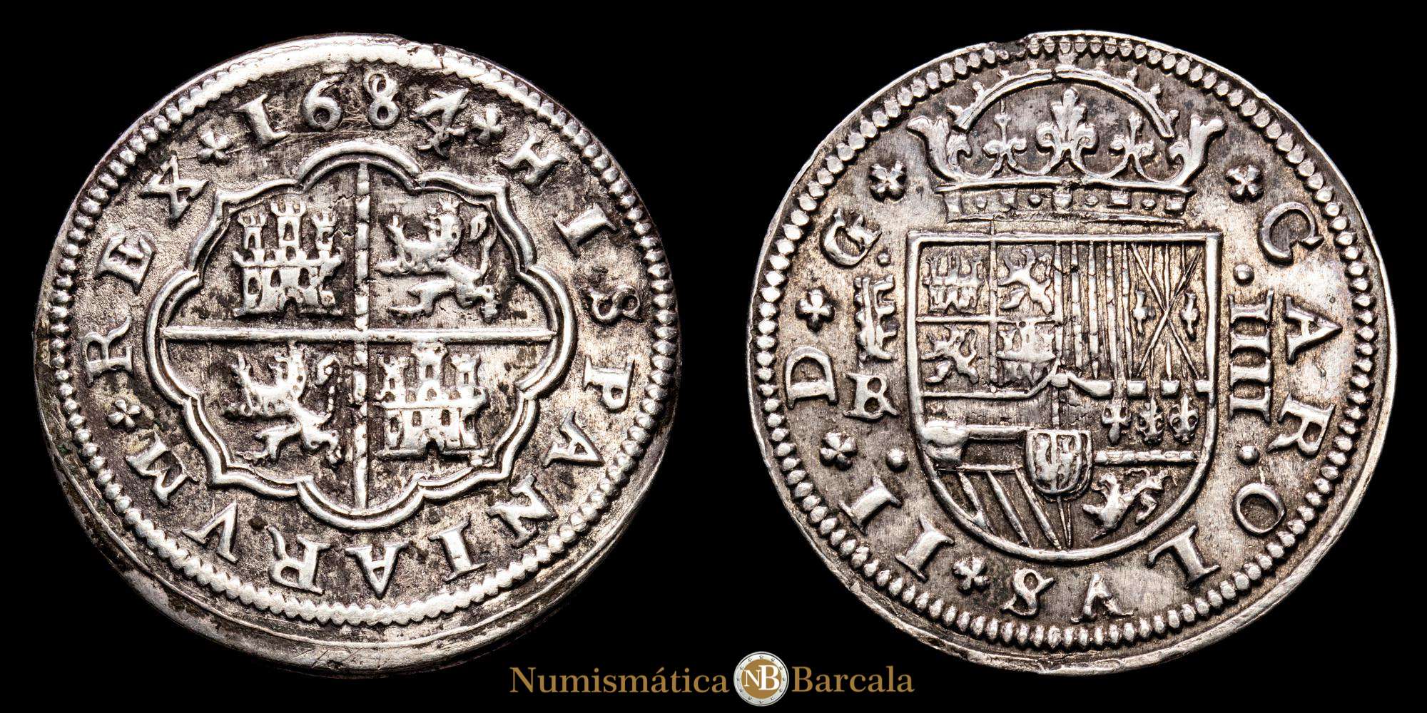 Numismática Barcala > Productos > Carlos II. 4 Reales. (13,26 g.). Segovia. 1684/683. Ensayador BR. AC-560. MBC+. Rara. Sin escudo de Portugal