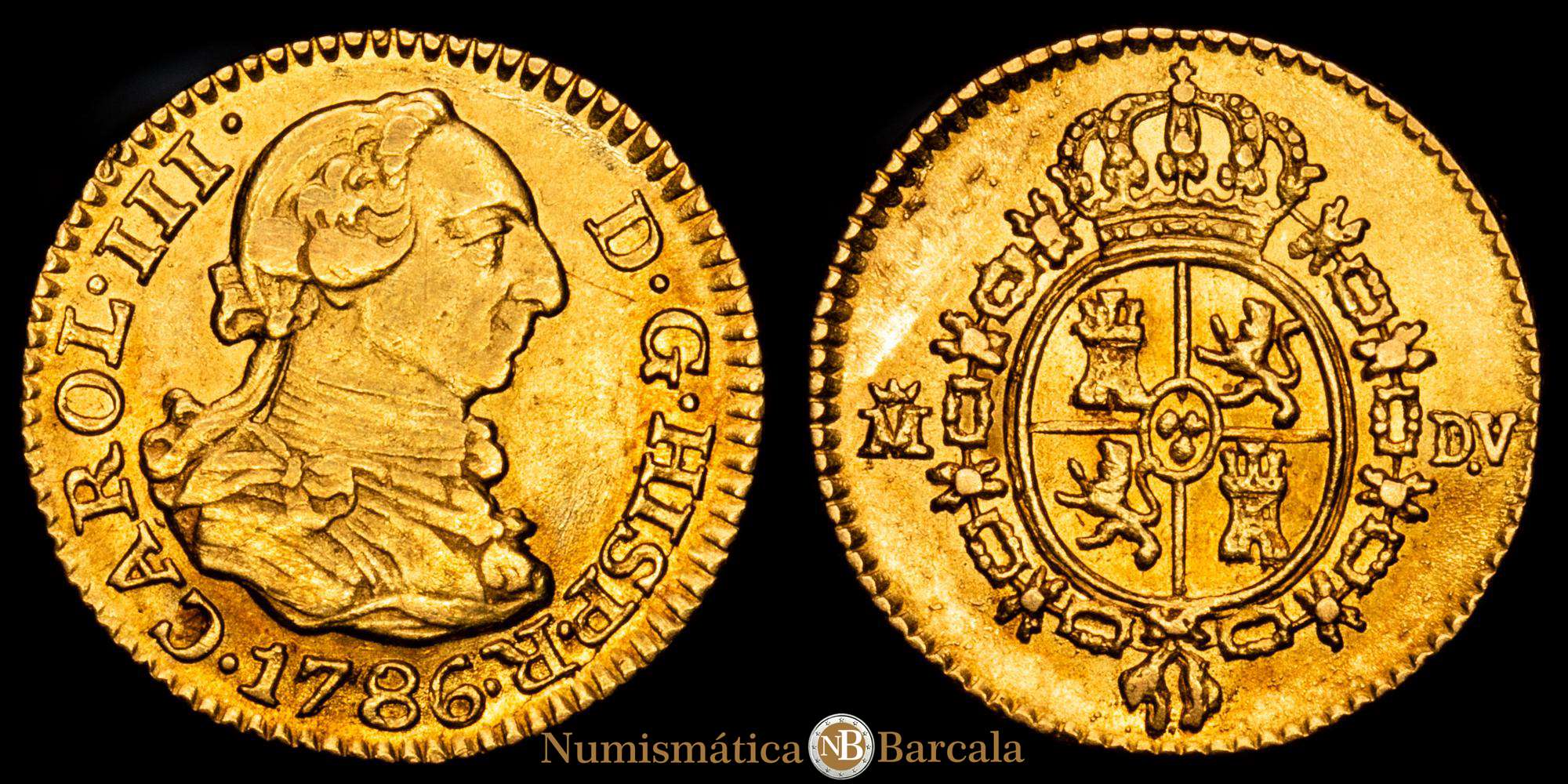 Numismática Barcala > Productos > Carlos III (1759-1788). 1/2 escudo. 1786. Madrid. DV. (Cal-1280). Au. 1,74 gramos. Bonito color. MBC+/EBC.