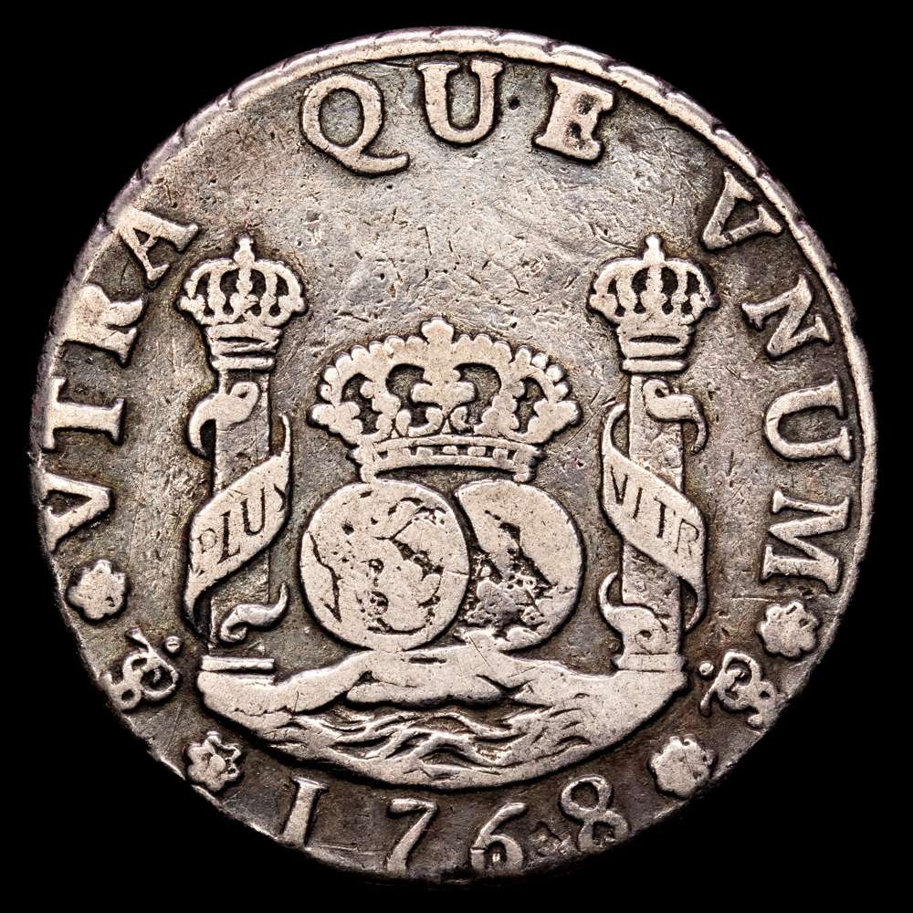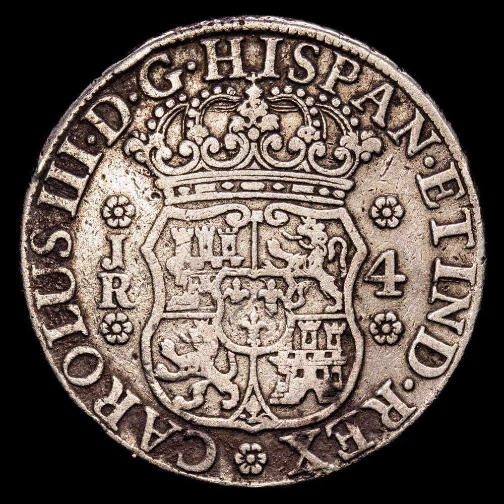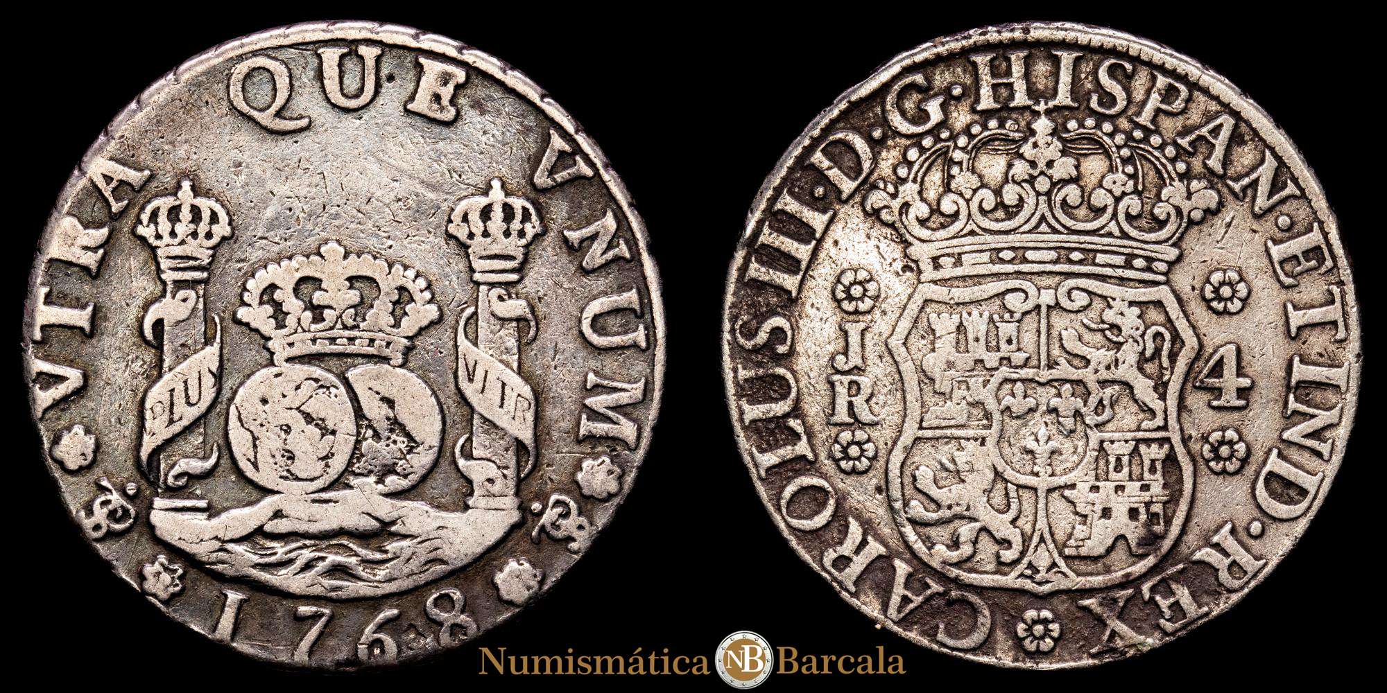 Carlos III (1759-1788) 1768 JR. Potosí 4 reales. Columnario (AC 922).Ar 13,12 gr. Punto sobre los monogramas de la ceca. Muy escaso. MBC-.