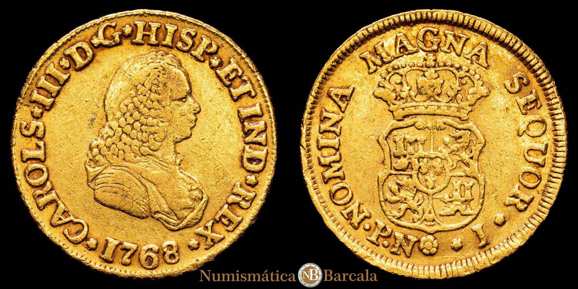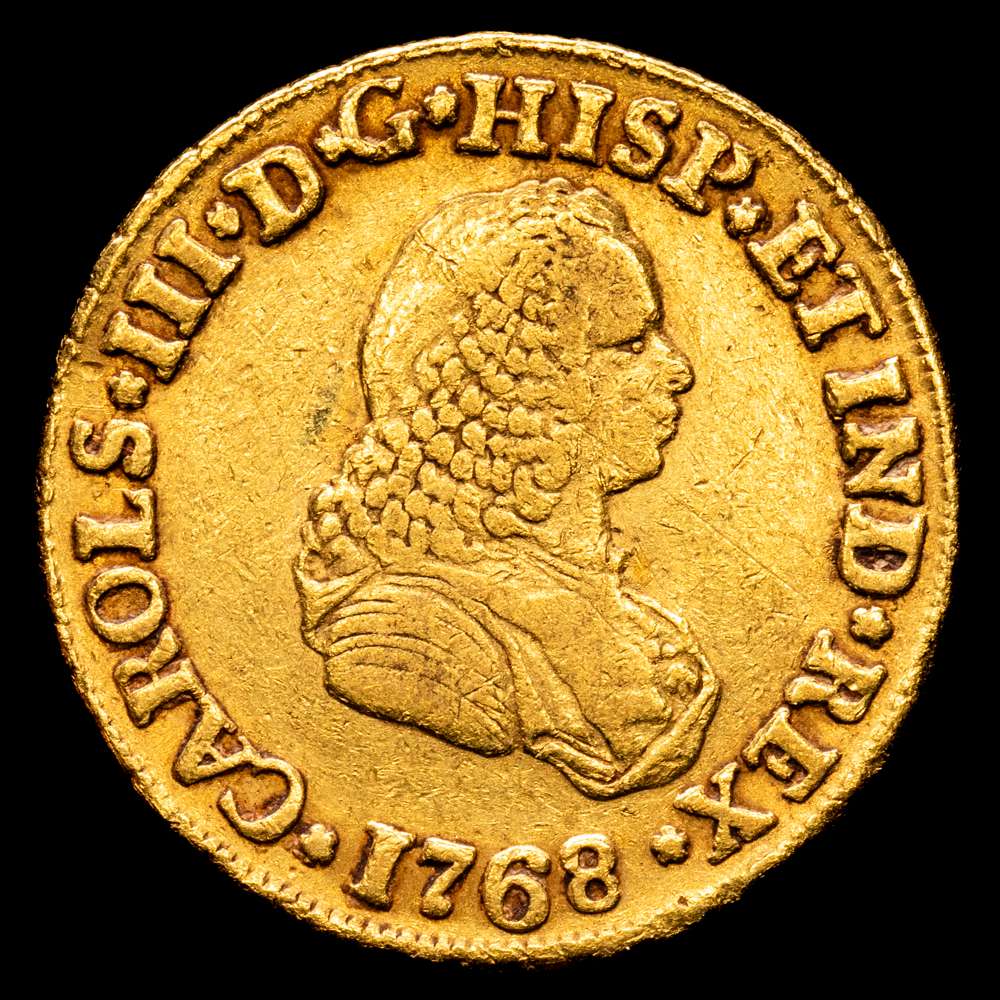 Carlos III (1759-1788). 2 escudos. 1768. Popayán. J. (Cal-1620). (Restrepo-58-12). Au. 6,69 gramos. Busto deFernando VI. Color bonito. Escasa. Rara. MBC+.