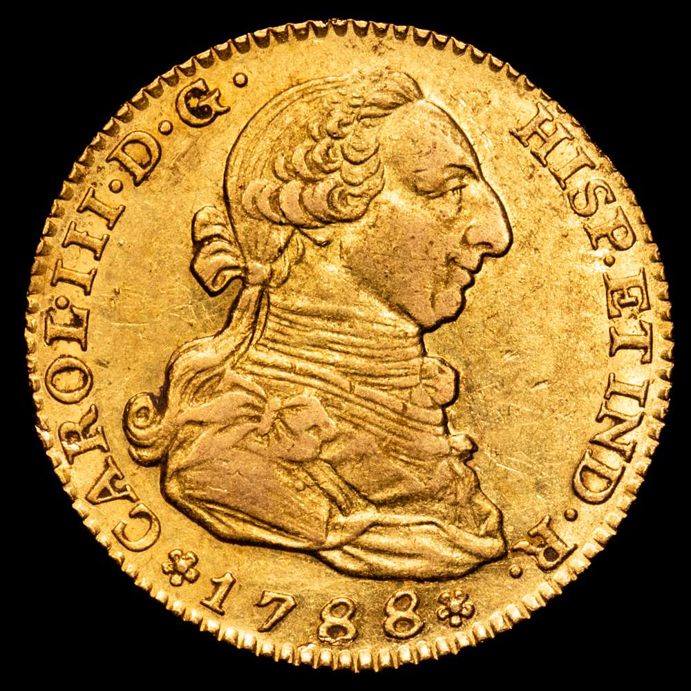 Numismática Barcala > Productos > Carlos III (1759-1788). 2 escudos. 1788. Madrid. M. (Cal-1578). Au. 6,79 gramos. Atractivo. Parte de brillo original. MBC+.