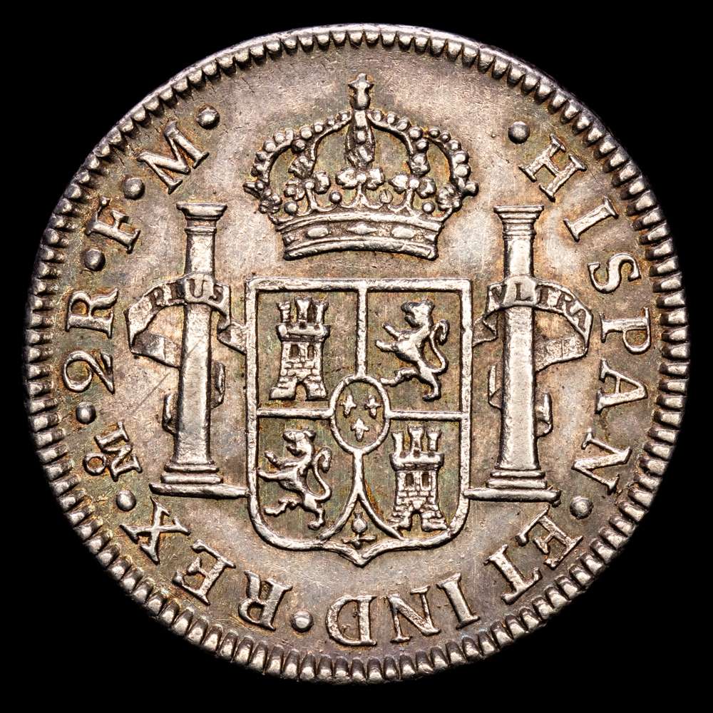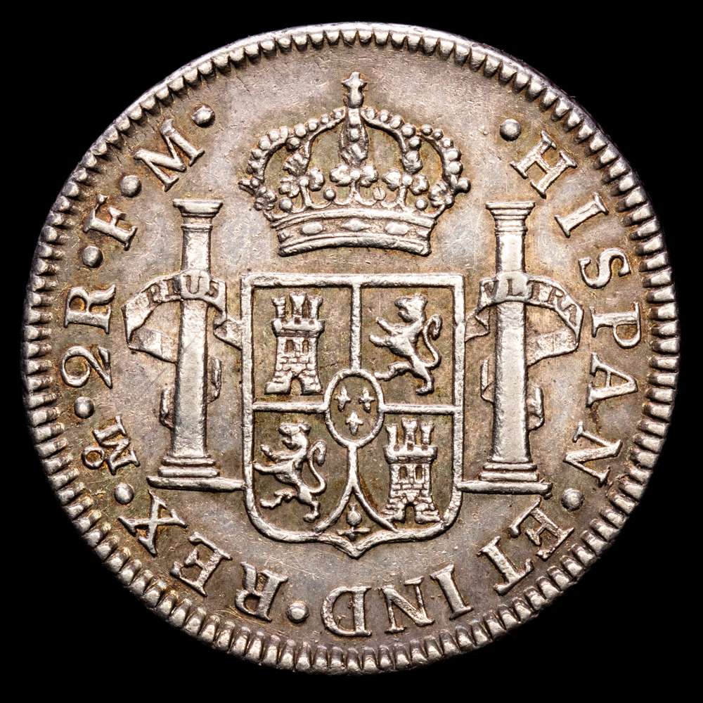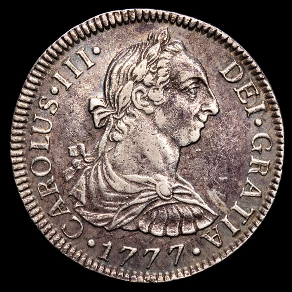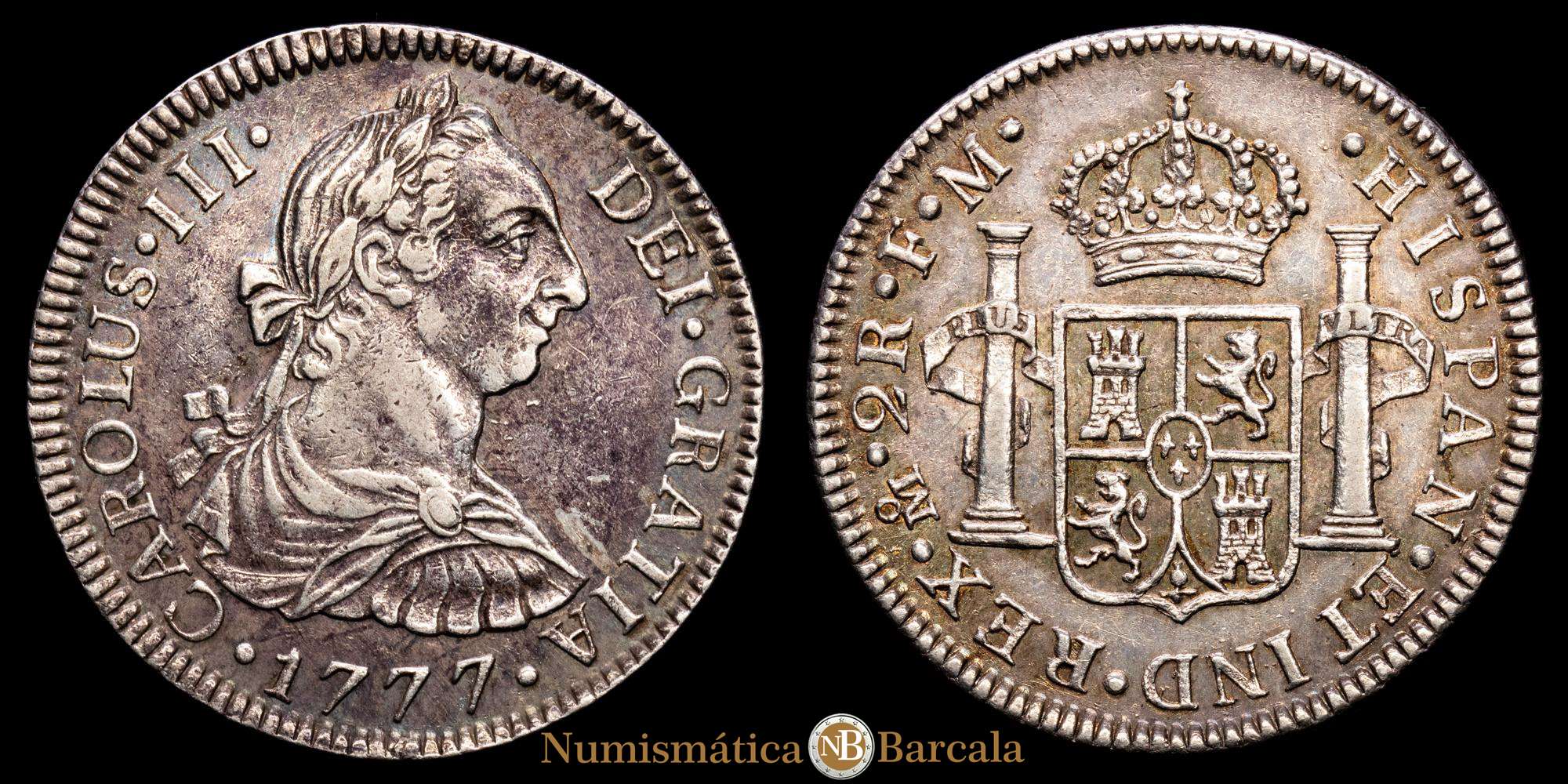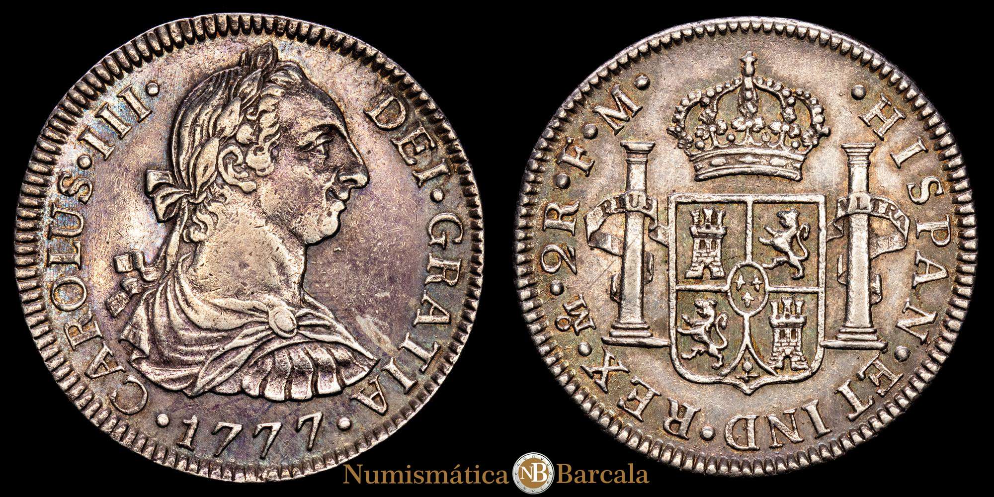 Carlos III (1759-1788). 2 reales. 1777. México. FM. (Cal-663). Ag. 6,75 gramos. Ligero tono iridiscente en el reverrso. MBC+.