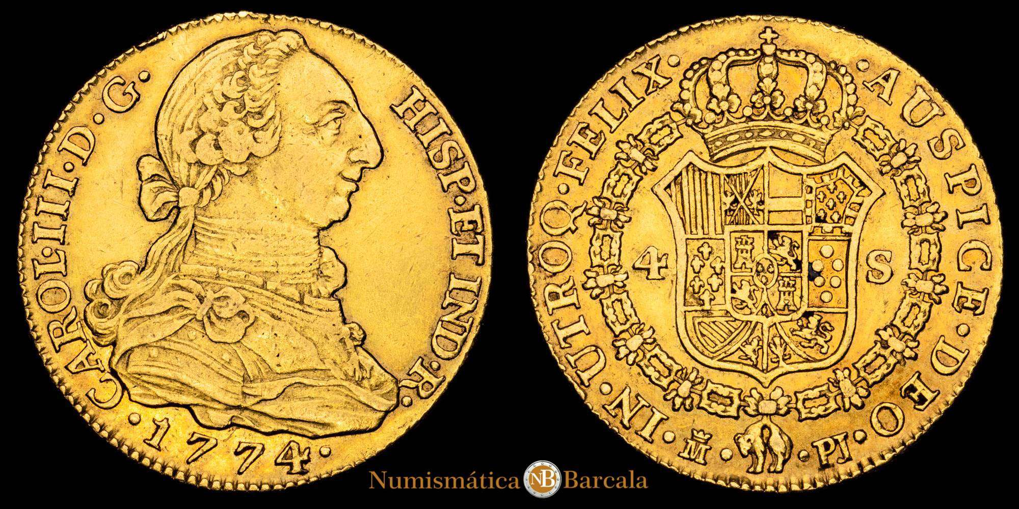 Numismática Barcala > Productos > Carlos III (1759-1788). 4 escudos. 1781. Madrid. PJ. (Cal-1778). Au. 13,44 gramos. Golpecitos en el canto. MBC+.