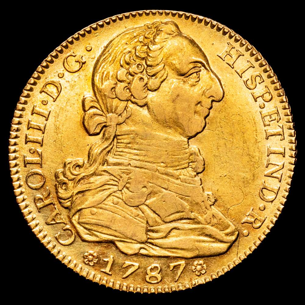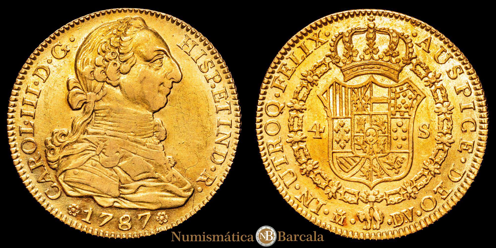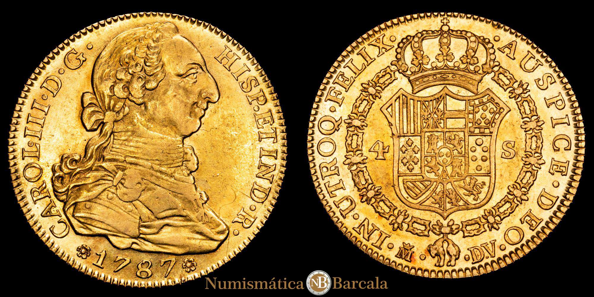 Numismática Barcala > Productos > Carlos III (1759-1788). 4 escudos. 1787. Madrid. DV. (Cal-1793). Au. 13,46 gramos. Parte de brillo original. EBC-/EBC+.