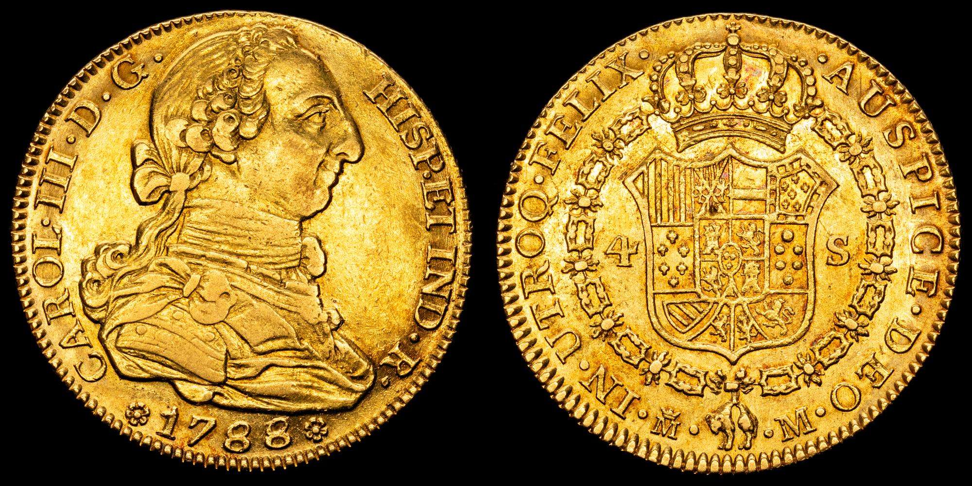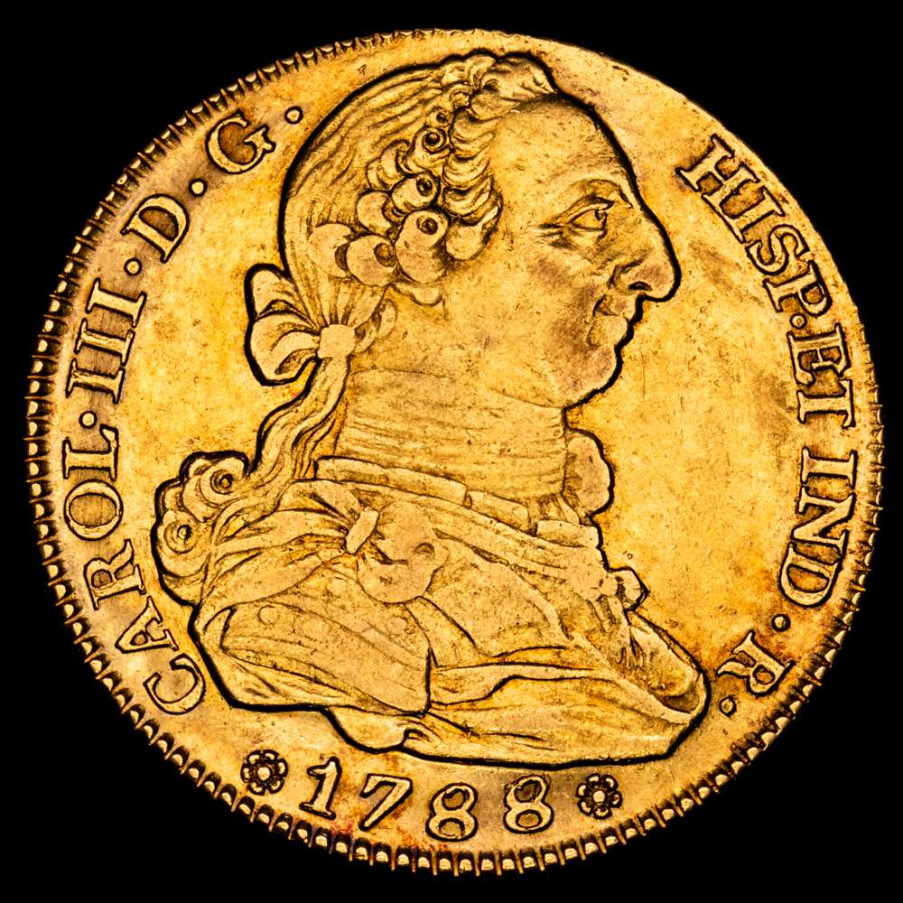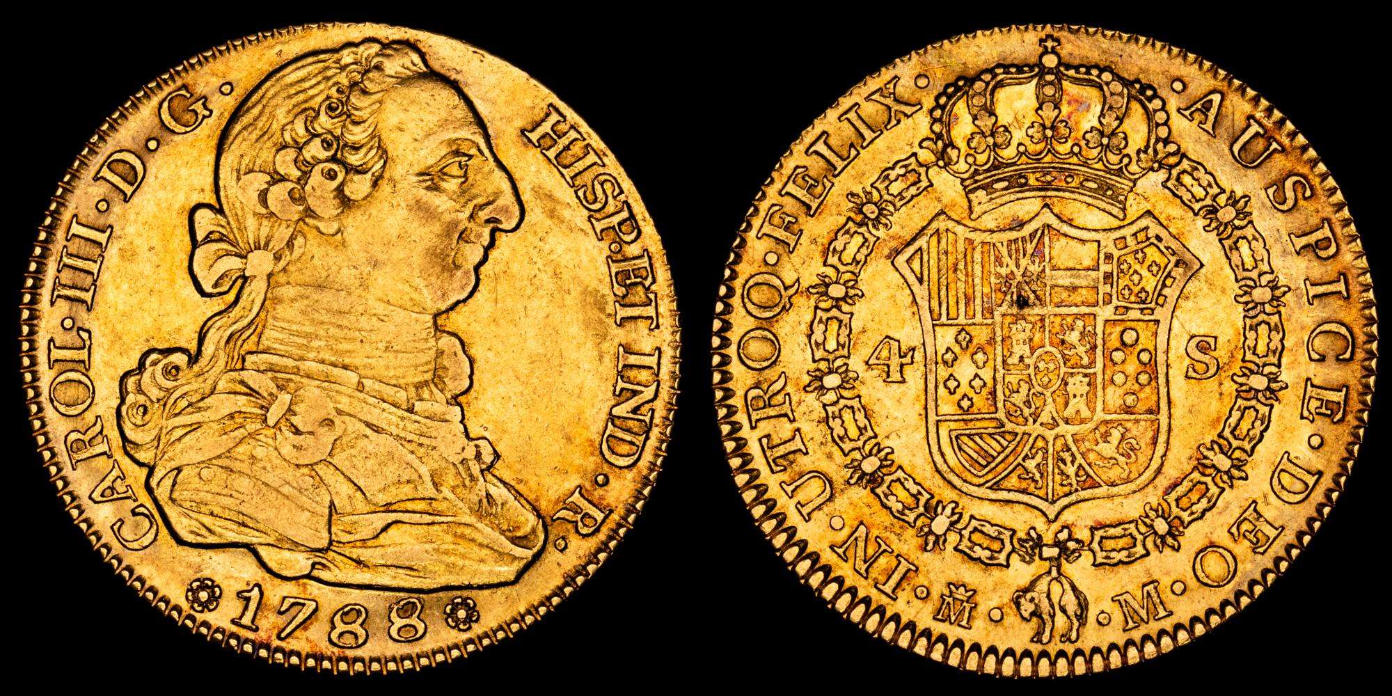 Numismática Barcala > Productos > Carlos III (1759-1788). 4 escudos. 1788/7. Madrid. M. (Cal-1794). Au. 13,53 gramos. Sobrefecha. Bonito color. Gran parte de brillo originales. EBC.