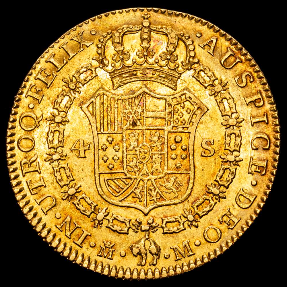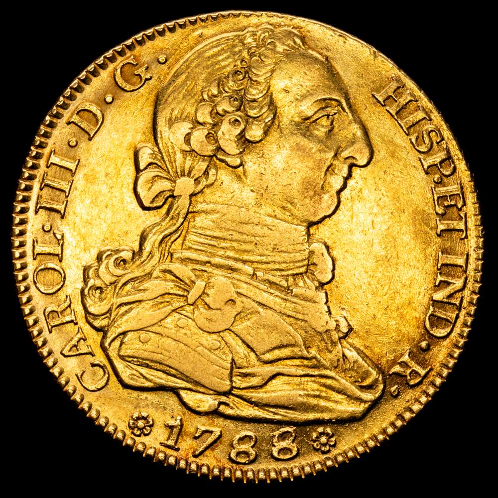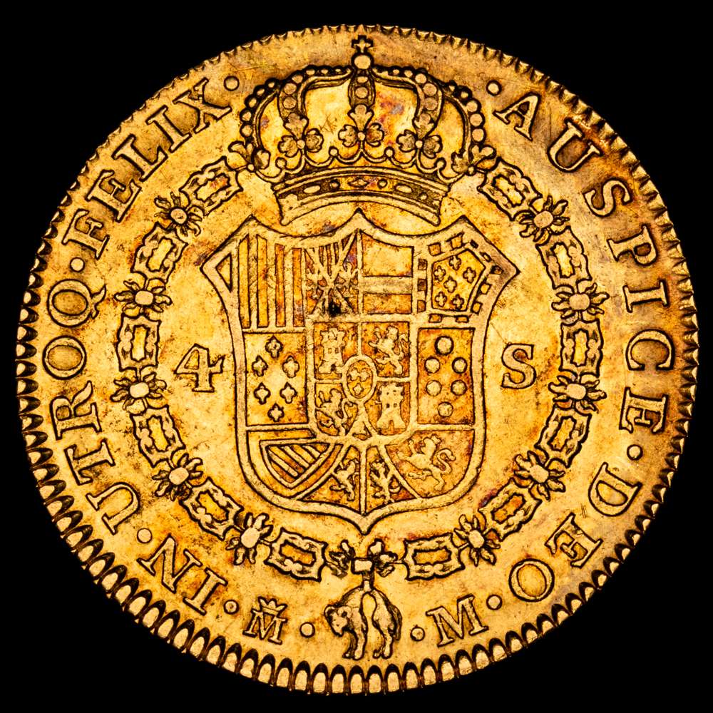 Numismática Barcala > Productos > Carlos III (1759-1788). 4 escudos. 1788/7. Madrid. M. (Cal-1794). Au. 13,53 gramos. Sobrefecha. Bonito color. Gran parte de brillo originales. EBC.