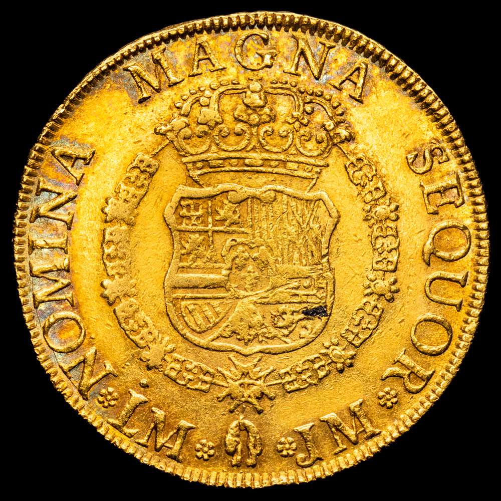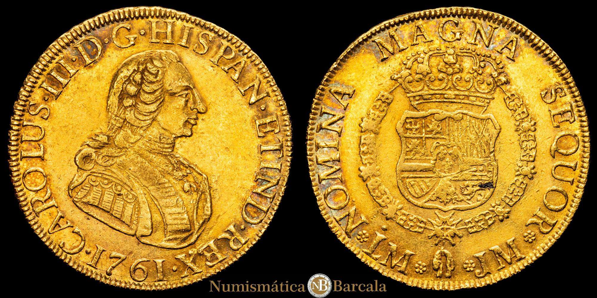 Carlos III (1759-1788). 8 escudos. 1761. Lima. JM. (Cal-1914). (Cal onza-673). Au. 27,01 g. Primer busto. Buen ejemplar. Muy rara. MBC+. Bello color.