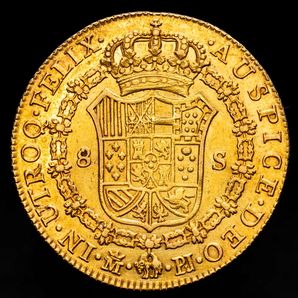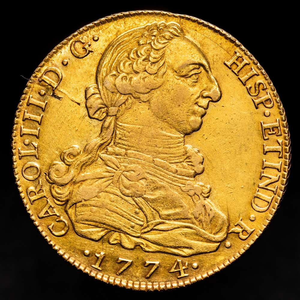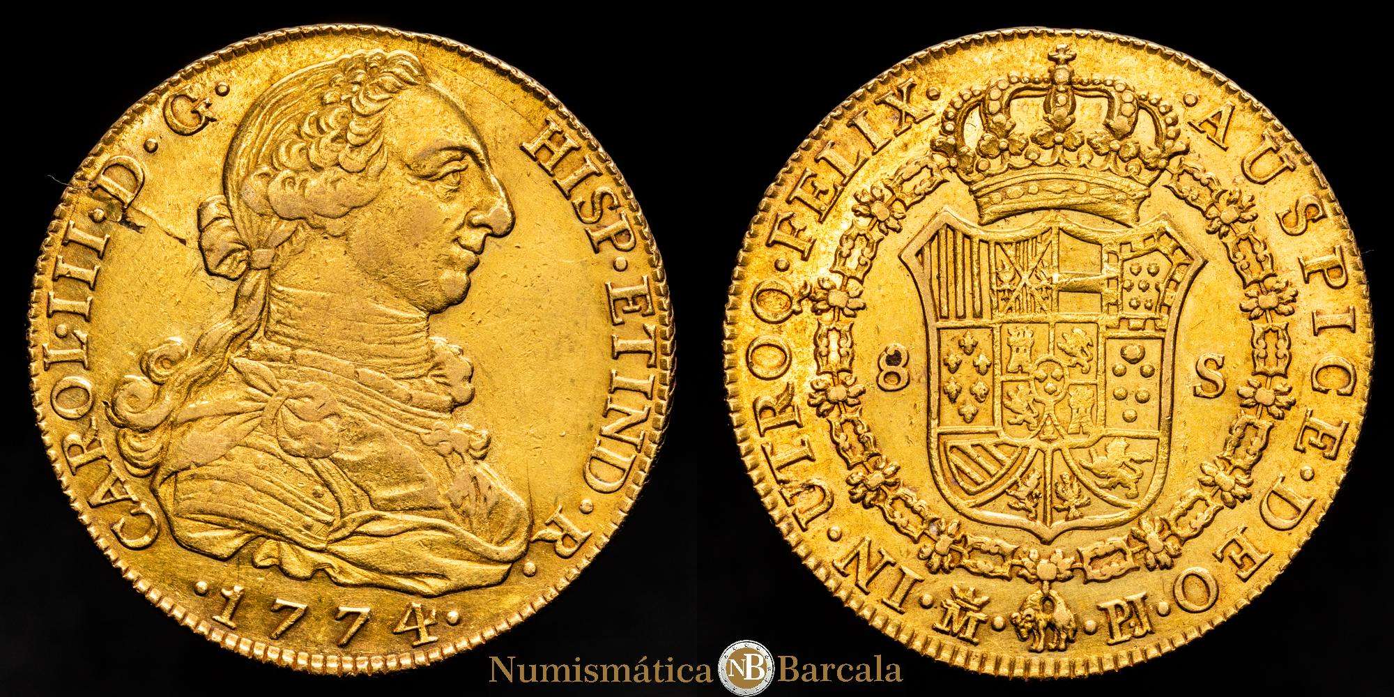 Numismática Barcala > Productos > Carlos III (1759-1788). 8 escudos. 1774. Madrid. PJ. (Cal-1960). (Cal onza-723). Au. 26,97 gramos. Punto entre ensayadores. Hoja en anverso. Ligero tono rojizo. Escasa. MBC+-/EBC-.