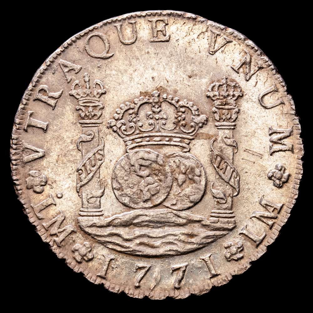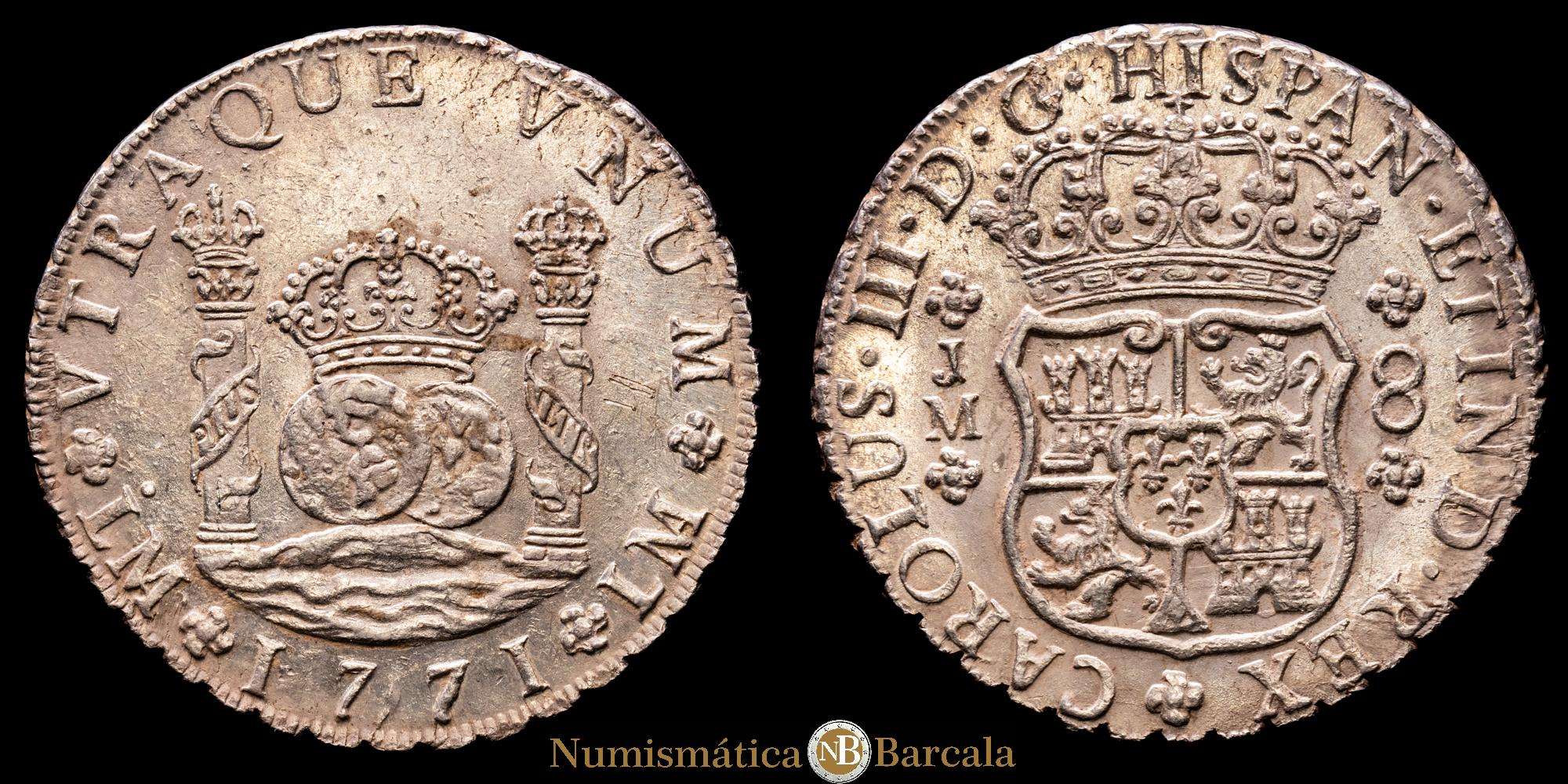 Numismática Barcala > Productos > Carlos III (1759-1788). 8 reales. 1771. Lima. JM. (Cal-1032). Ag. 26,89 gramos. Punto sobre la primera LMA. Restos de brillo original. XF.