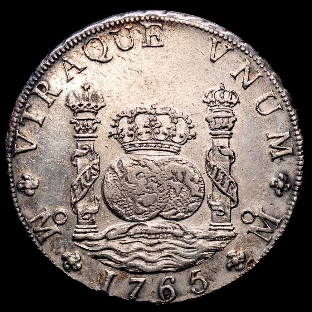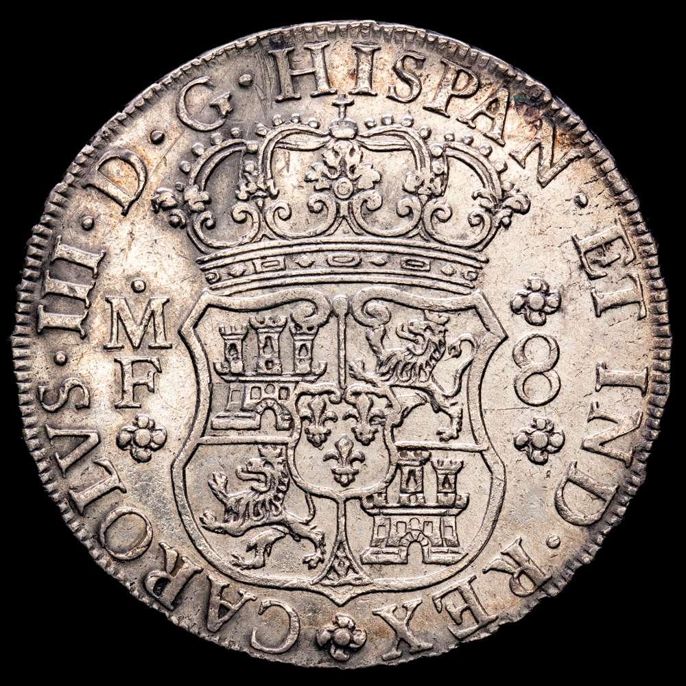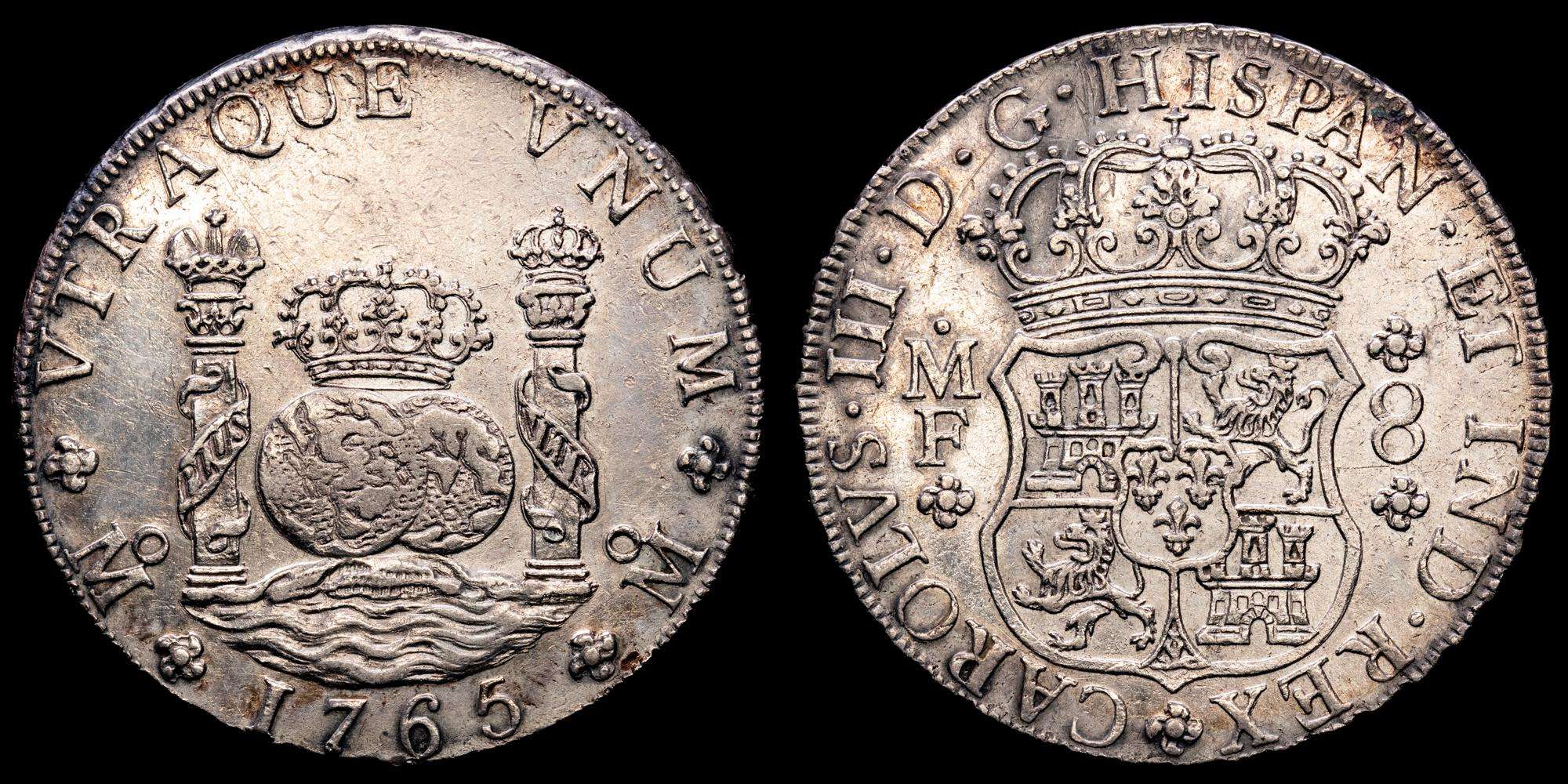 Numismática Barcala > Productos > CARLOS III (1759-1788). 8 reales. México. 1765. MF. 26,75 gramos. 37,8 mm. AC-1088. Restos de brillo originales. EBC.