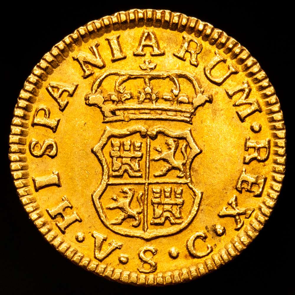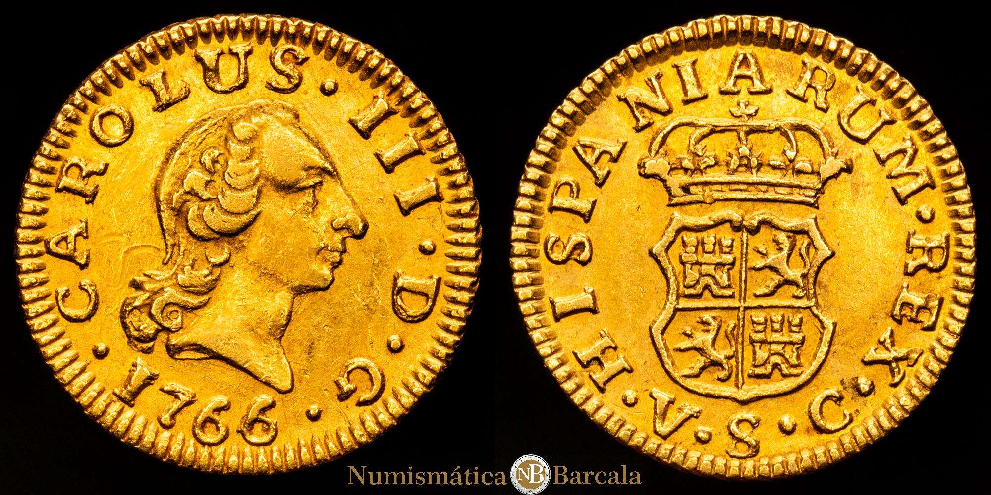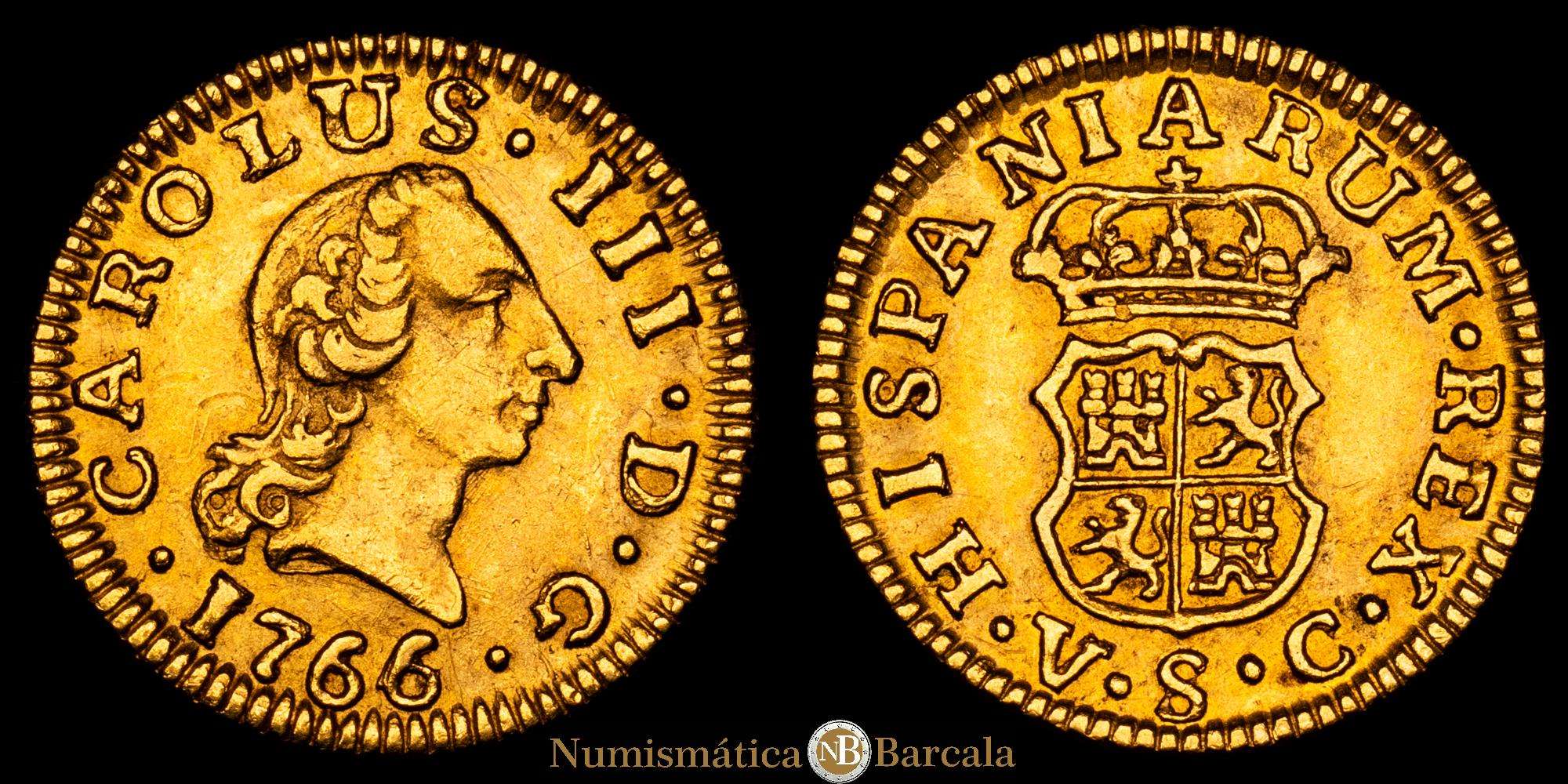 Numismática Barcala > Productos > Carlos III. 1766/4 Sevilla. VC. 1/2 escudo. (AC. 1294). Bella. Sobrefecha muy escasa y mas así. 1,76 g. EBC-/EBC.