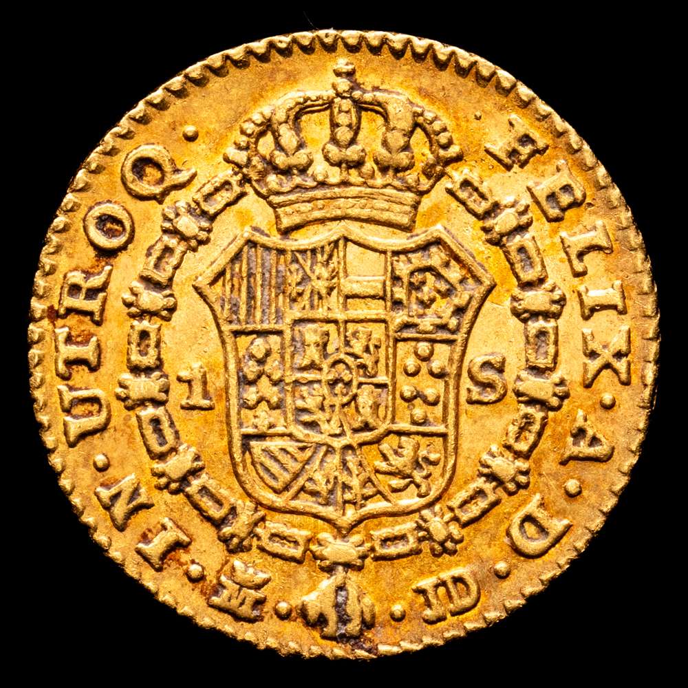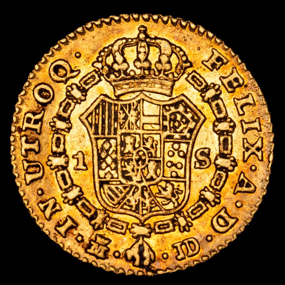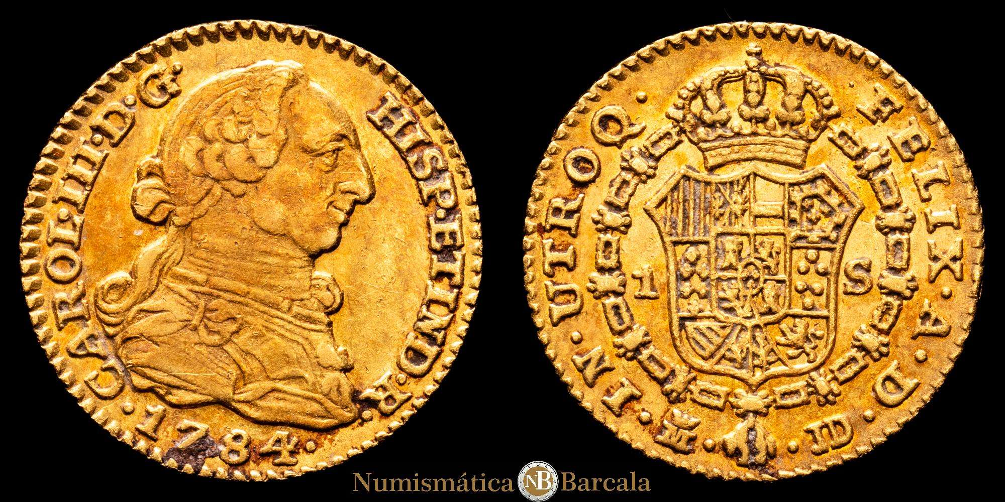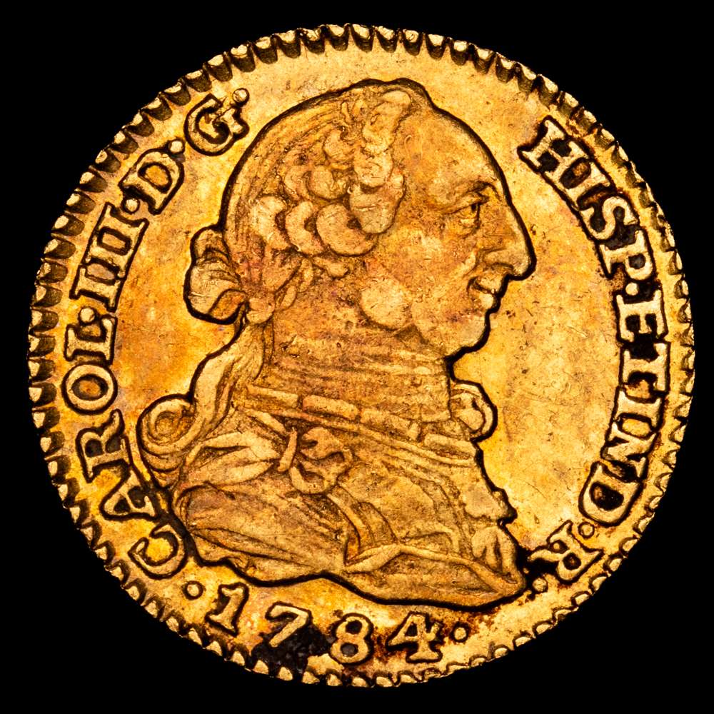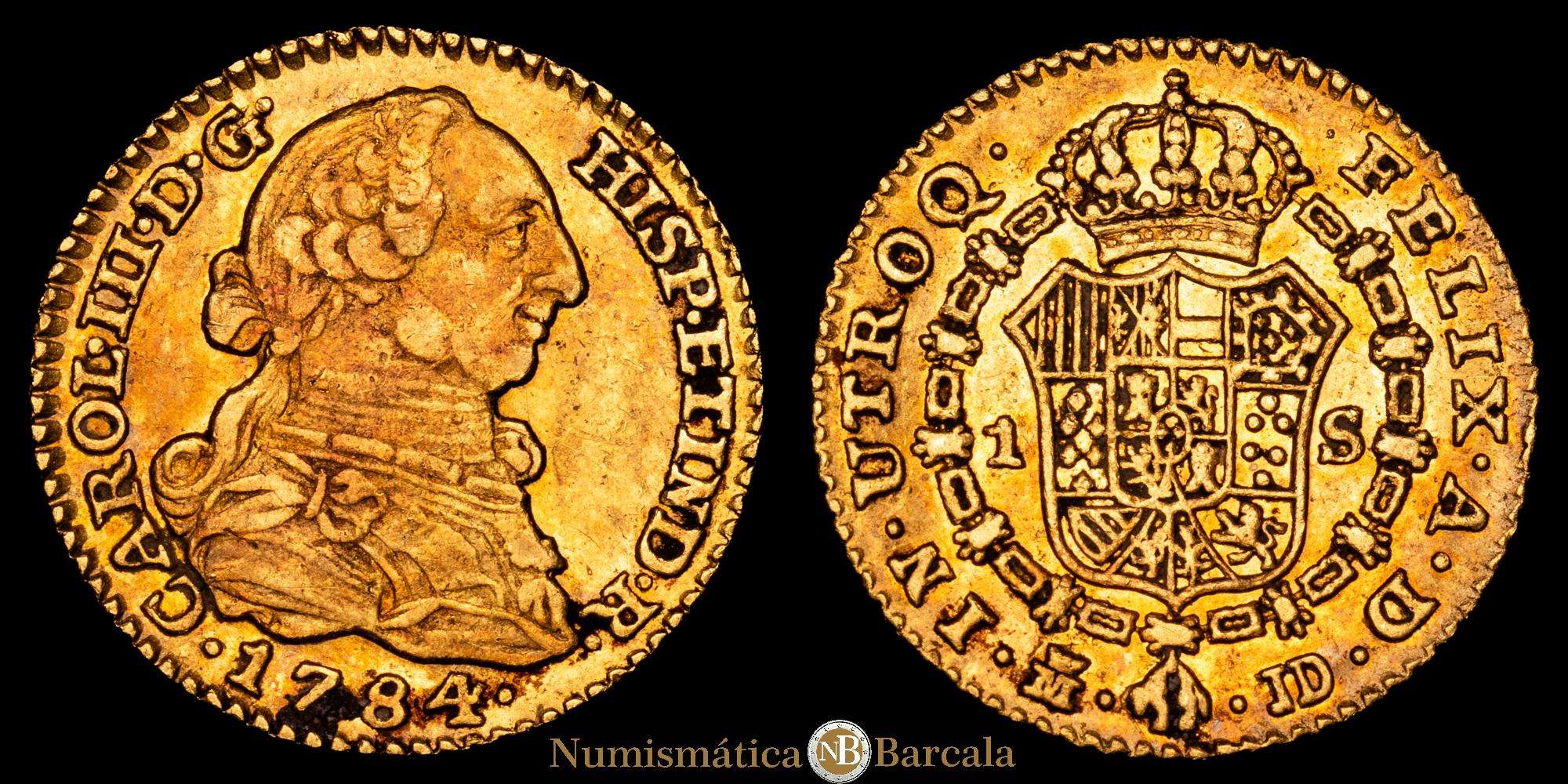 Carlos III. 1784 Madrid. J.D. 1 escudo. (AC. 1364). Parte de su brillo original. 3,36 gramos. Precioso color con una tonalidad rojiza. EBC. Muy rara en esta conservación.