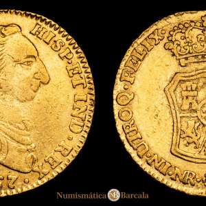 Carlos III. 2 Escudos. (6,66 g.). Nuevo Reino. 1767. J·V. AC-1618. MBC. Tipo “cara de rata”. Rara .