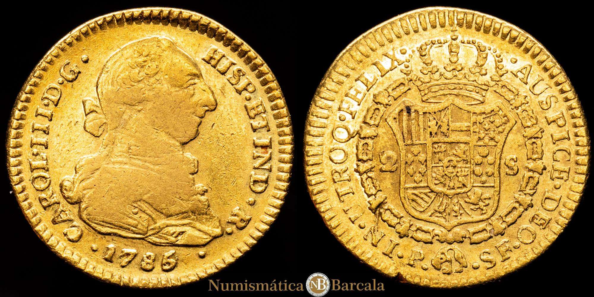 Numismática Barcala > Productos > Carlos III. 2 escudos. Popayán. 1785 sobre 4. SF. (AC. 1648) (Restrepo 62-27). Cy no cita la sobrefecha. 6´61 g. Casi MBC, restos de brillo original. Escasa. Interesante.