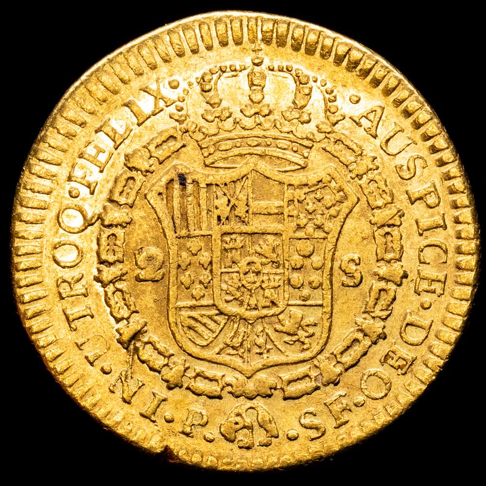 Carlos III. 2 escudos. Popayán. 1785 sobre 4. SF. (AC. 1648) (Restrepo 62-27). Cy no cita la sobrefecha. 6´61 g. Canto perdido. Corte en grafila de reverso. Acuñación del busto débil. Casi MBC, restos de brillo original. Escasa. Interesante.
