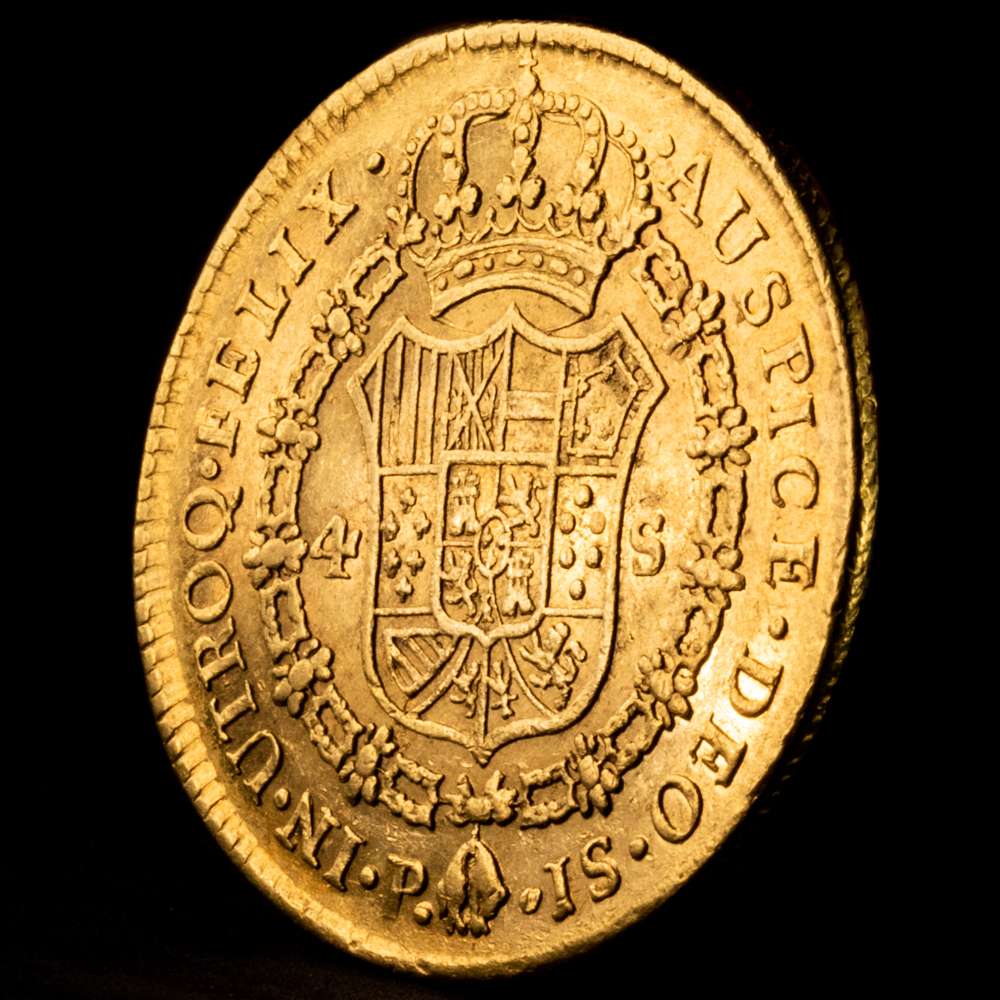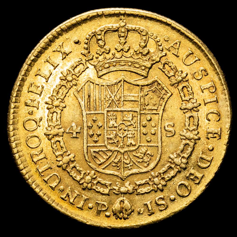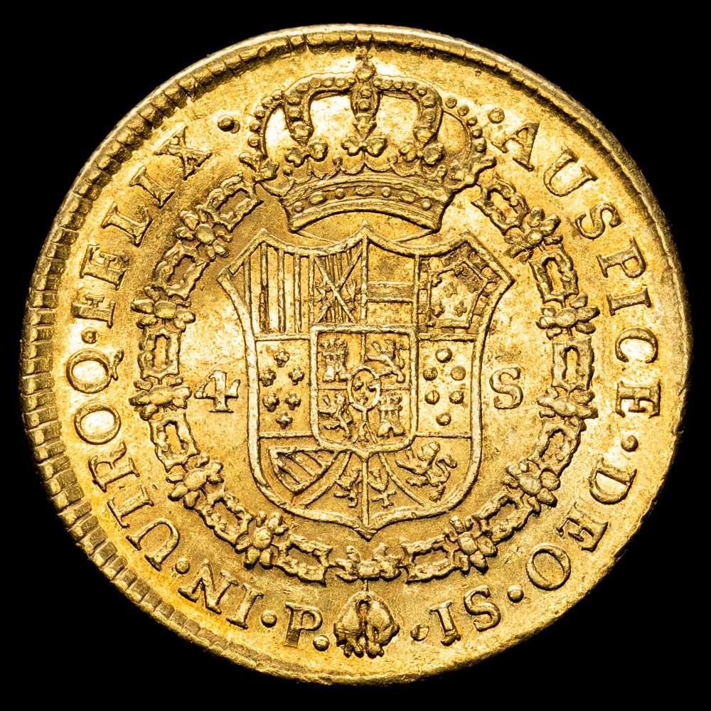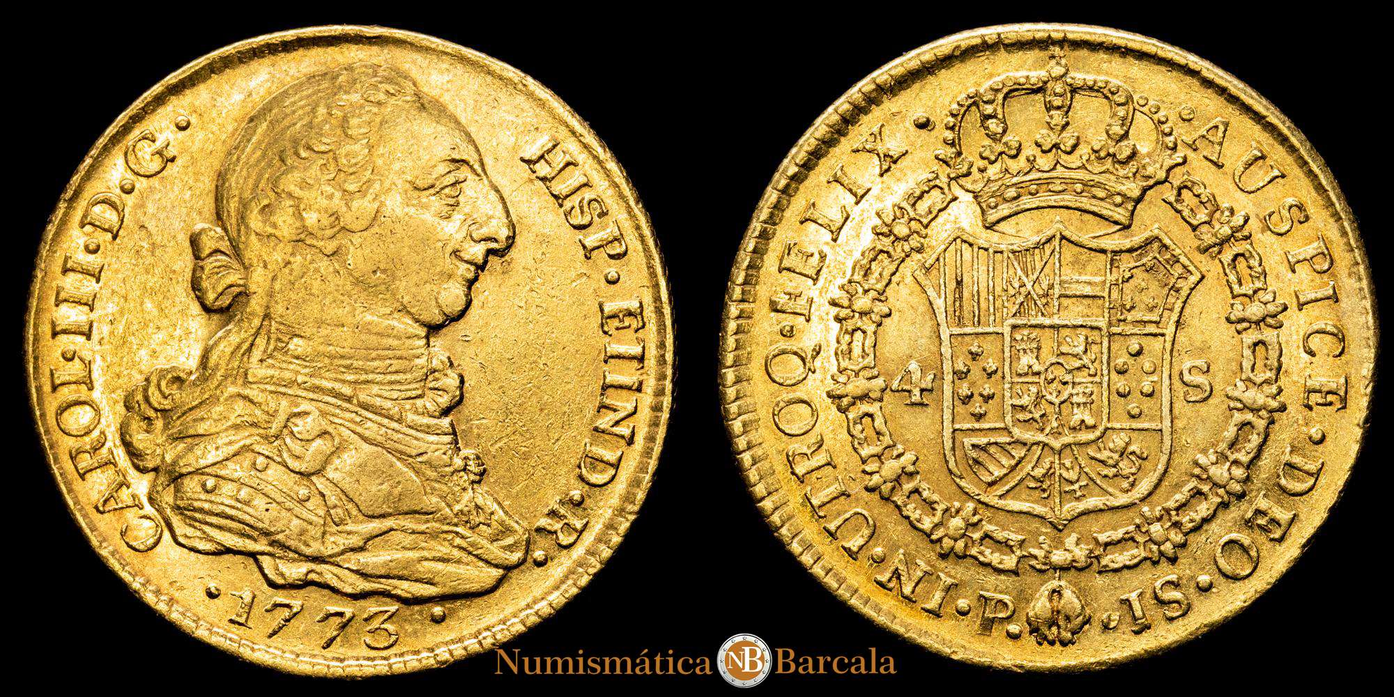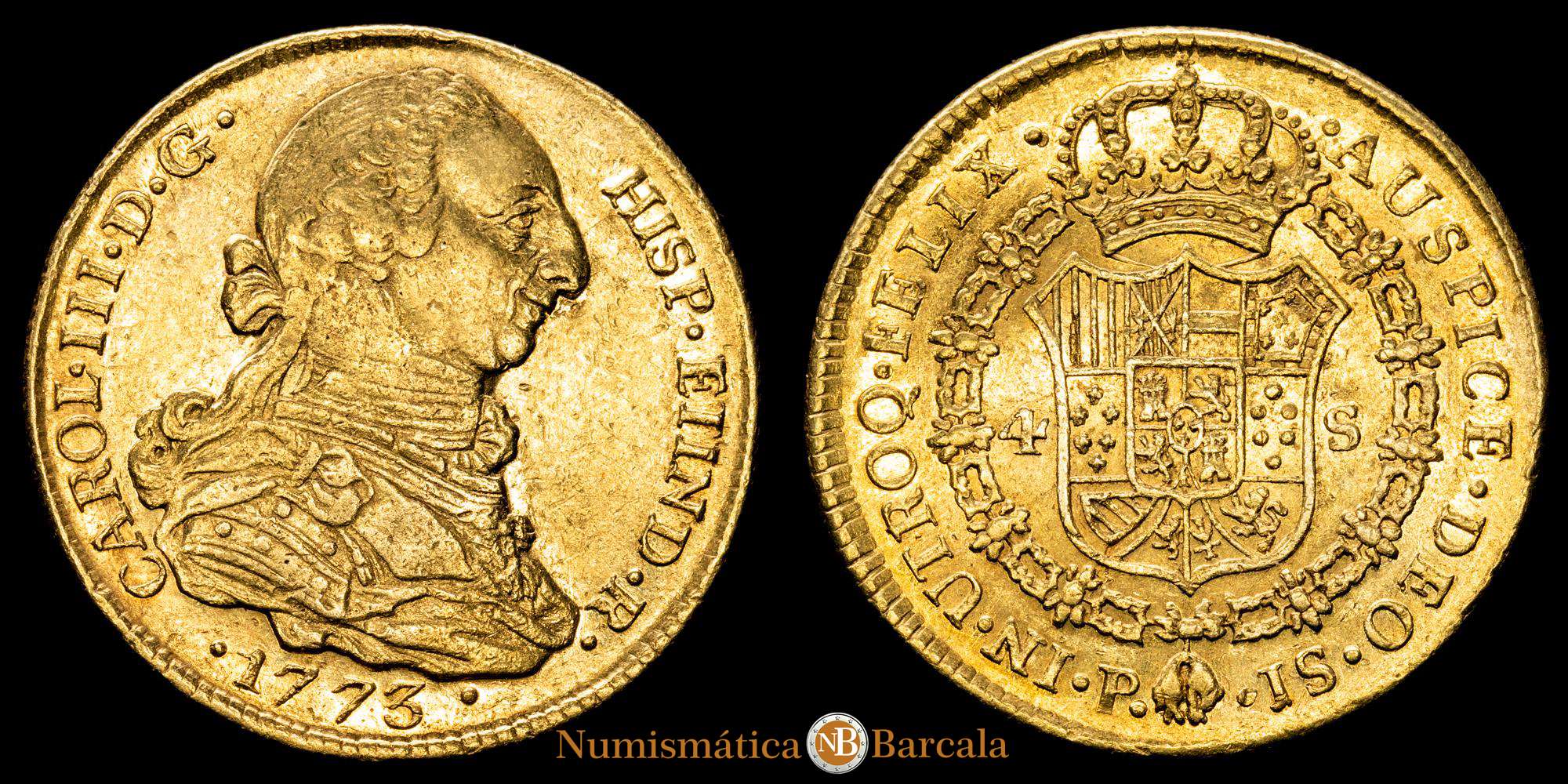 Carlos III. 4 Escudos. (13,48 g.). Popayán. 1773. J·J. AC-1834. EBC-. Rara así. Único año de este ensayador