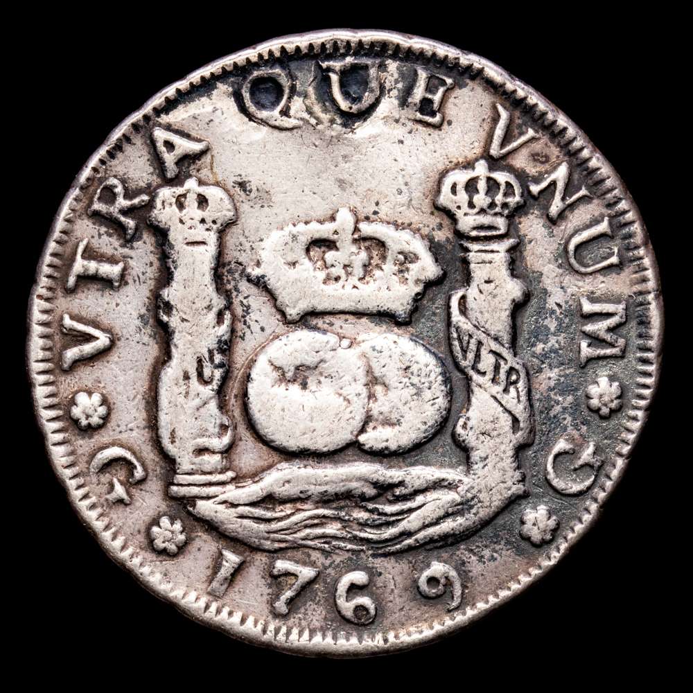 Carlos III. 4 Reales. (13,12 g.). Guatemala. 1769. Ensayador P. Aureo y Calico – 800. MBC. Escasa! Agujero reparado.