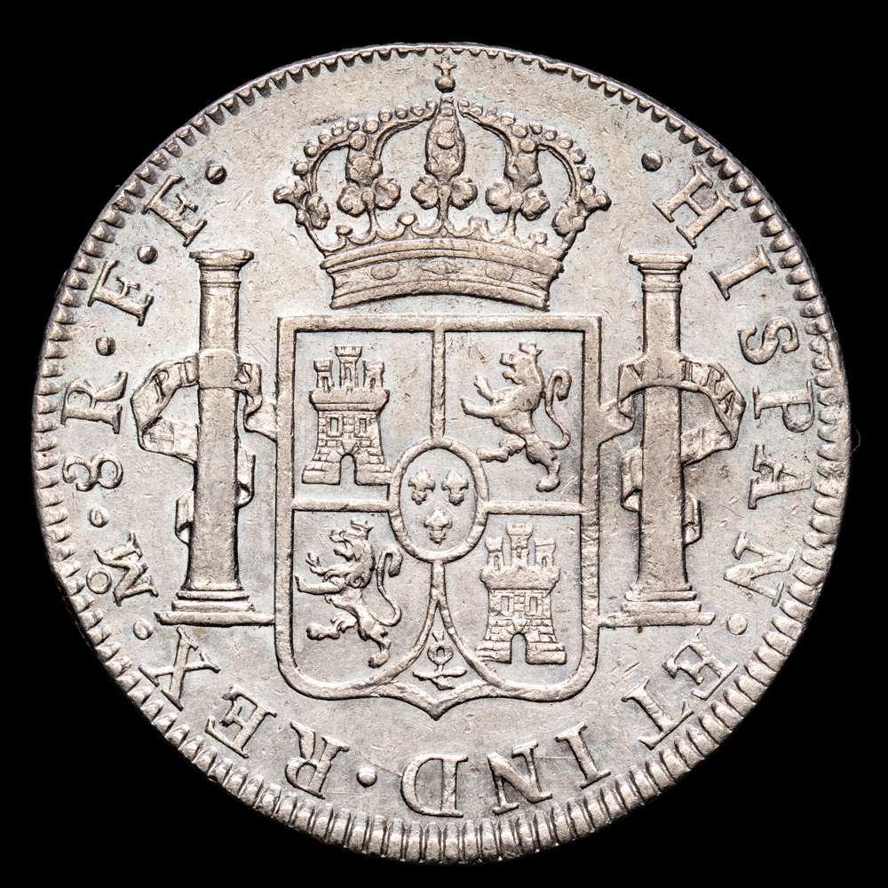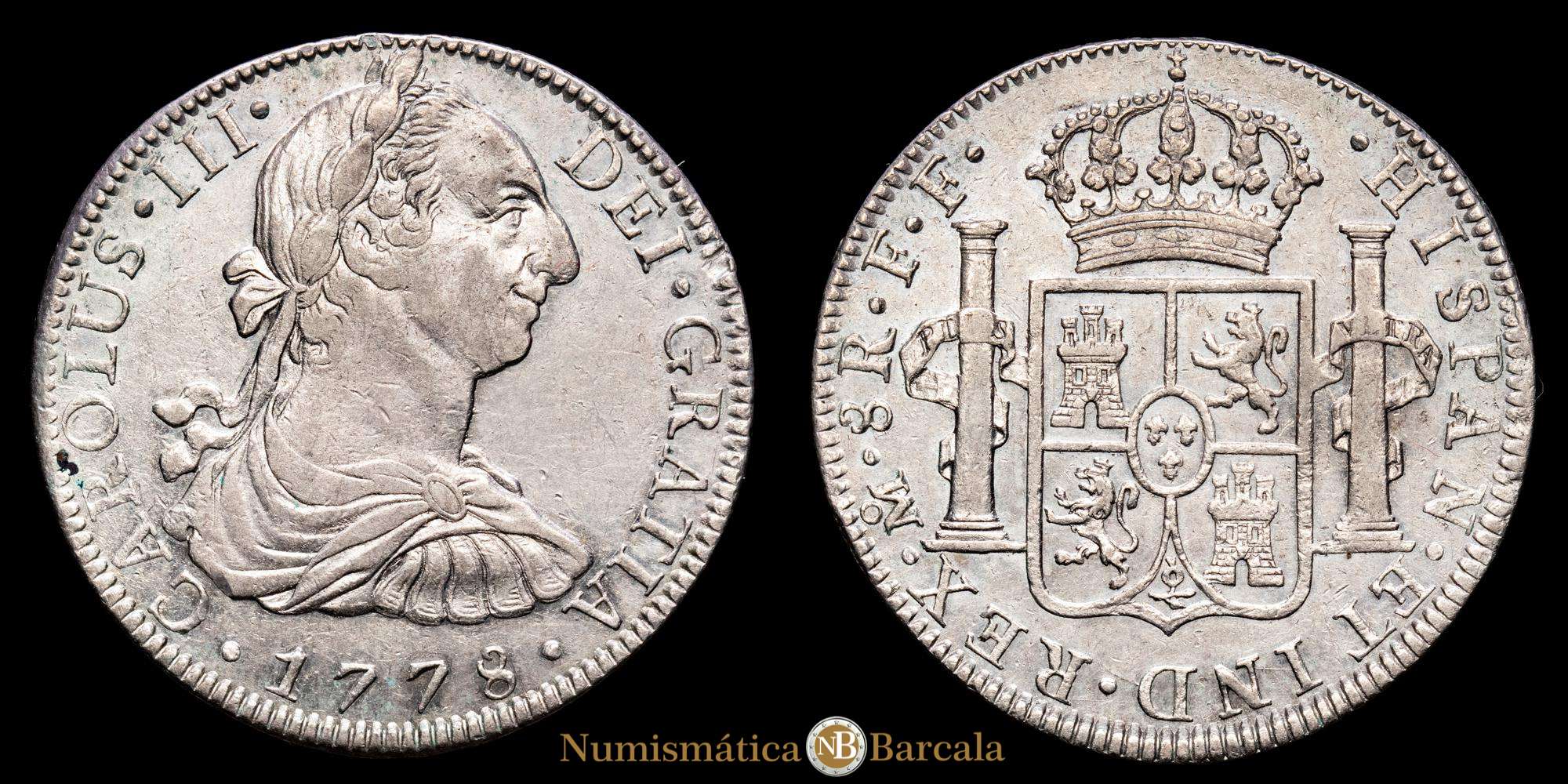 Numismática Barcala > Productos > Carlos III. 8 Reales. (26,88 g.). México. 1778. Ensayador F·F. Aureo y Calicó-1117. EBC-. En anverso restos de brillo original; en reverso brillo original.
