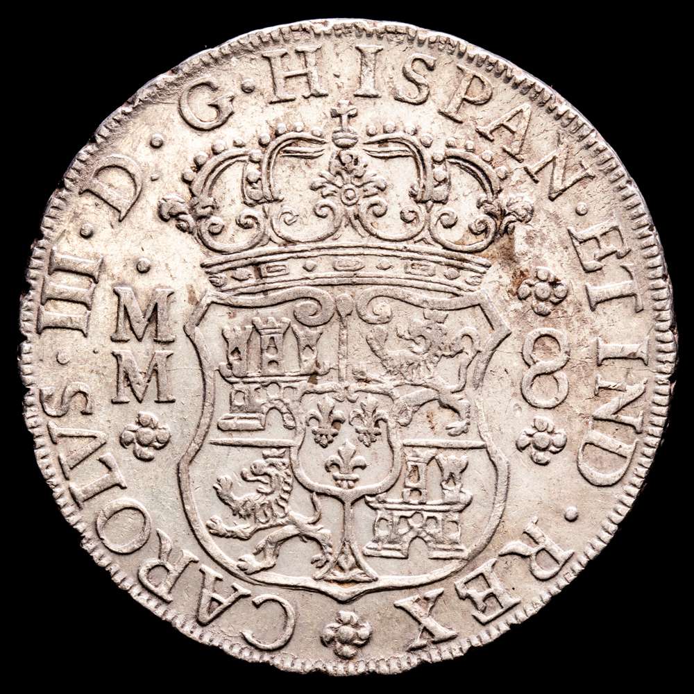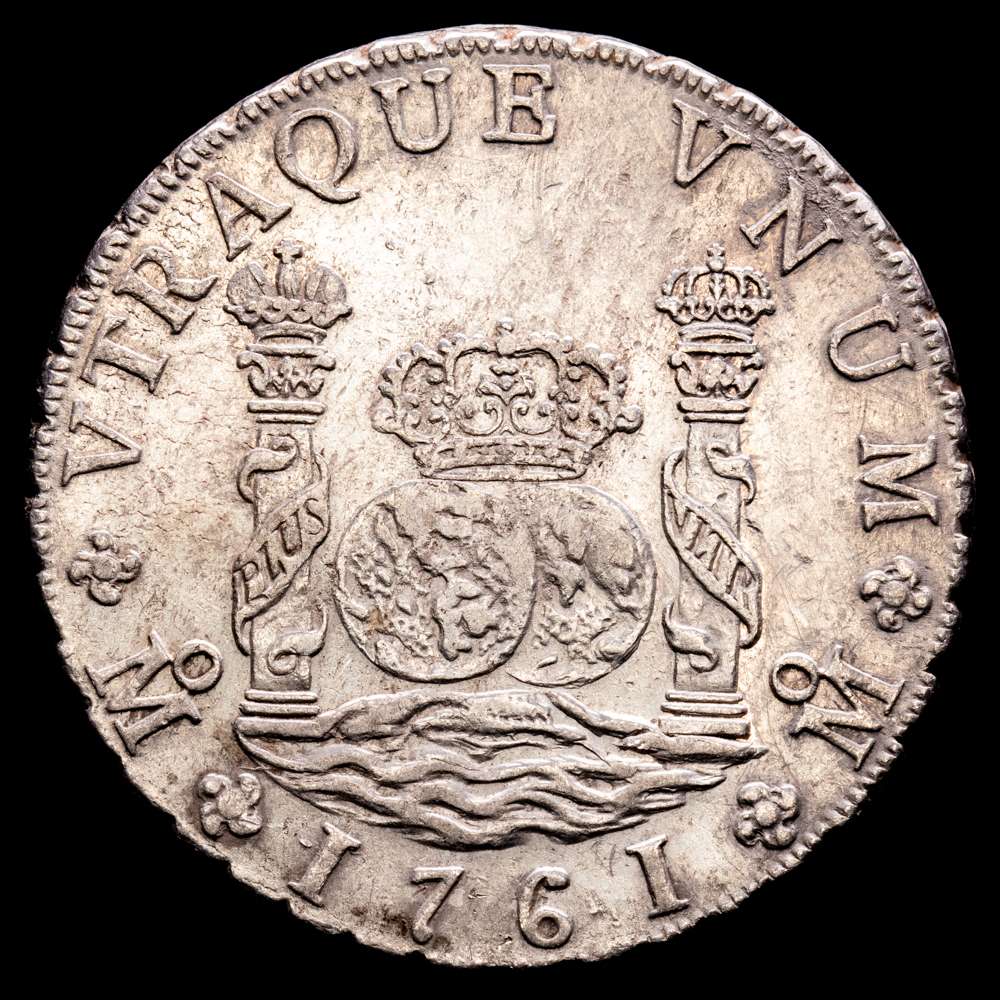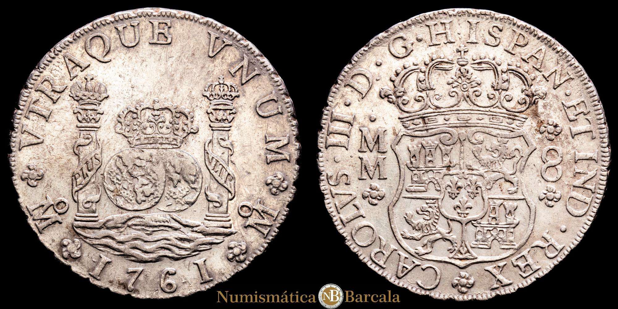 Carlos III. 8 Reales. (26,91 g.). México. 1761. M·M. AC-1075. (cruz entre “H” e “I”). Casa de la Moneda de la Ciudad de México. EBC-.