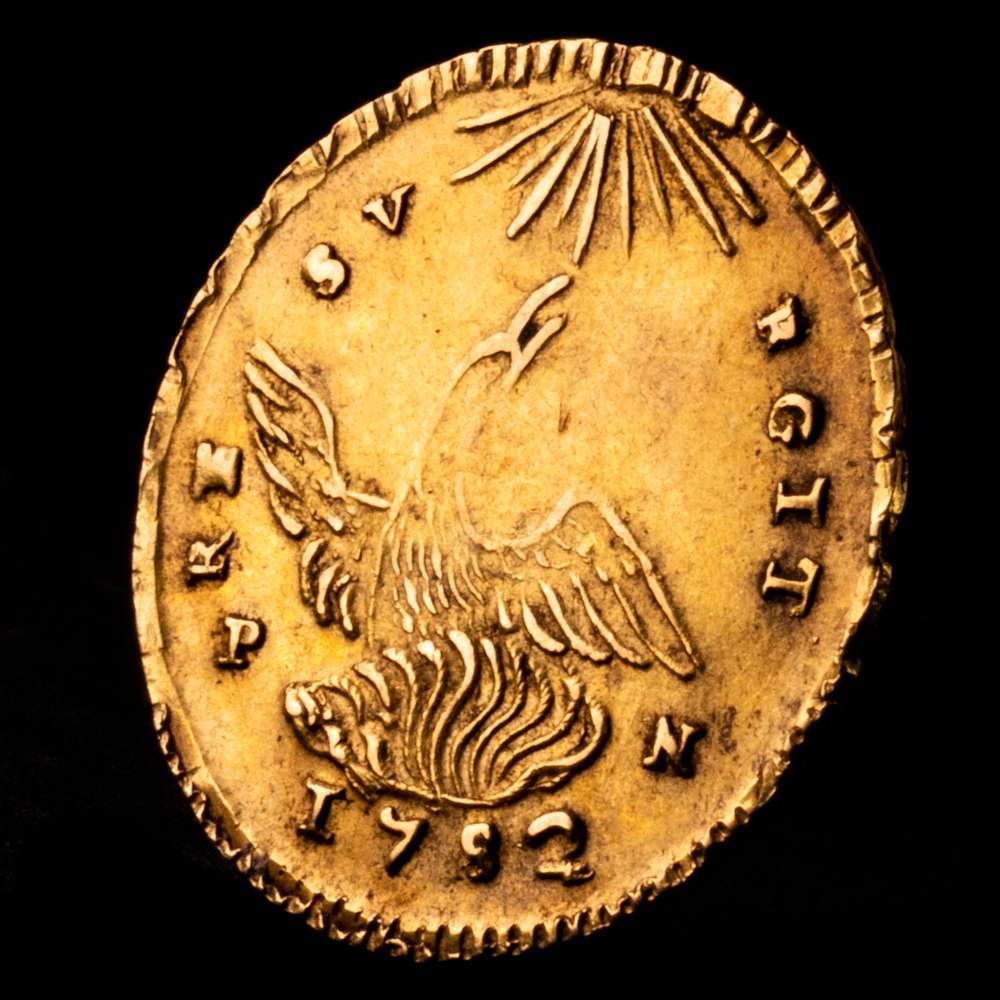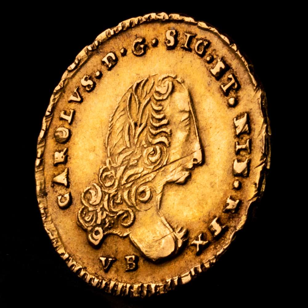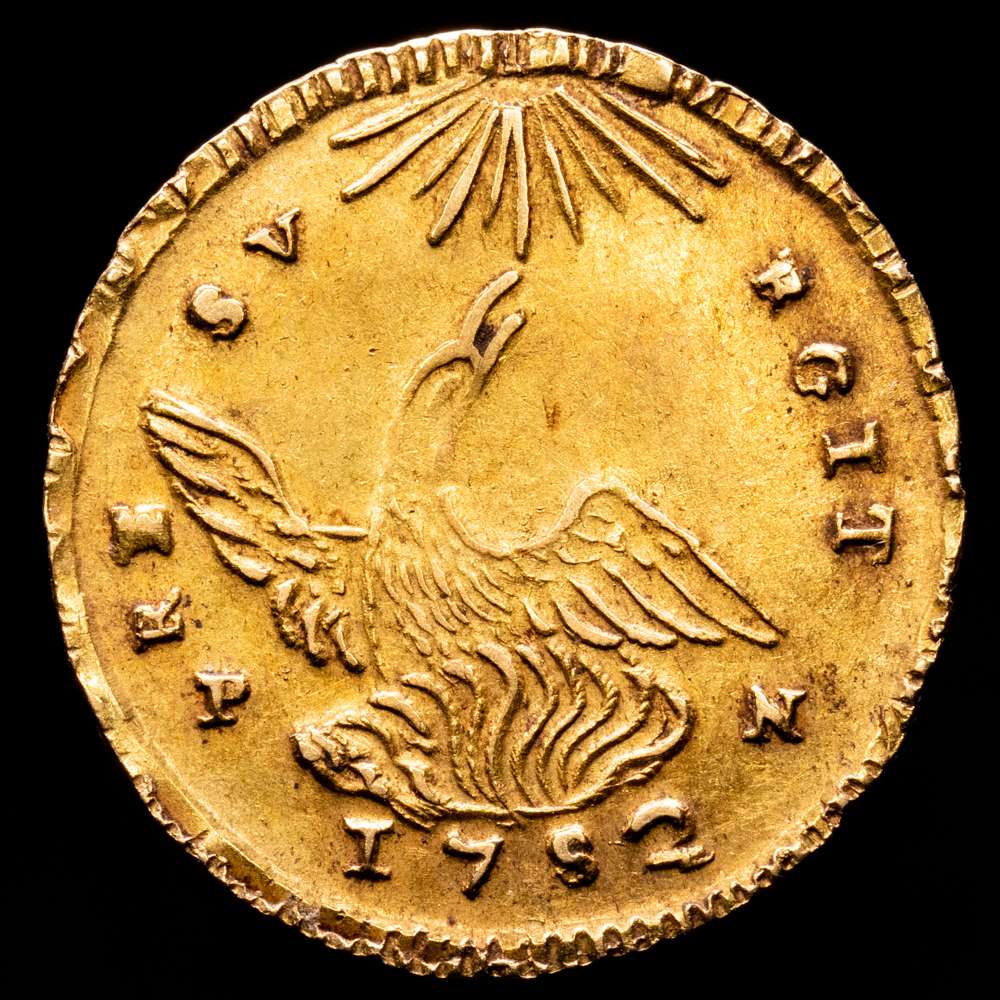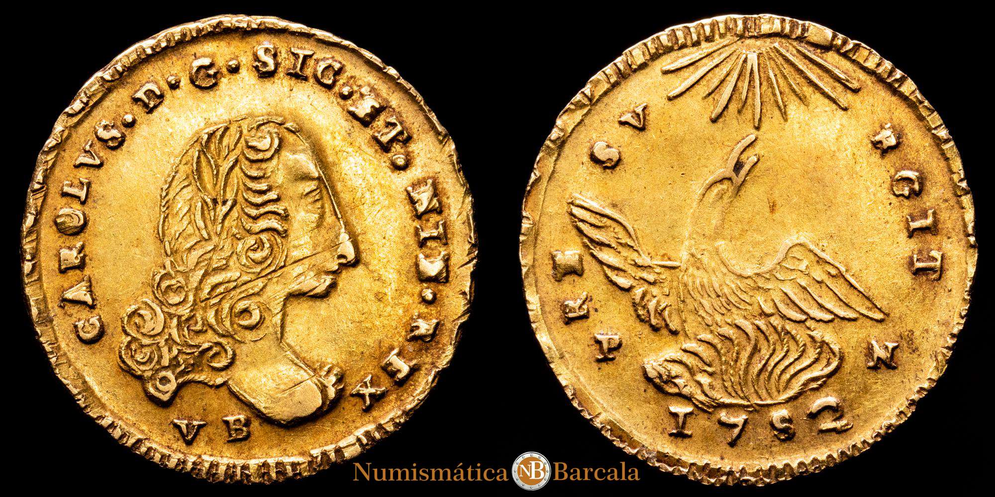 Numismática Barcala > Productos > CARLOS III. Oncia. 1752. Palermo. VB debajo del busto. PN bajo alas de fénix. UA 4,42 g. 2,23 milímetros. Spahr-81; MIR-567/4. Líneas de ajuste. EBC.