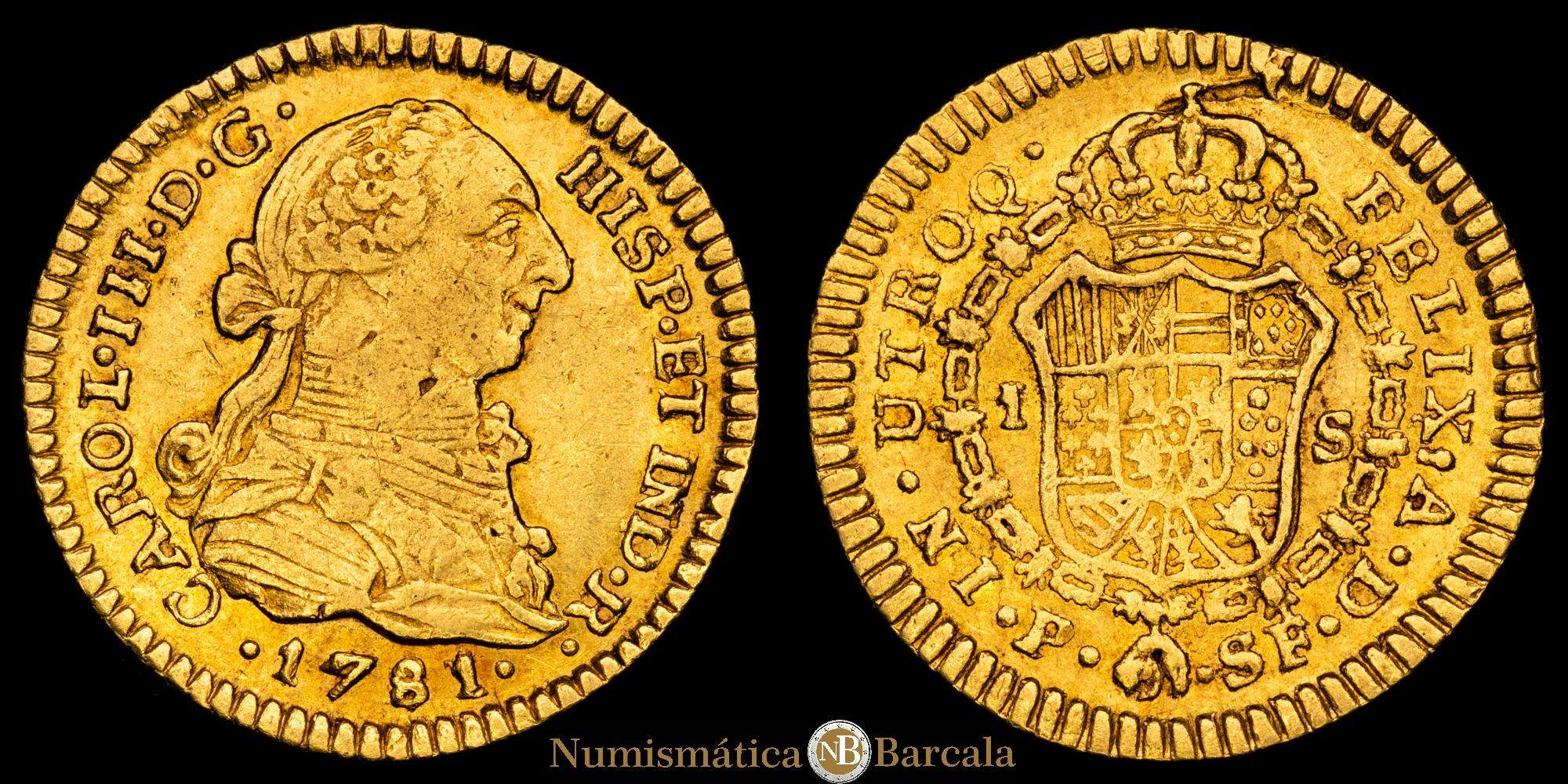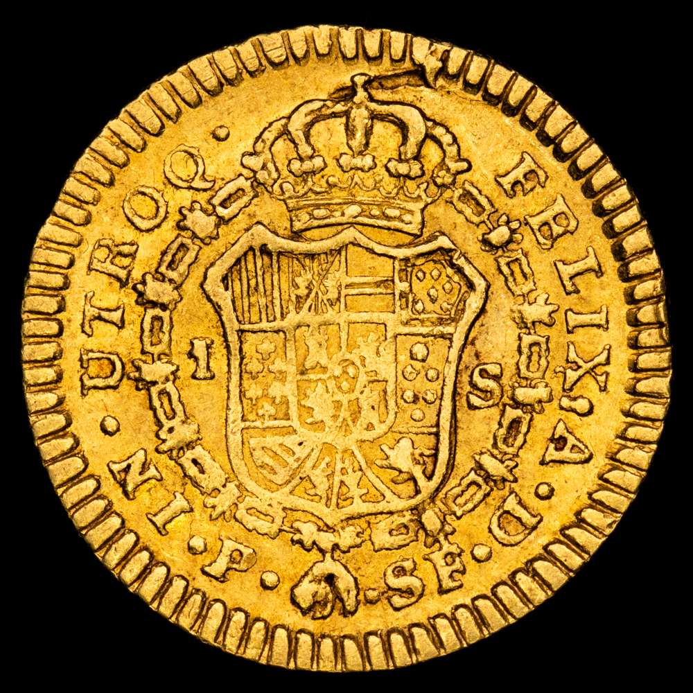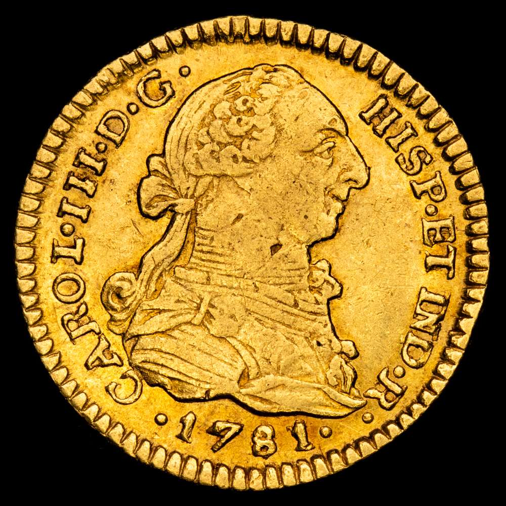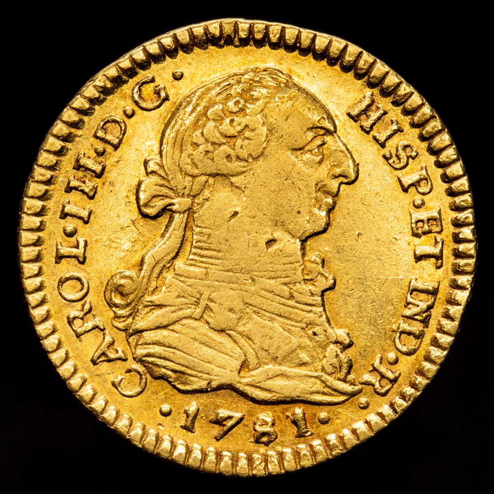 Carlos III. Popayán. 1 escudo. 1781 parece sobre 77 u 87, discutible el dígito de las decenas. SF. (AC. 1426) (Restrepo 54-21). Pequeñas laminaciones insignificantes. 3,37 gramos. VF+.