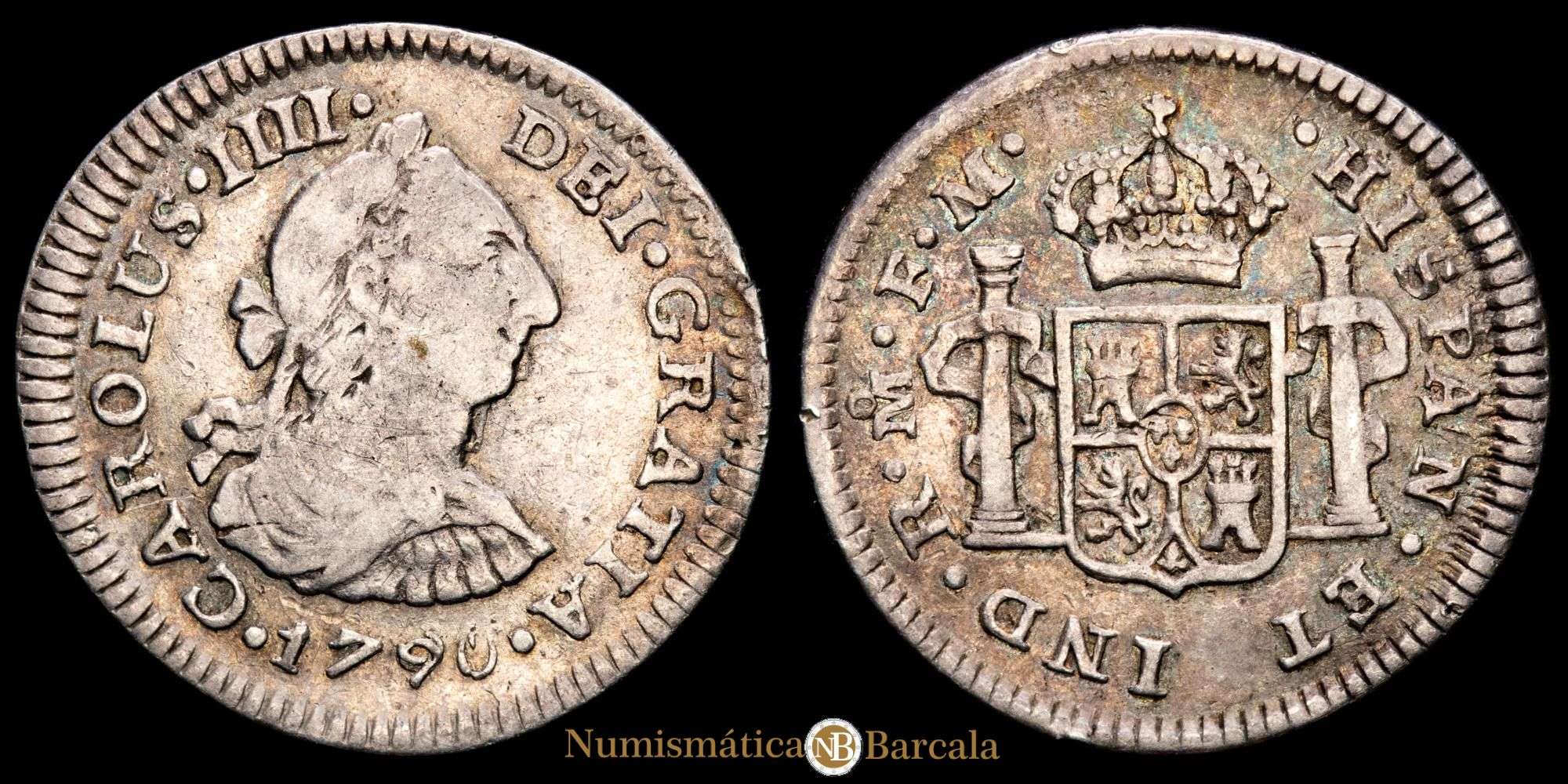 Numismática Barcala > Productos > Carlos IIII. 1/2 Real. (1,69g.). México. 1790. Ensyador F·M. AC-273. MBC+. Rara. Busto de Carlos III-IV Ordinal