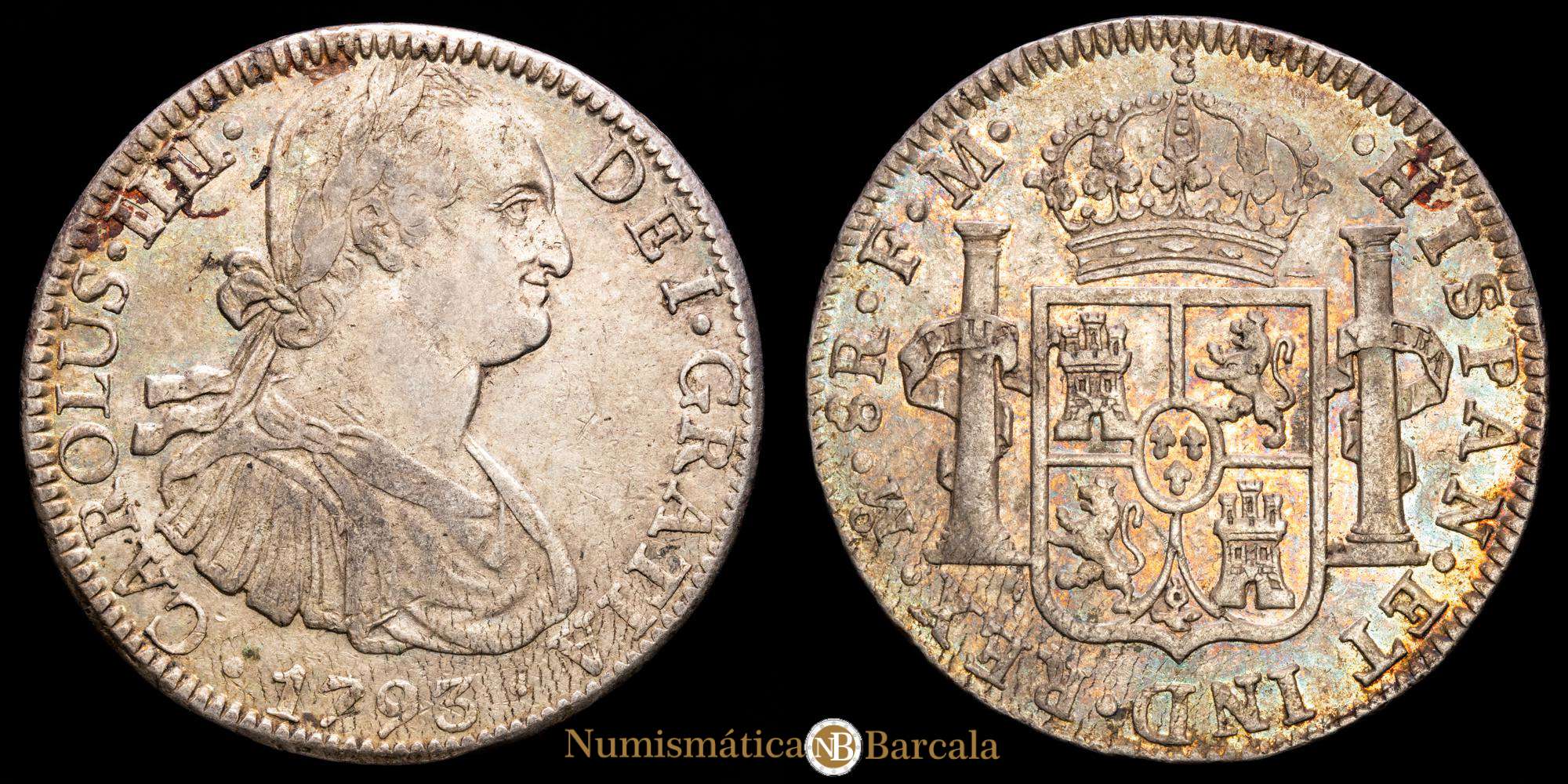 Numismática Barcala > Productos > Carlos IIII. 8 reales (26,97 g.). México. 1793. Ensayador F·M. AC-955. EBC-