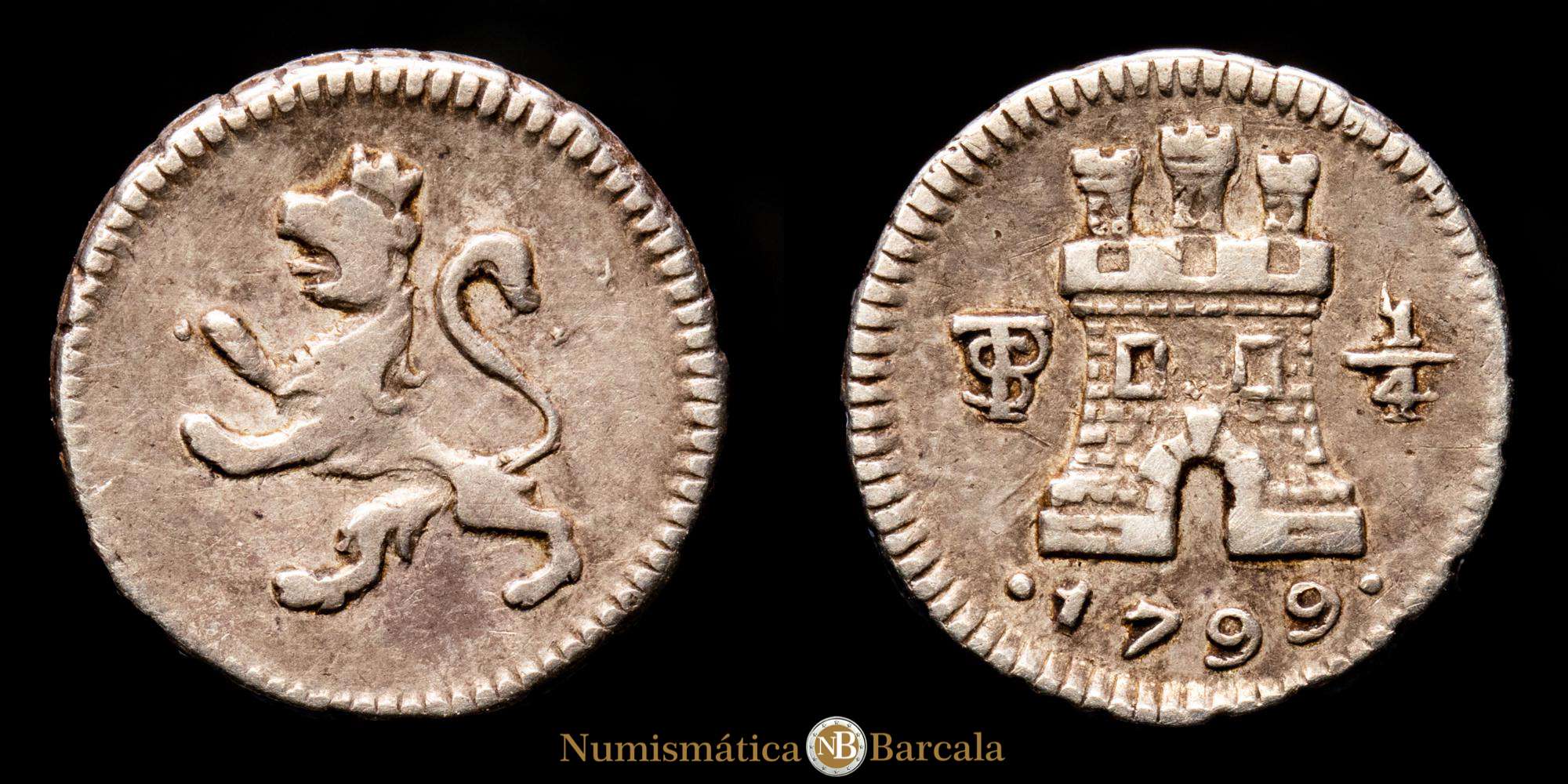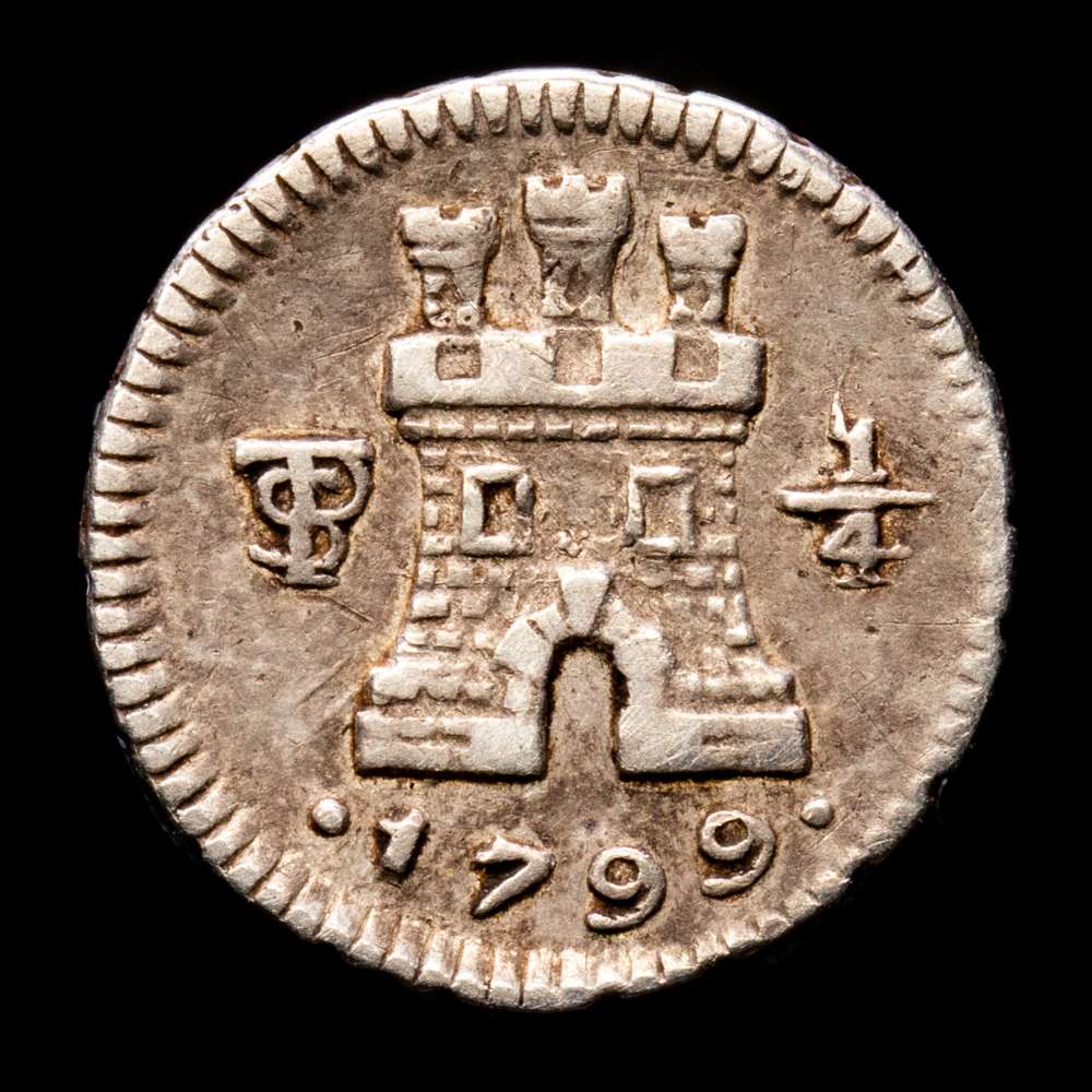 Numismática Barcala > Productos > Carlos IV. 1/4 Real. (0,82 g.). Potosí. 1799. Aureo y Calicó-147. MBC+. Bella, escasa así.