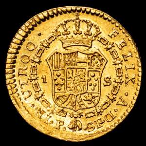 Numismática Barcala > Productos > Carlos IV. 1 Escudo. 1789/8. POPAYÁN. S.F. 3,32 grs. AC-1144. Busto de Carlos III, Ordinal IV sobre III. Brillo original. Rara y más así. EBC-.