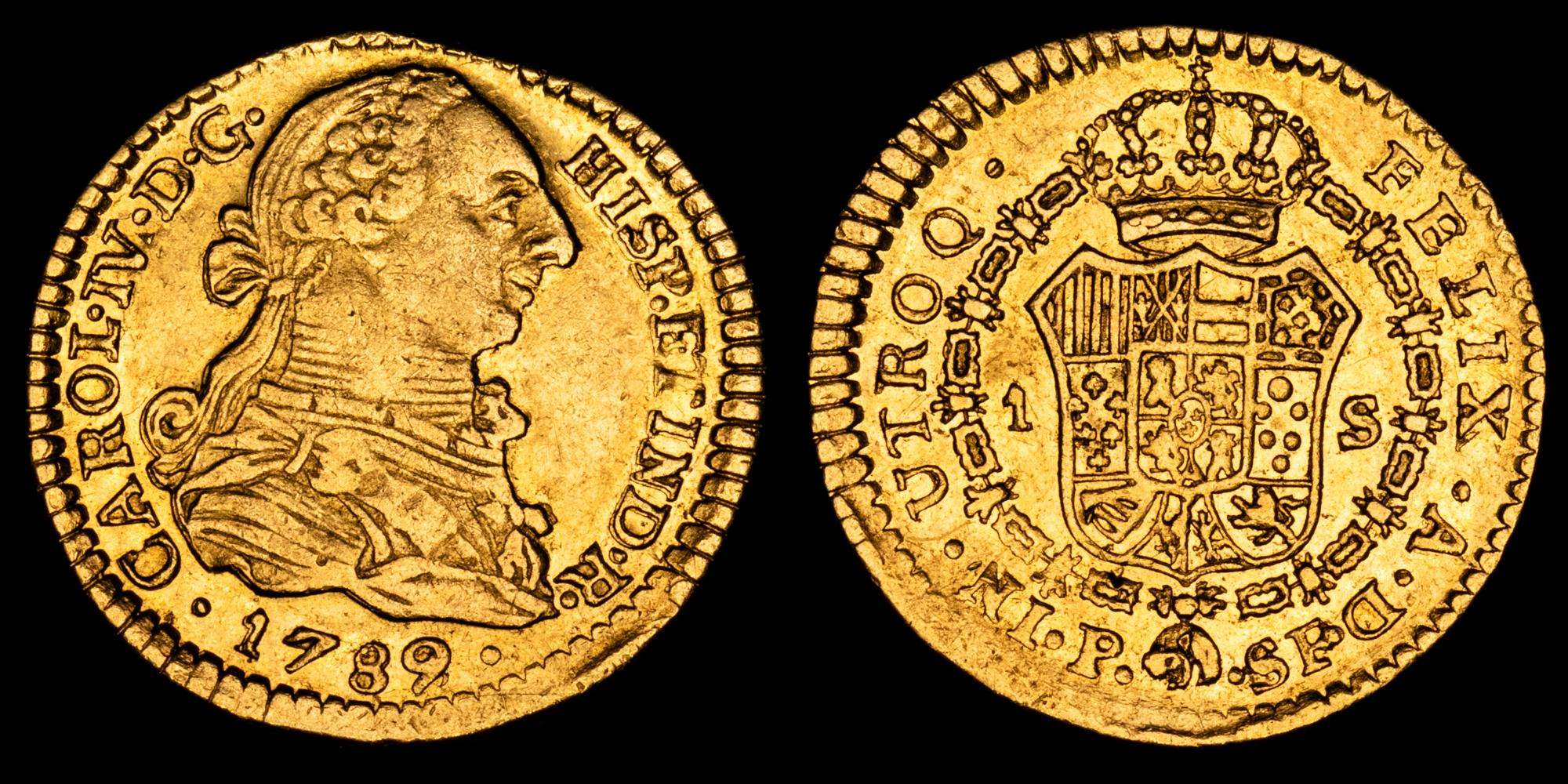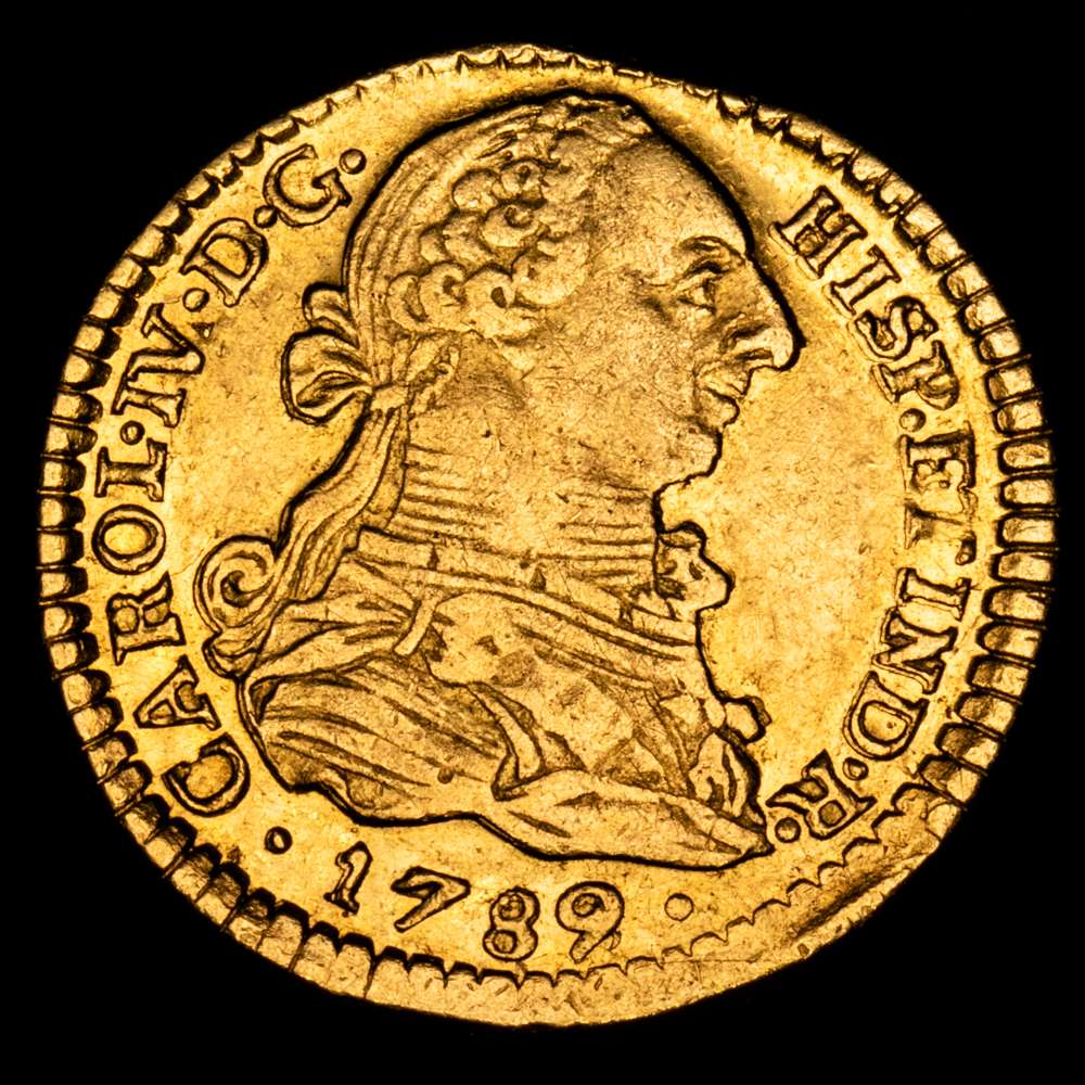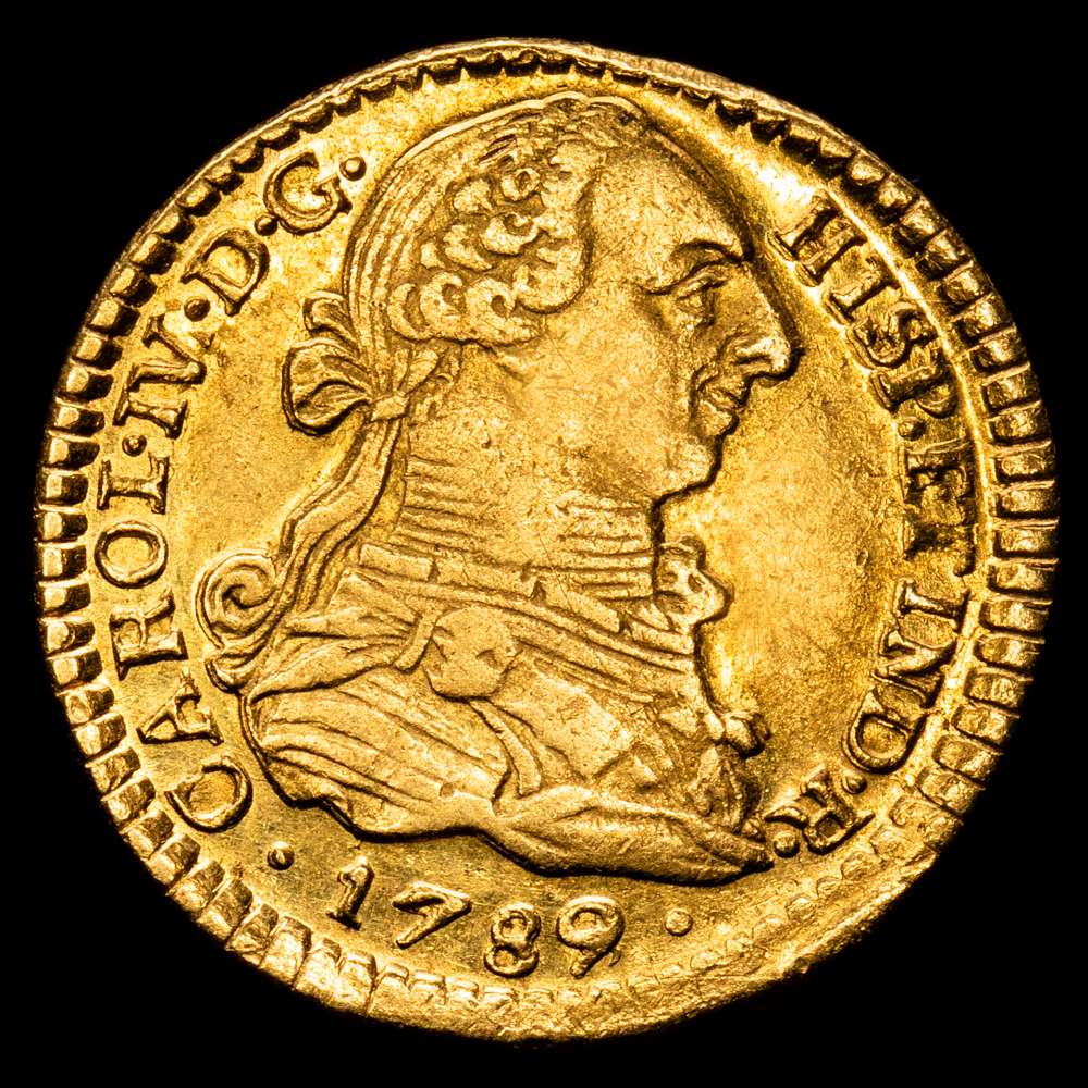 Numismática Barcala > Productos > Carlos IV. 1 Escudo. 1789/8. POPAYÁN. S.F. 3,32 grs. AC-1144. Busto de Carlos III, Ordinal IV sobre III. Brillo original. Rara y más así. EBC-.