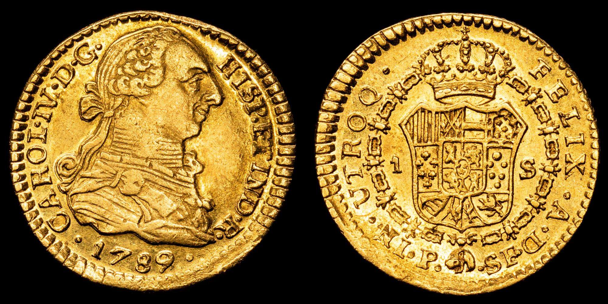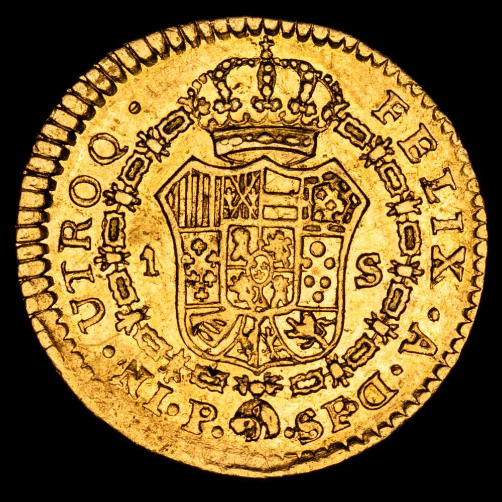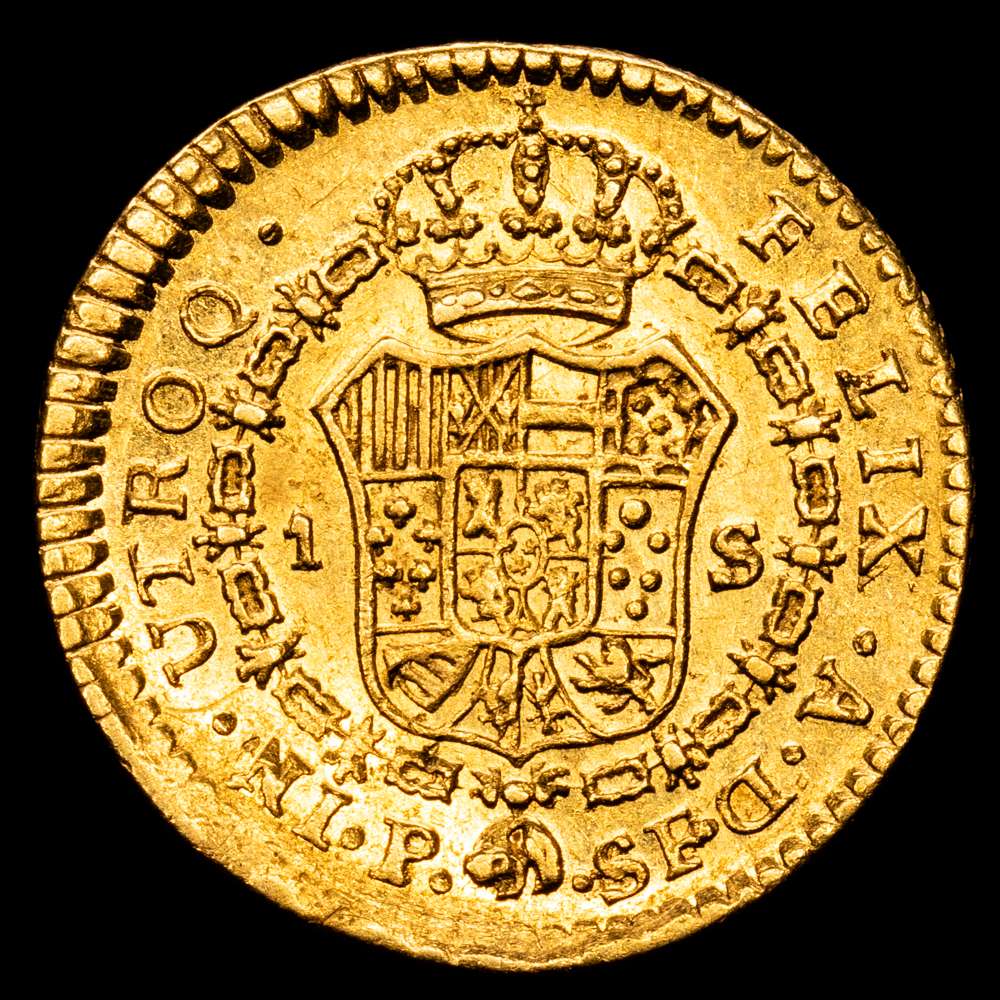 Numismática Barcala > Productos > Carlos IV. 1 Escudo. 1789/8. POPAYÁN. S.F. 3,32 grs. AC-1144. Busto de Carlos III, Ordinal IV sobre III. Brillo original. Rara y más así. EBC-.