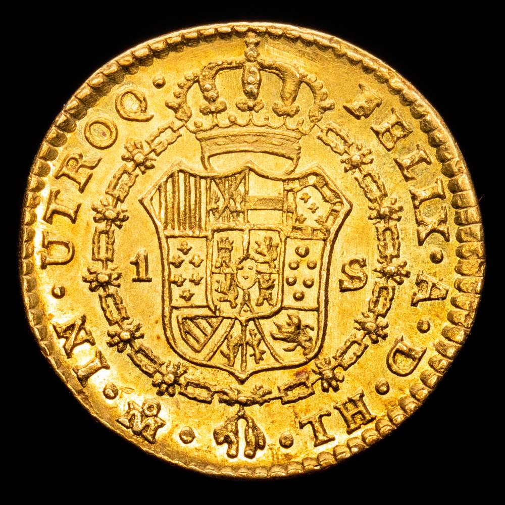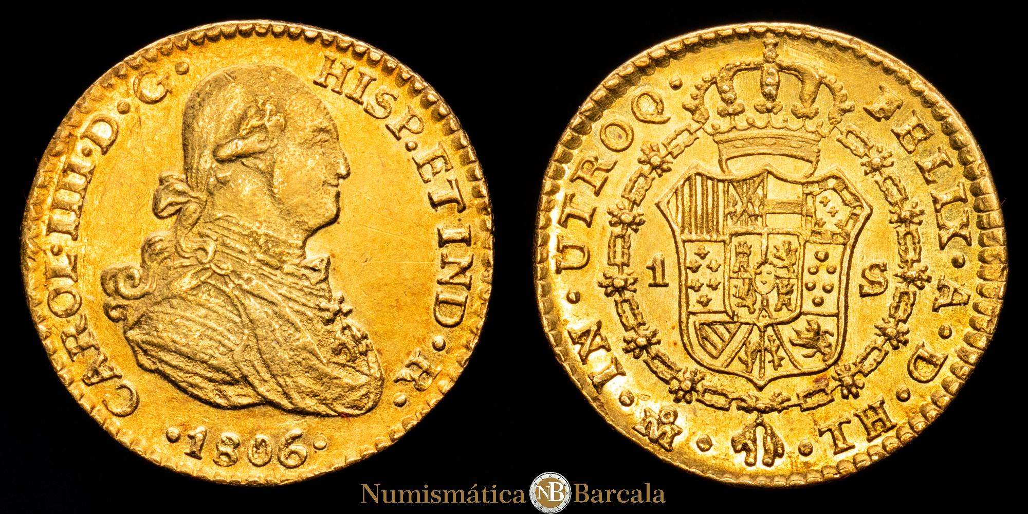 Numismática Barcala > Productos > Carlos IV (1788-1808). 1 escudo. 1806/5. México. TH. (Cal-1141). Au. 3,37 gramos. Sobrefecha. UNC-. Muy rara. Bello color.